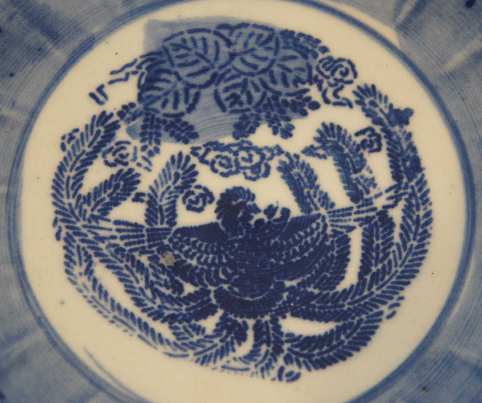 Antique turn of the century flow blue Chinese porcelain bowl with scalloped edge, decorated with figures in a forest around a phoenix center.