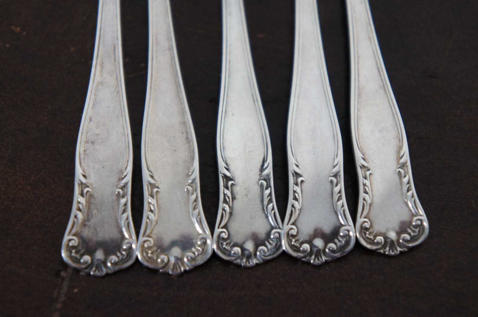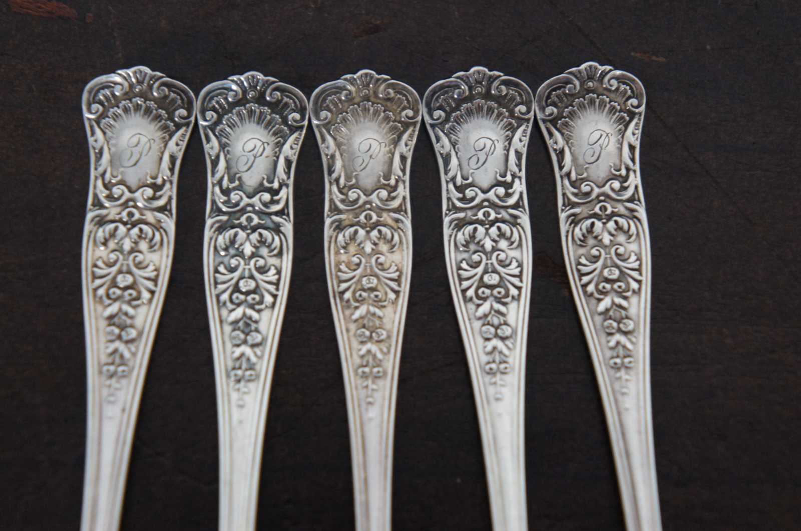 Set of 5 antique Gorham sterling silver cocktail or fish forks with floral and scallop shell pattern, engraved with a monogram “P.”
