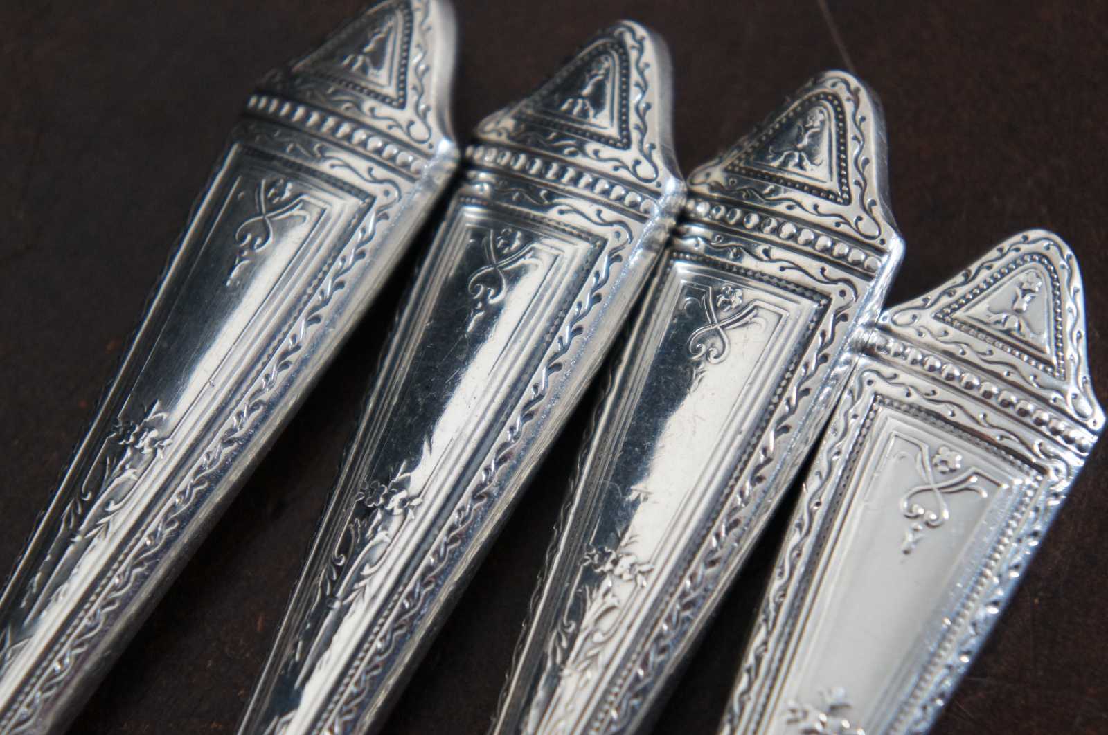 Set of four sterling silver handled serving pieces, two forks and two slotted spoons.