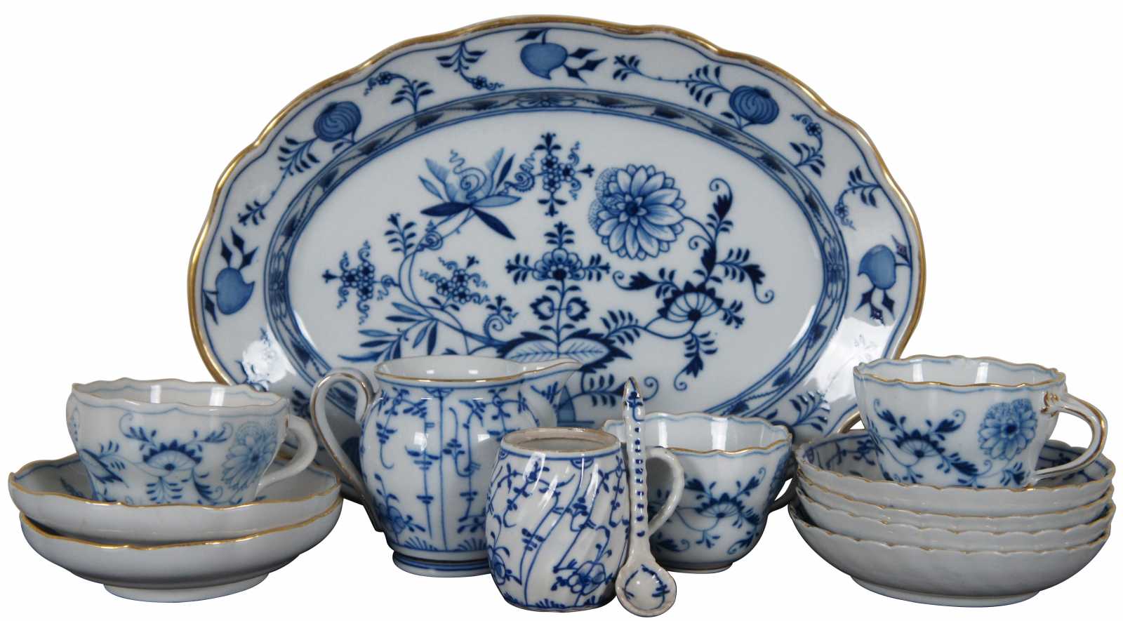 Lot of thirteen 19th century dinnerware pieces by Meissen and Königlich privilegierte Porzellanmanufaktur Tettau, Sontag & Maisel (1879–1902), featuring blue and white Blue Onion patterns and gilded accents.