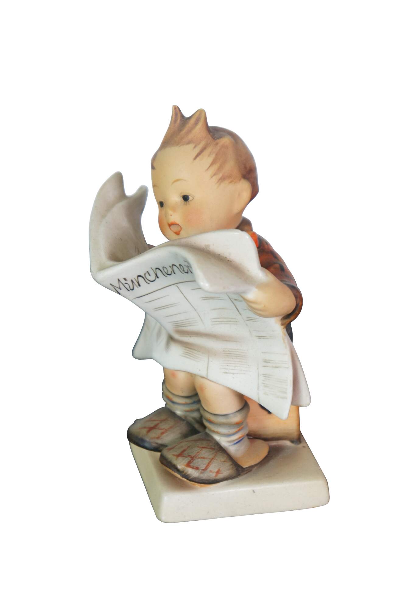 Mid 20th century Goebel / MI Hummel porcelain figurine 184 - Latest News, depicting a young boy seated on a wooden stool and reading the newspaper. Paper features the specialized title "Muchener Presse." TMK-2 Full Bee mark - Circa 1950-1955.