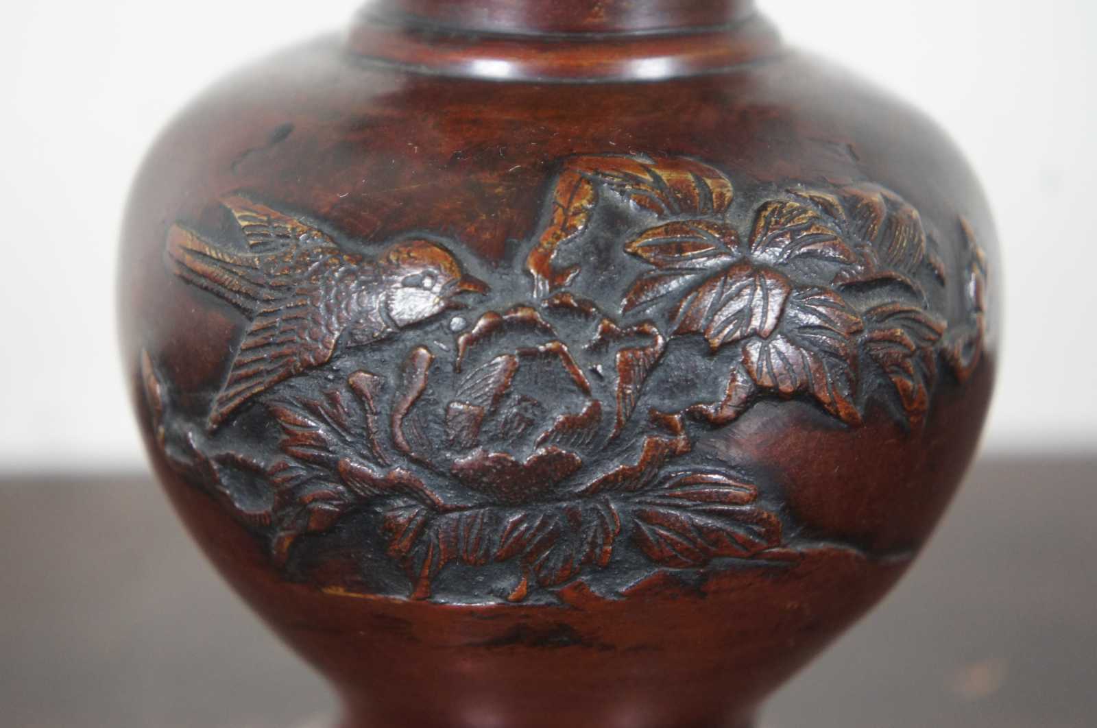 20th century brown porcelain Chinese vase, molded with scenes of bird on flowering branches, flanked with phoenix shaped handles.