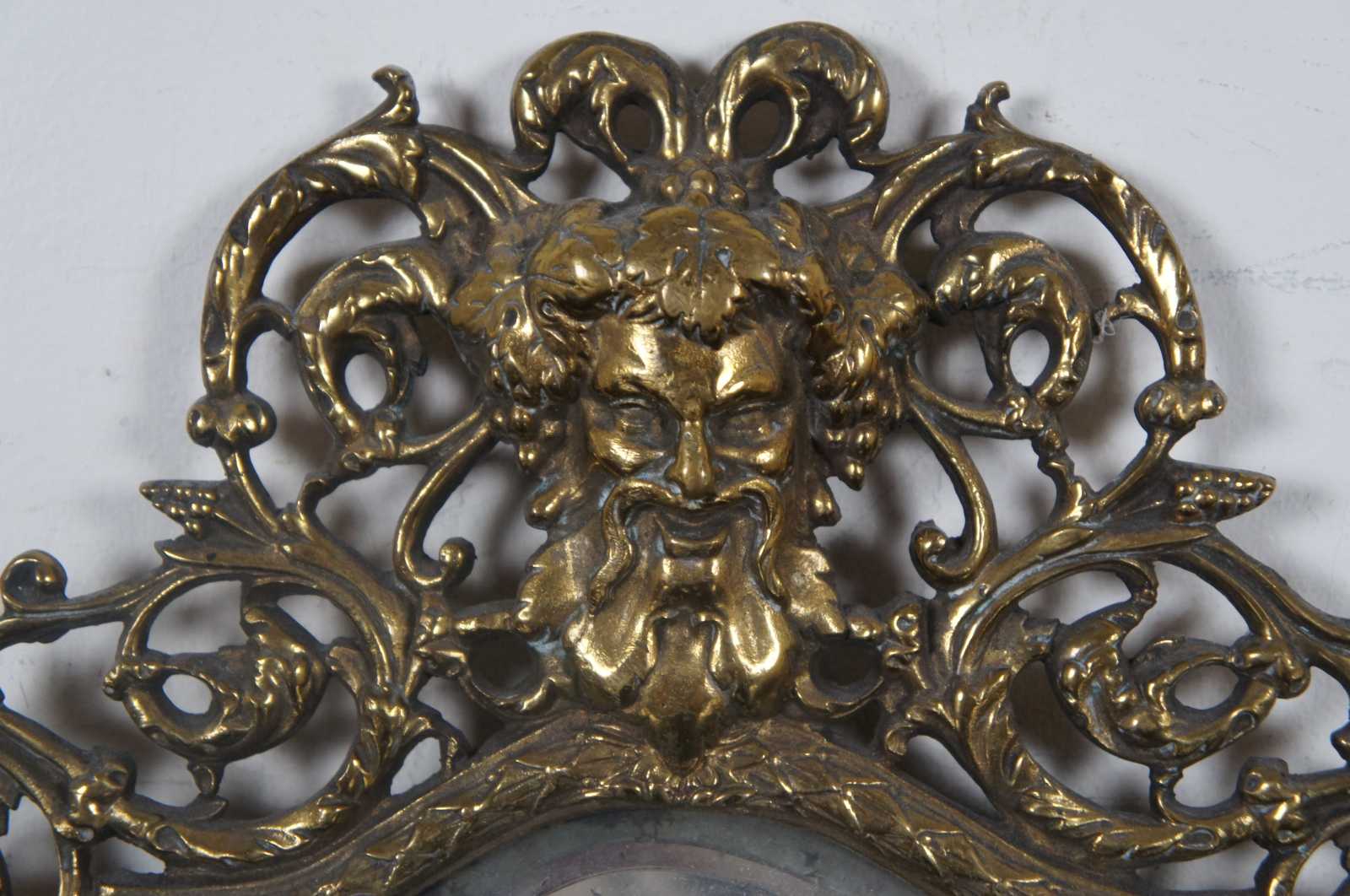 Antique gilded cast iron easel style tabletop mirror with an ornate frame of swirling leaves around the face of Bacchus or Dionysus.
