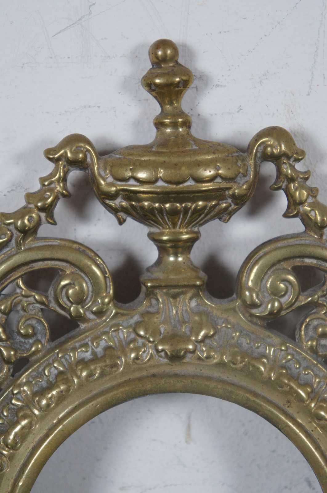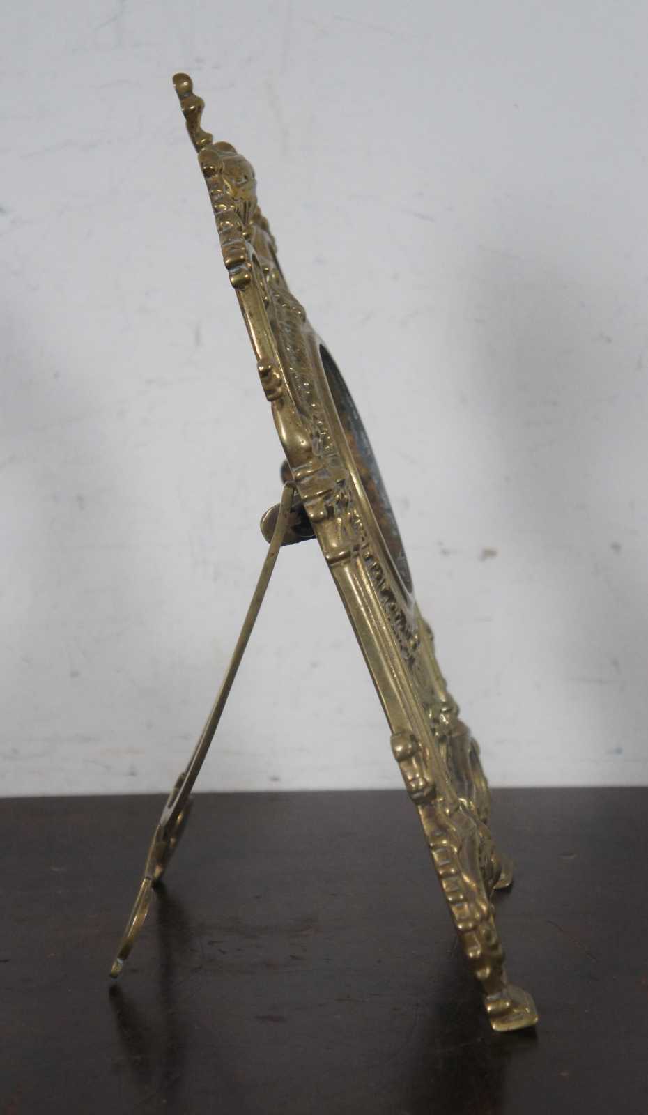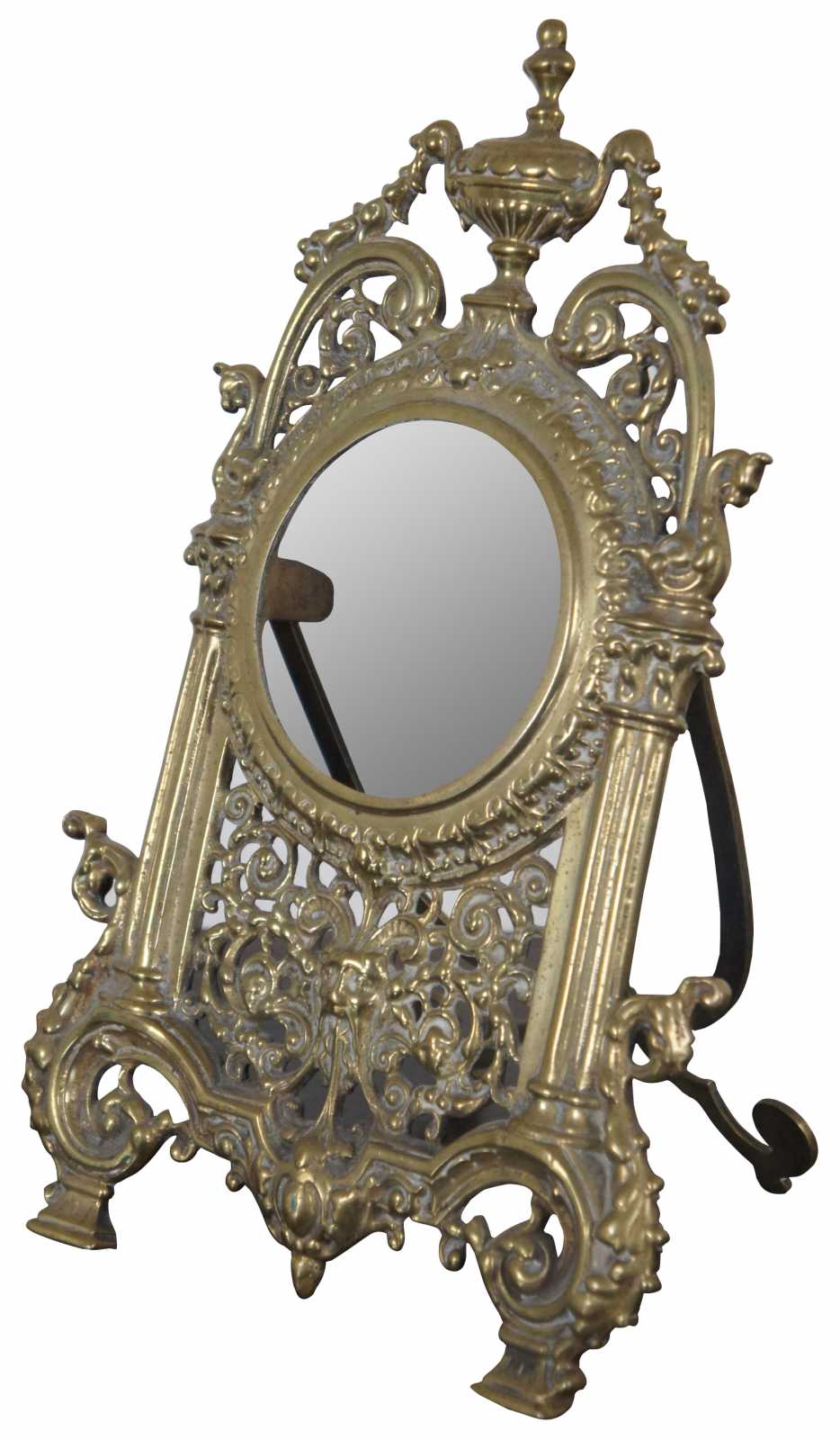 Antique brass easel style tabletop picture frame with round opening surrounded by neoclassical columns and topped with an urn, above a Green Man type face.