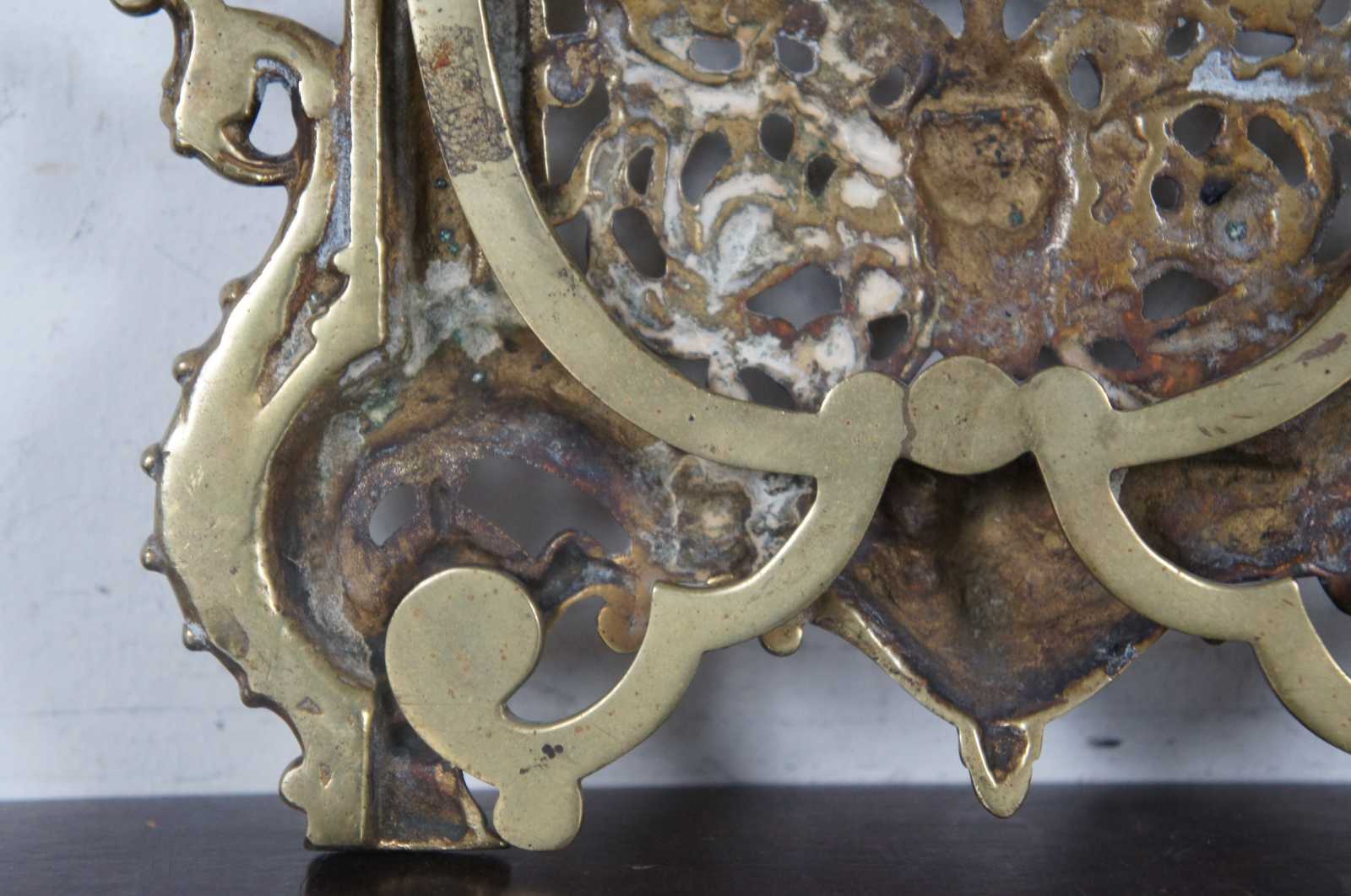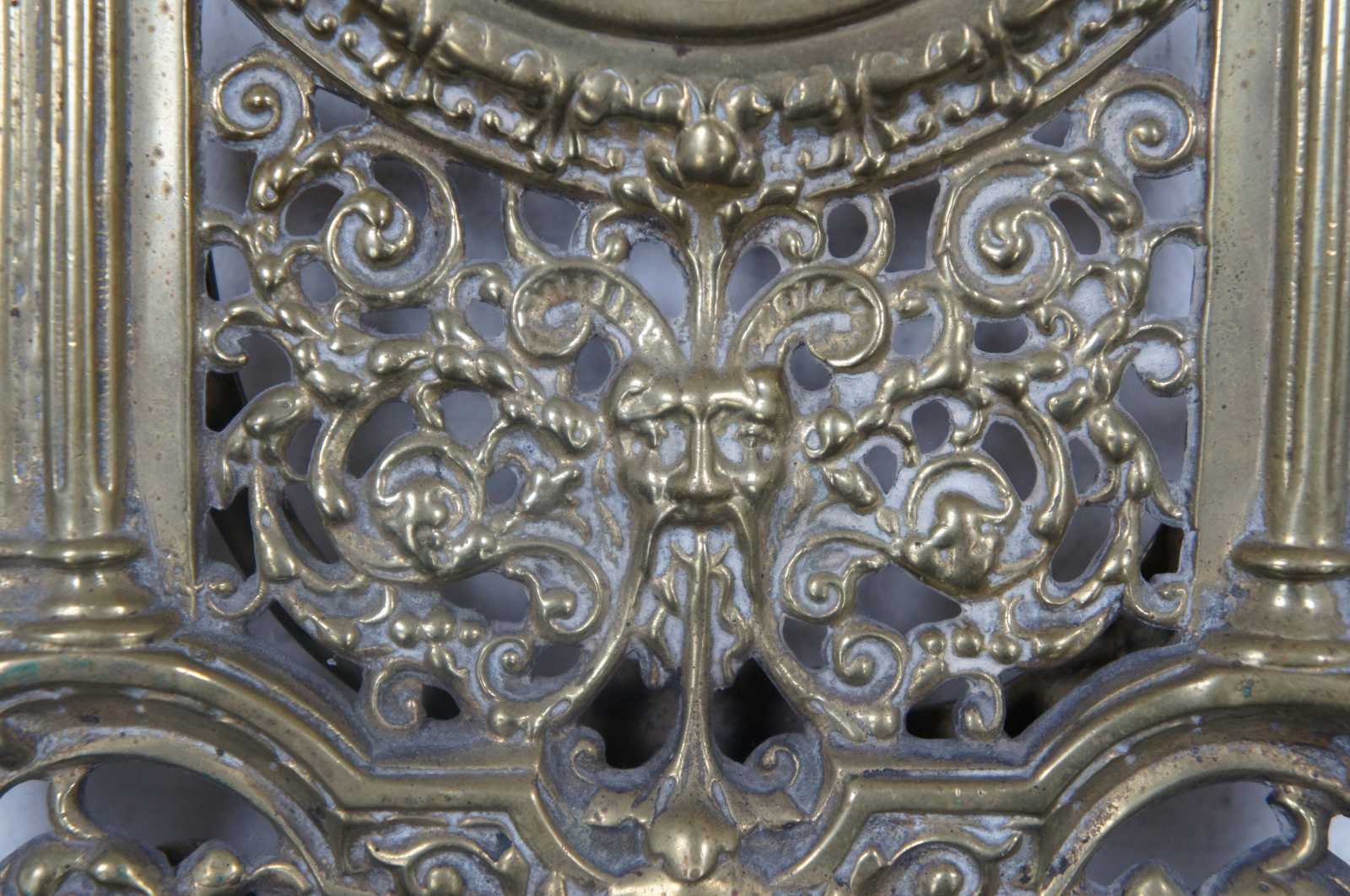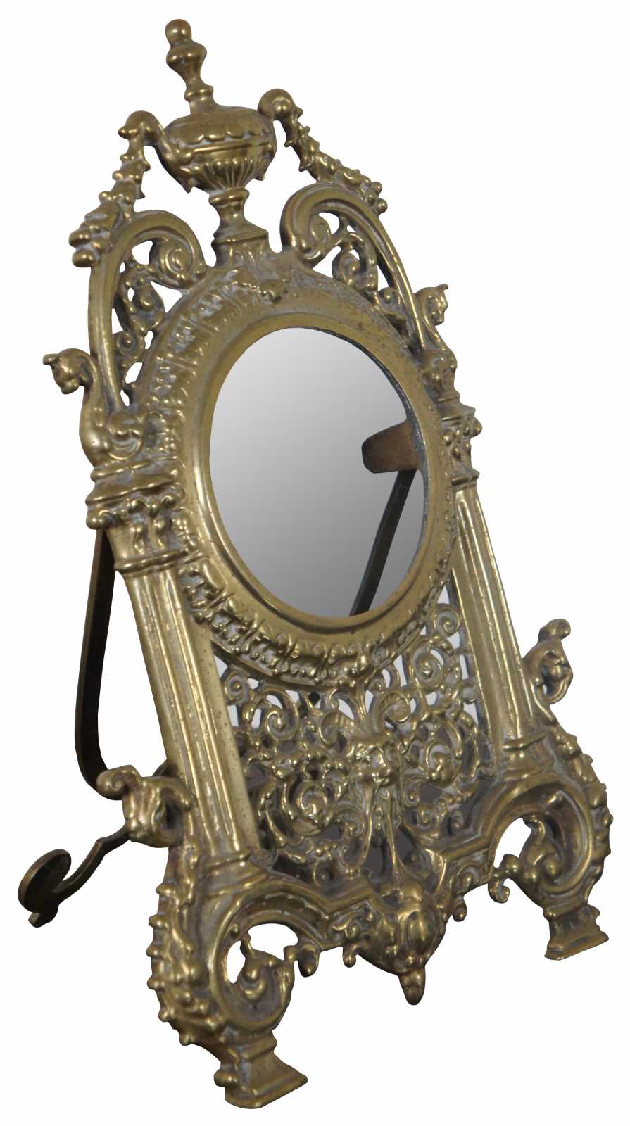 Antique brass easel style tabletop picture frame with round opening surrounded by neoclassical columns and topped with an urn, above a Green Man type face.