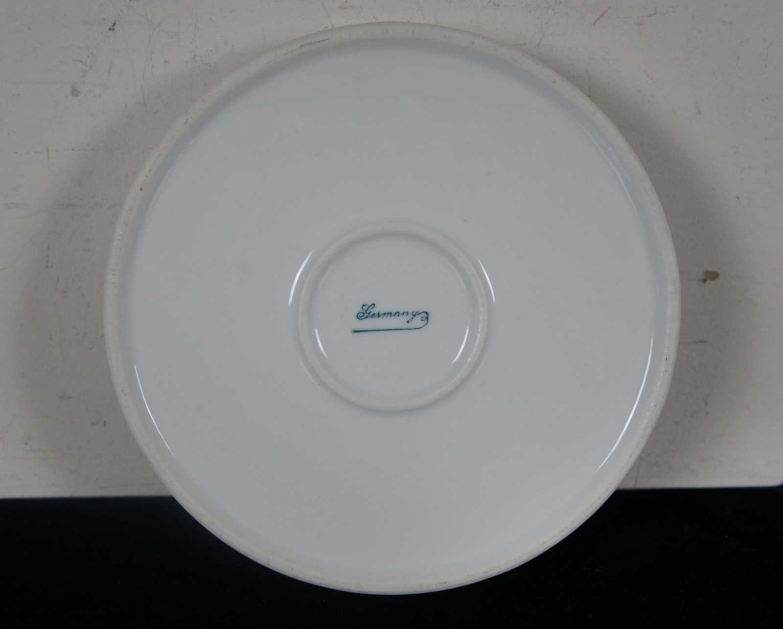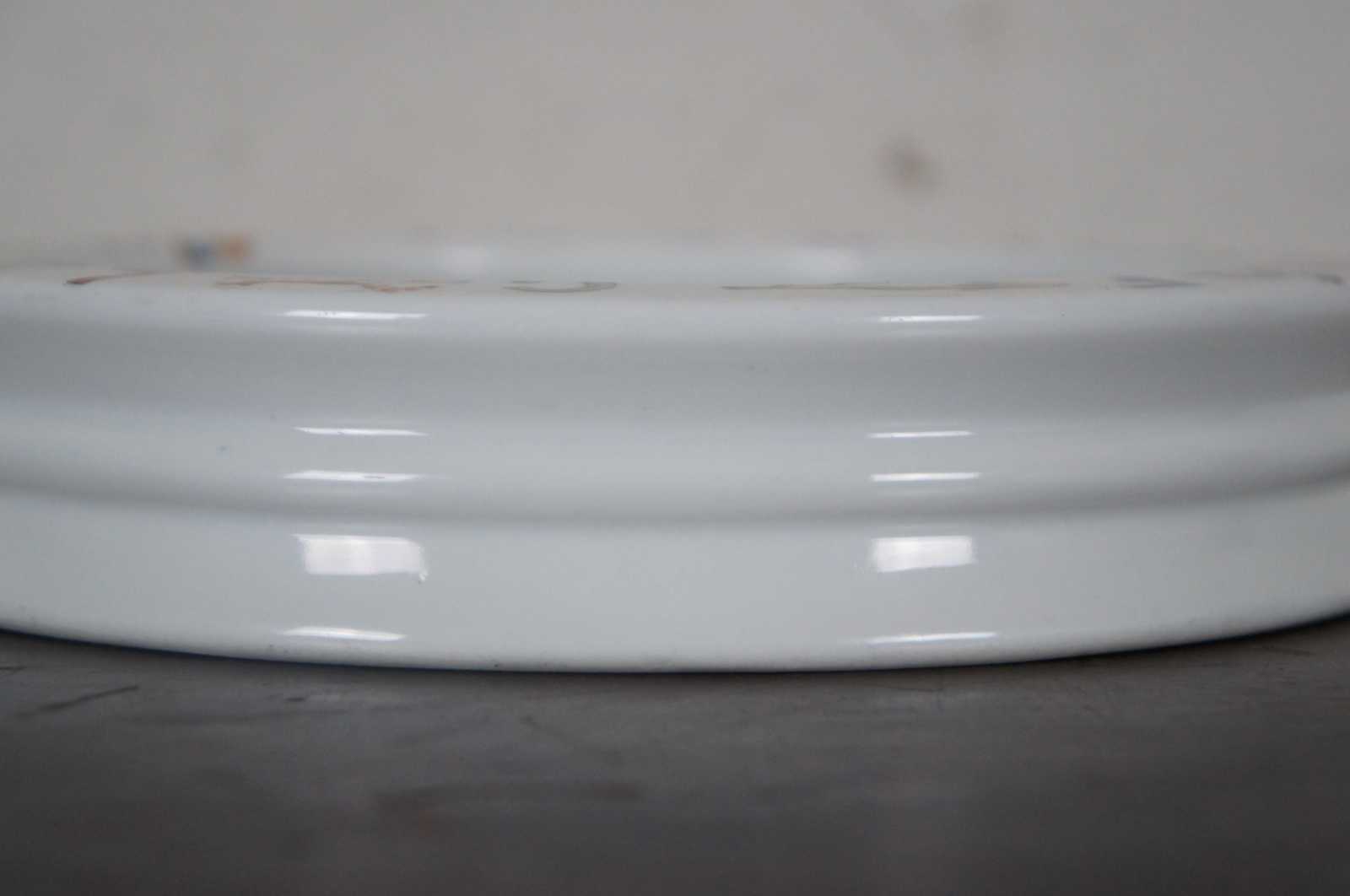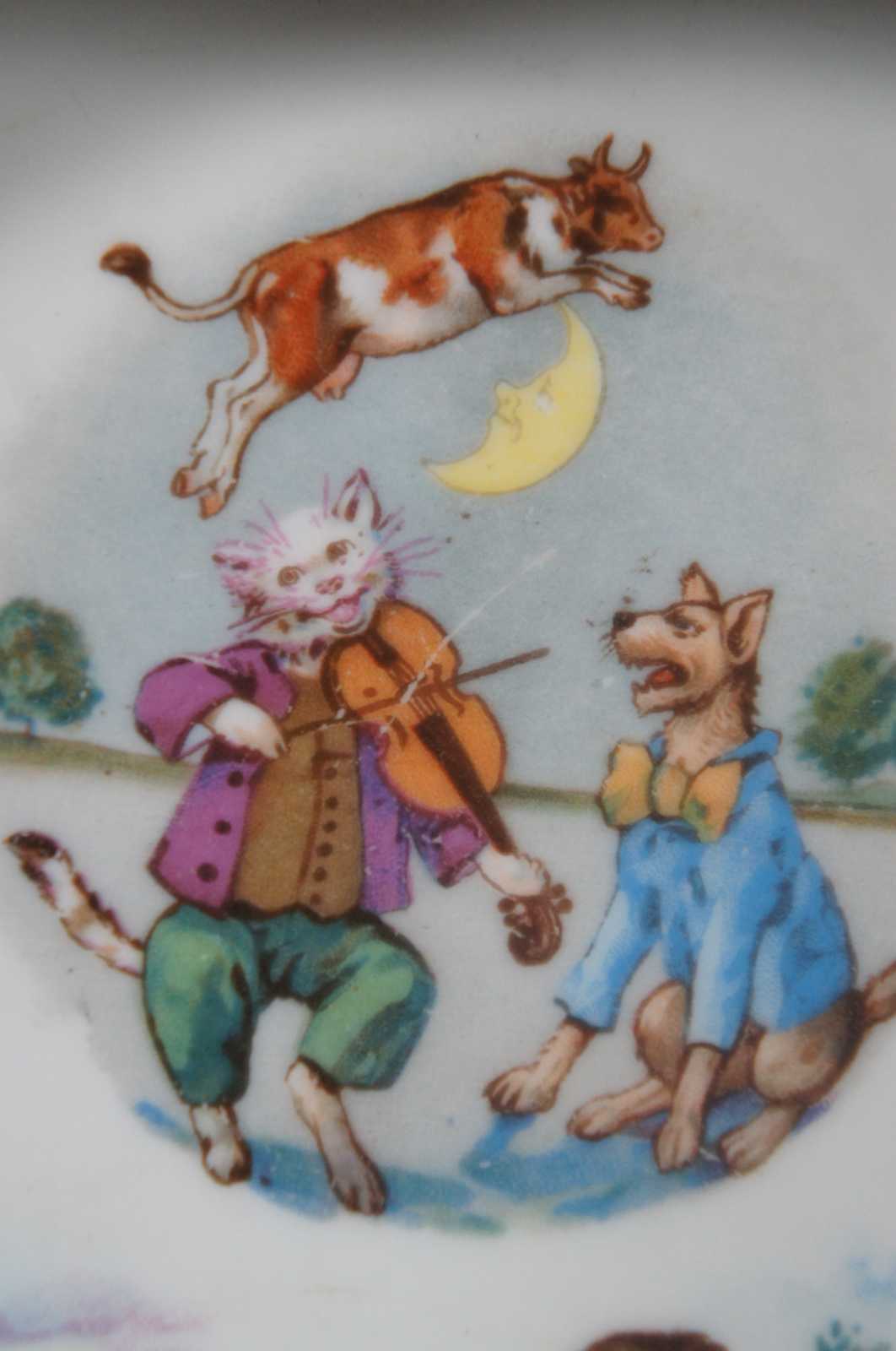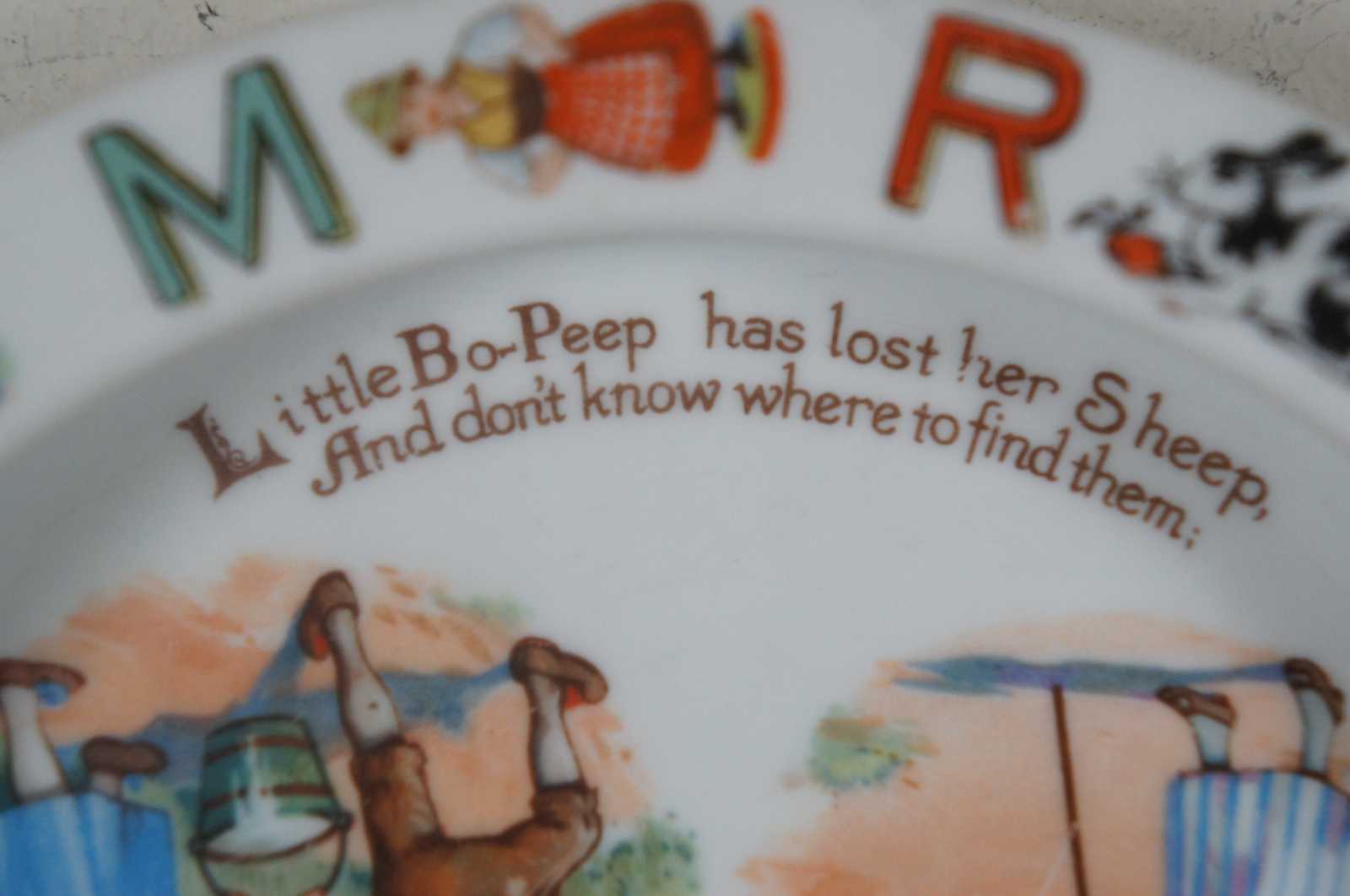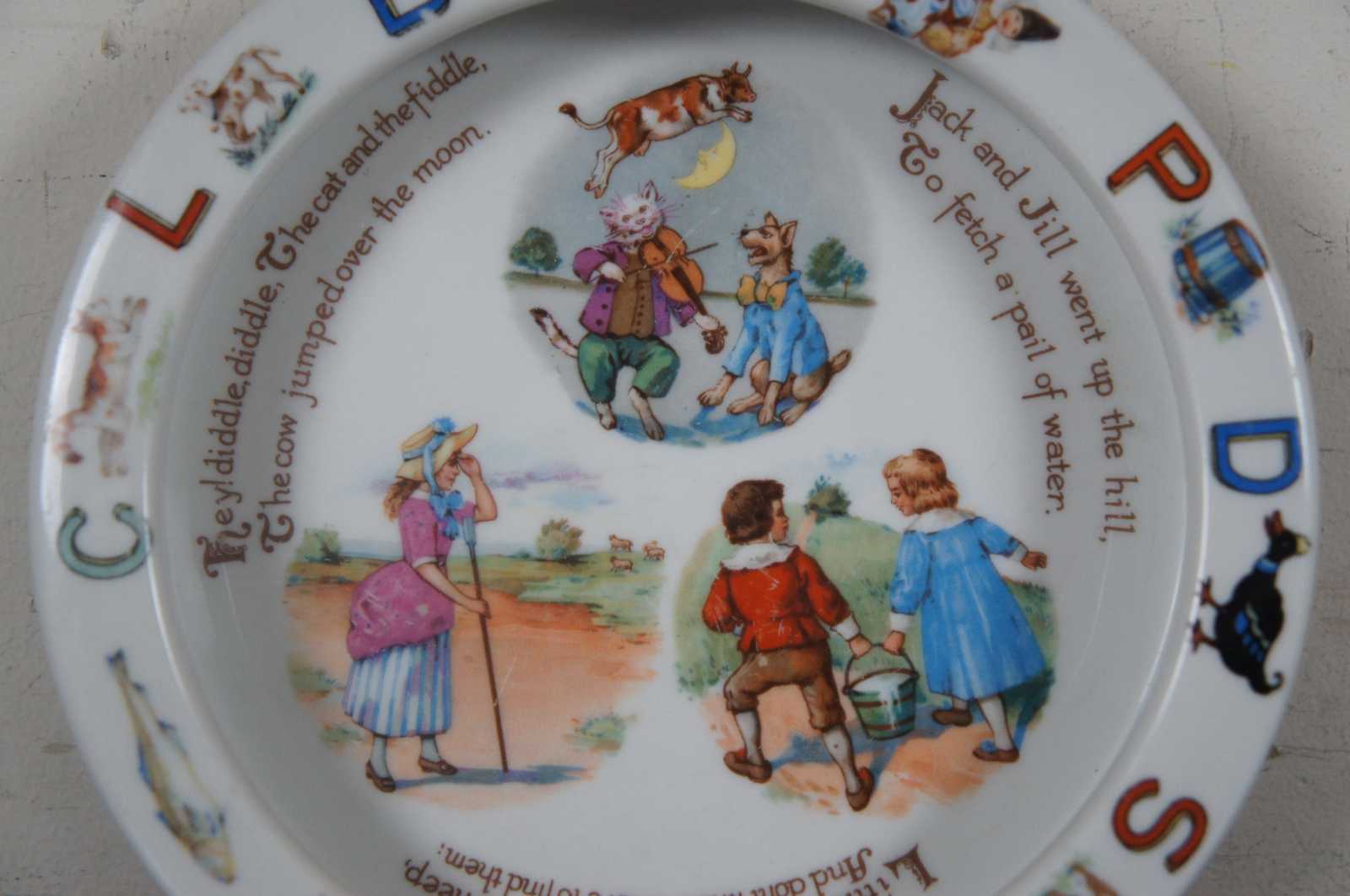 Vintage German porcelain dish bordered with an incomplete alphabet and an interior filled with partial scenes from Mary Had a Little Lamb, Jack and Jill and Hey Diddle Diddle.