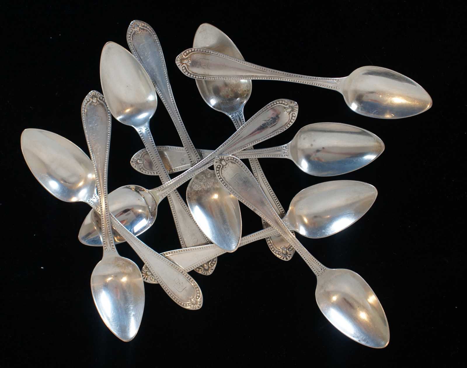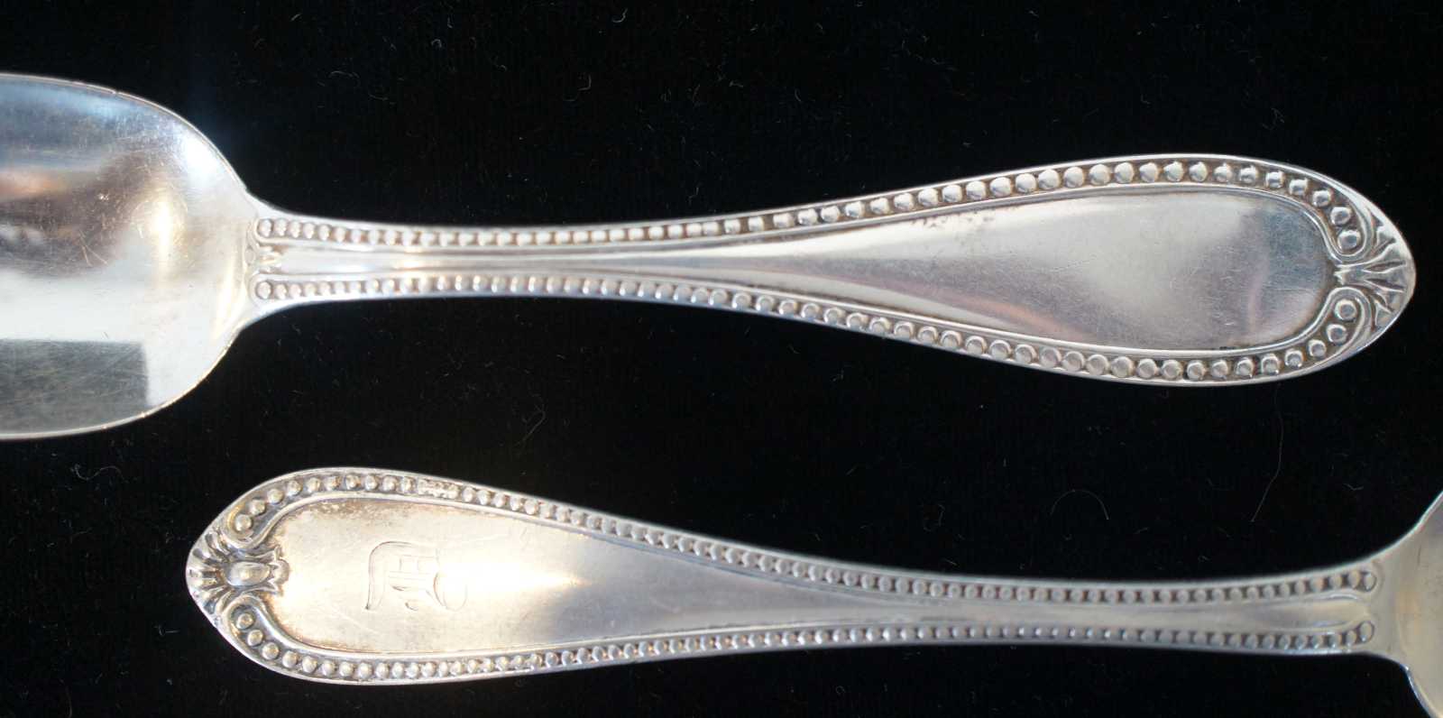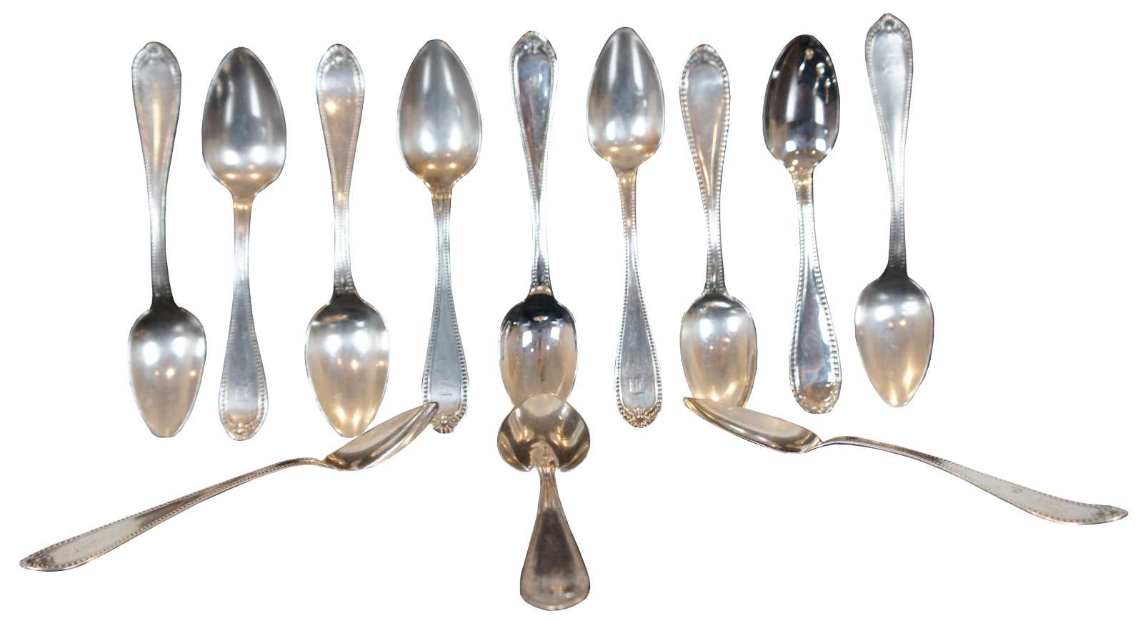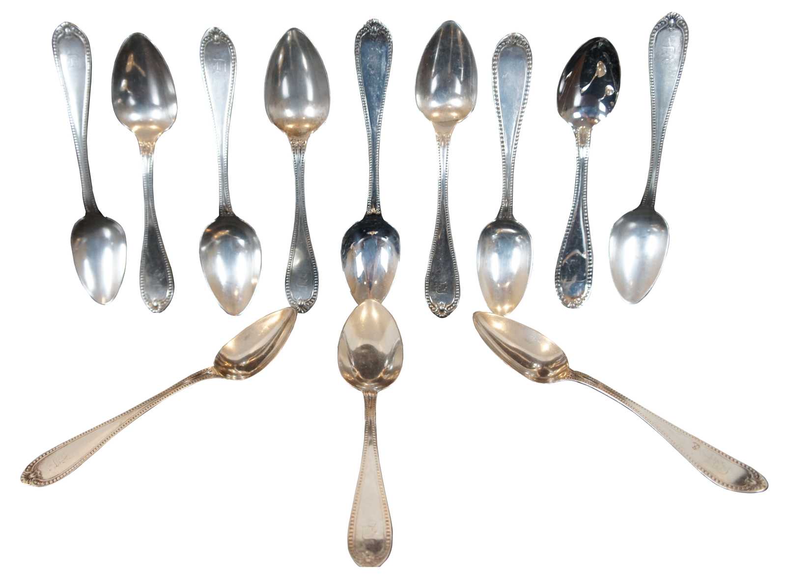 Set of twelve antique sterling silver teaspoons by JE Caldwell and JD Chase with matching beaded edge pattern and monogrammed with a D.