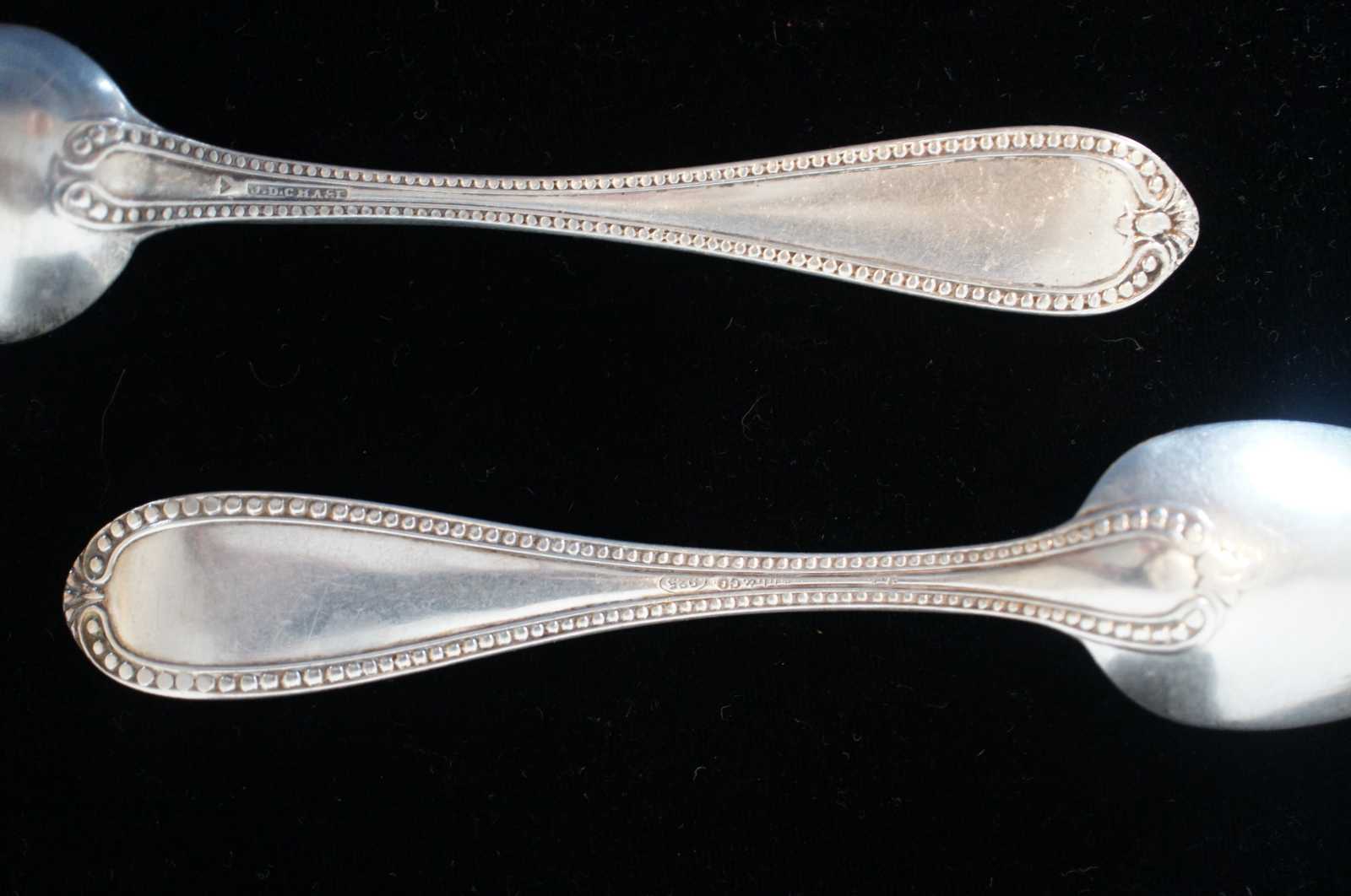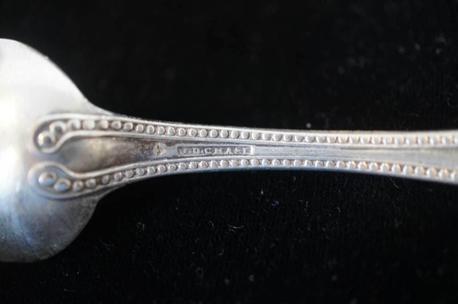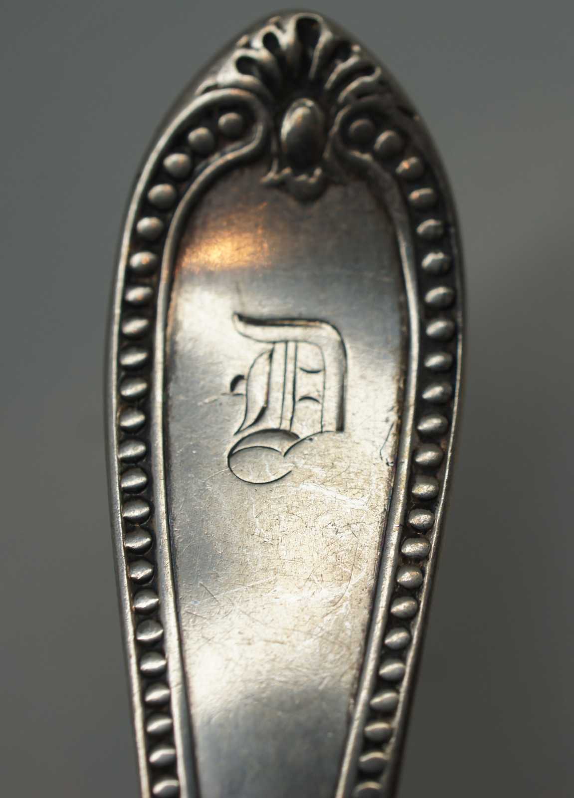 Set of twelve antique sterling silver teaspoons by JE Caldwell and JD Chase with matching beaded edge pattern and monogrammed with a D.