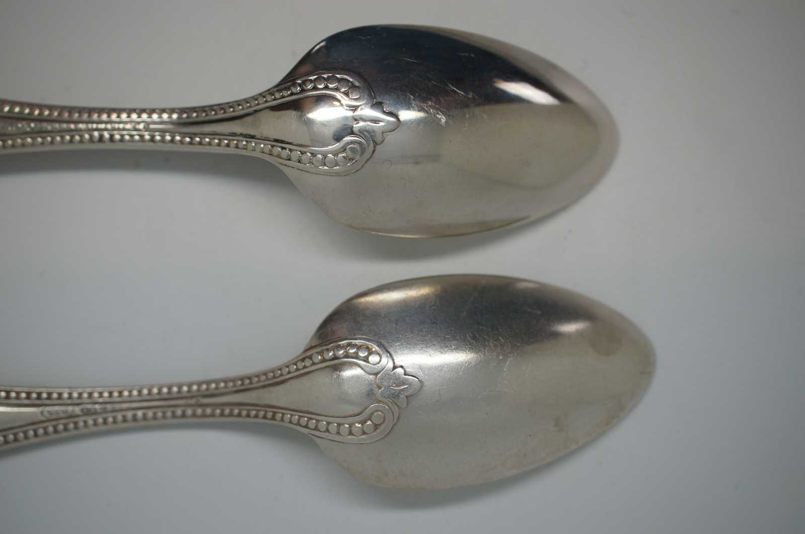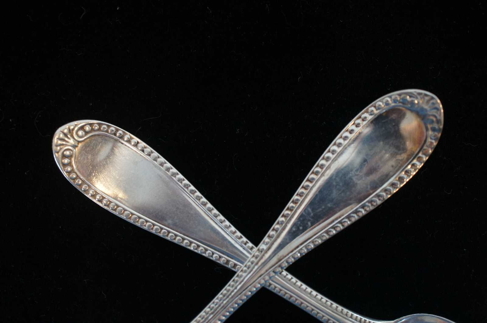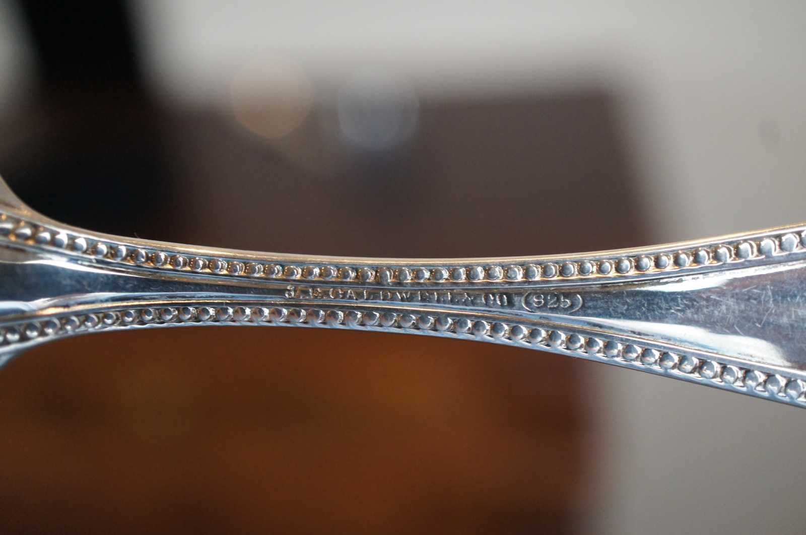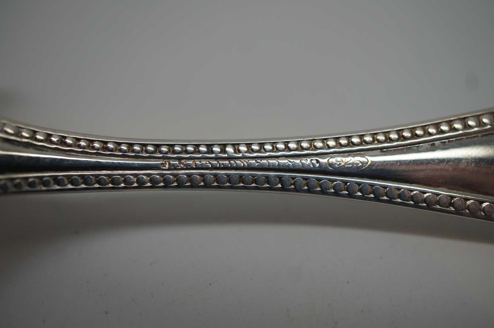 Set of twelve antique sterling silver teaspoons by JE Caldwell and JD Chase with matching beaded edge pattern and monogrammed with a D.