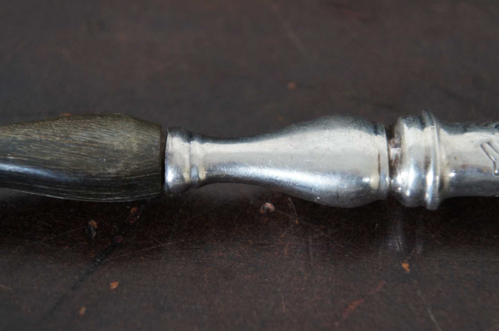 Vintage three piece salad tosser set by Fracalanza with wood tops and silver plate handles. In 1884, Angelo Fracalanza began his industrial enterprise in Sao Paulo starting with the manufacture of silver plate items. Later, the firm began to produce house ware items, reaching a high level of craftsmanship in the production of flatware, tea and coffee services in Alpaca metal