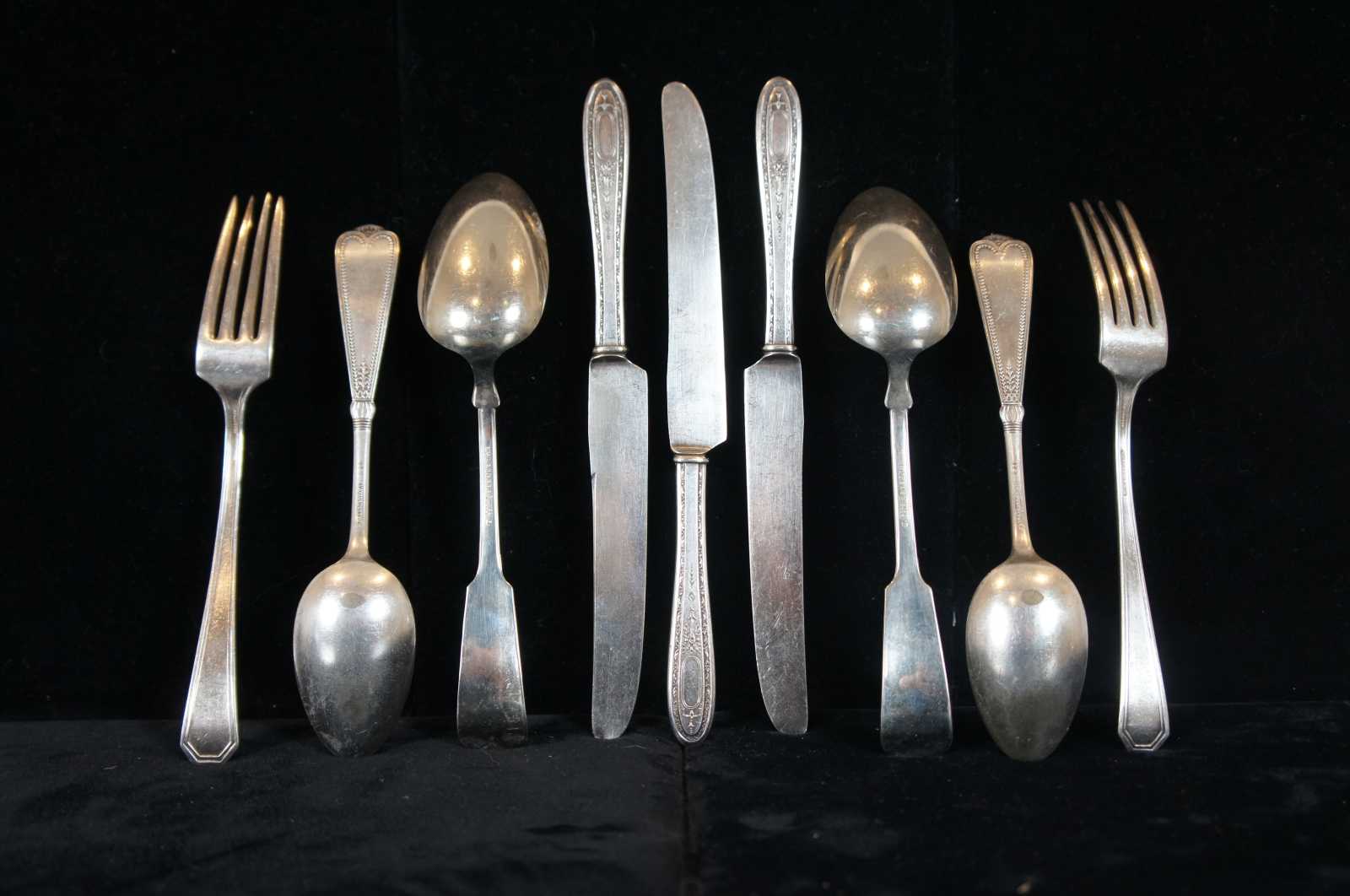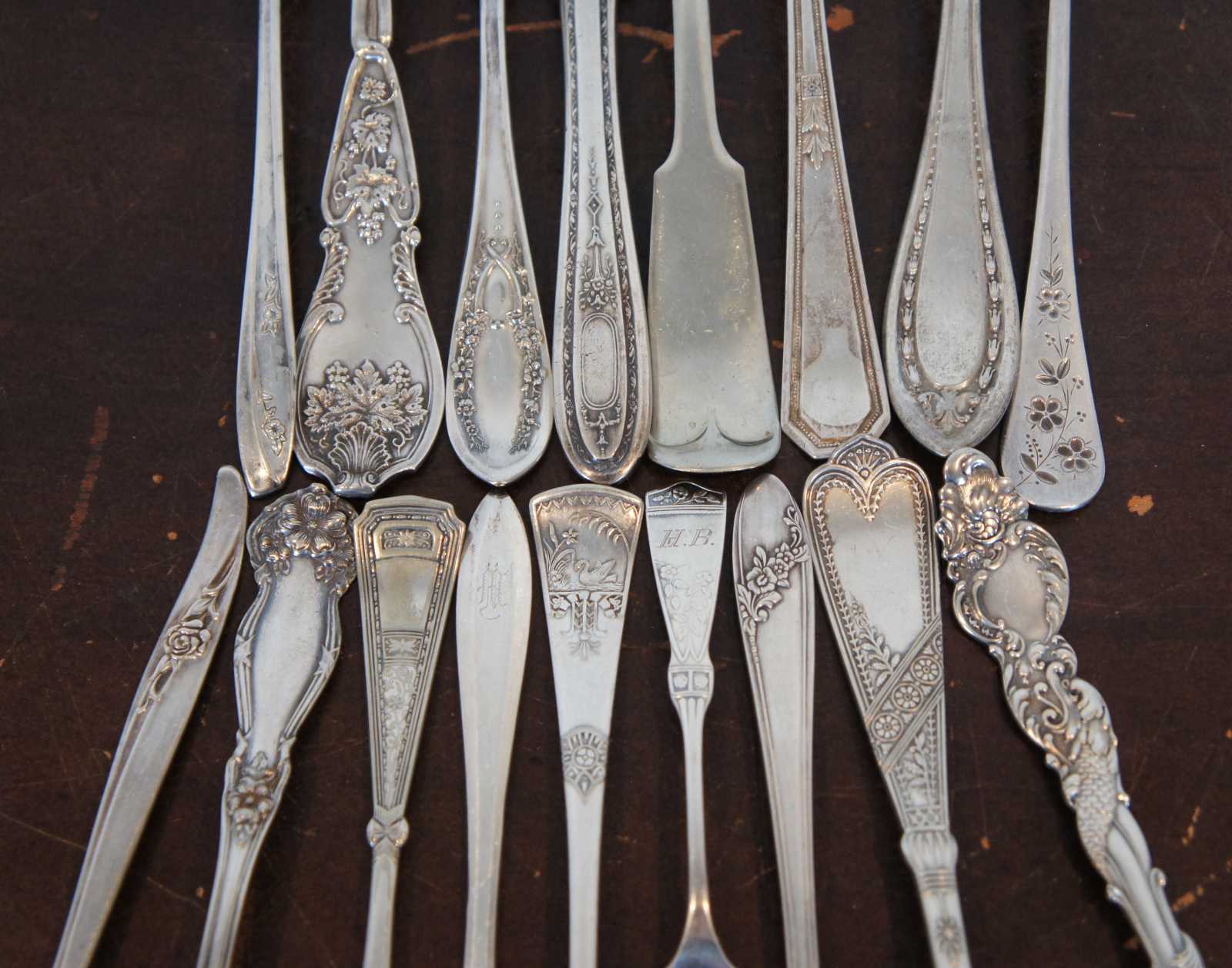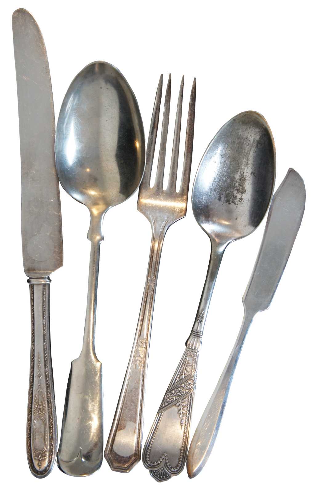 Lot of 29 antique and vintage flatware and serving pieces in silver plate and coin silver. Brands include Community Silver Plate, Wm Rogers Bros, Reed and Barton, Stratford Silver Co, and Oneida Tudor Plate.