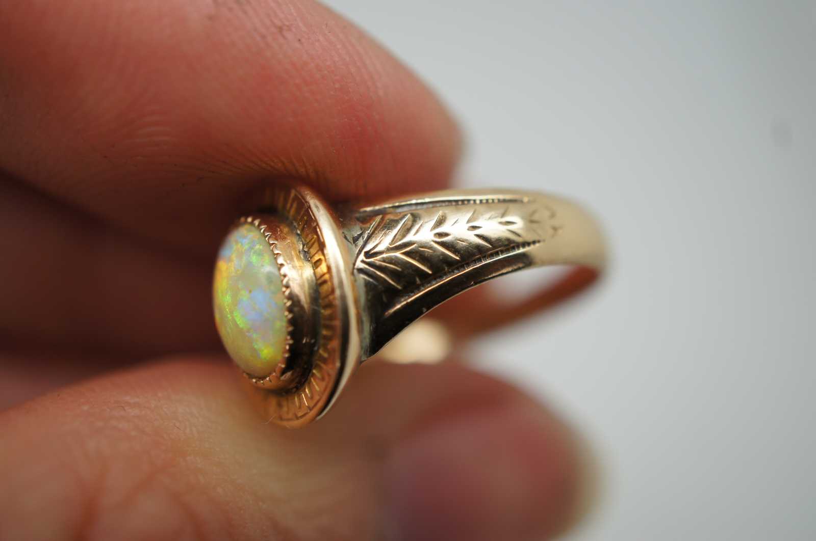 Antique 10k gold ring with Victorian styling, set with a cabochon opal and ornate detail.