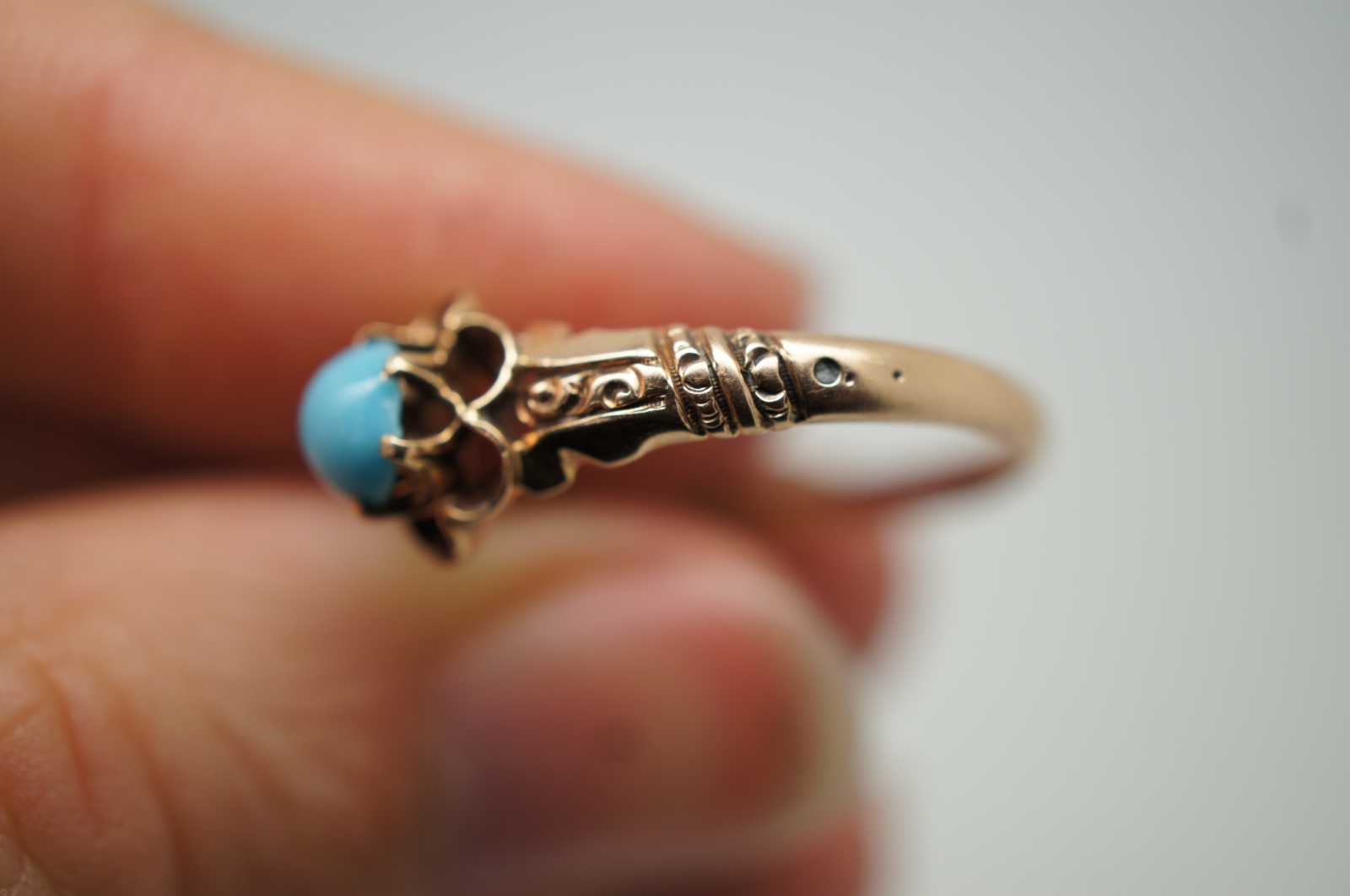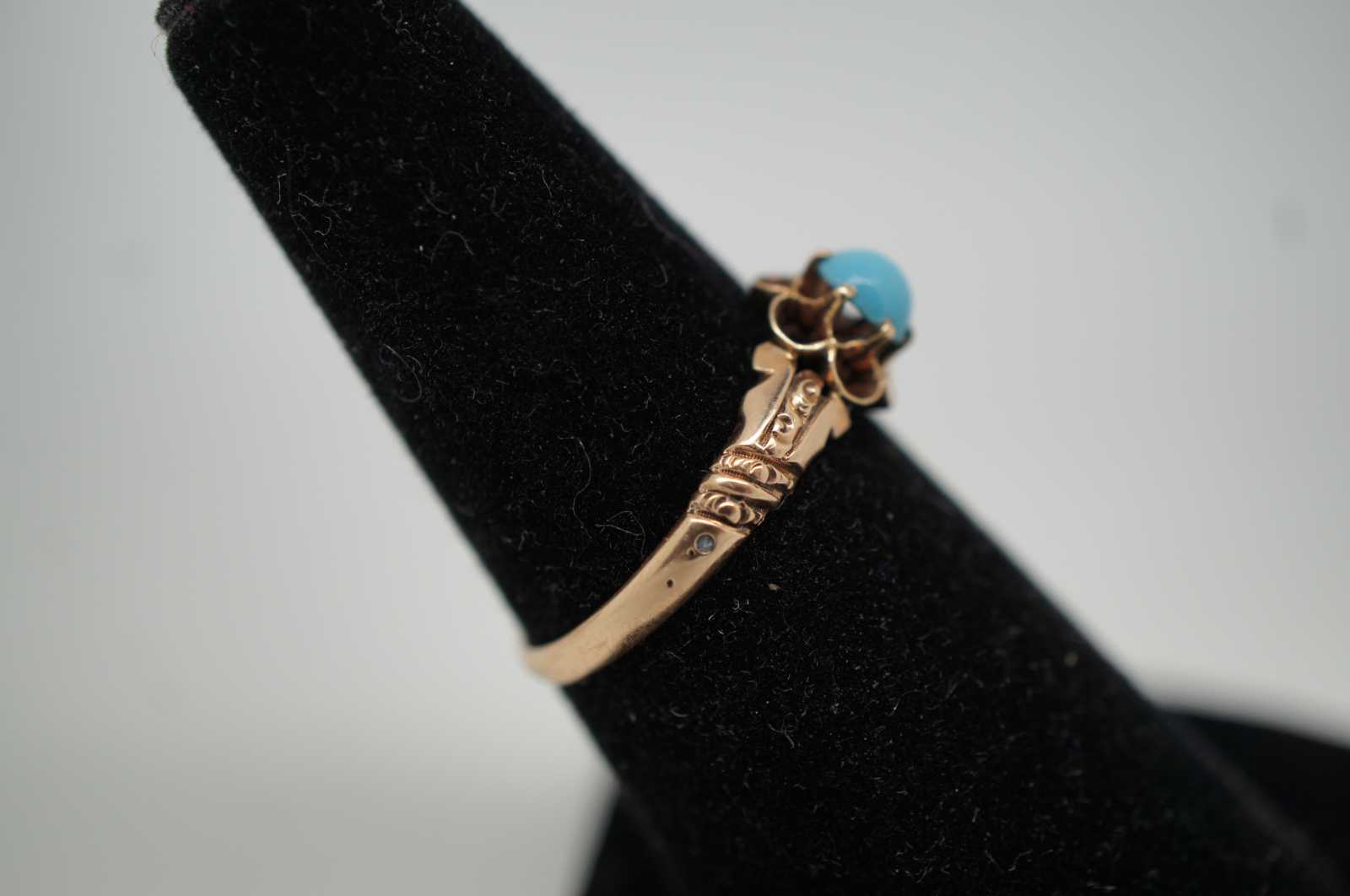 Antique Victorian 10K gold buttercup / floral shaped ring set with a cabochon turquoise stone, crafted by the Allsopp Brothers.
