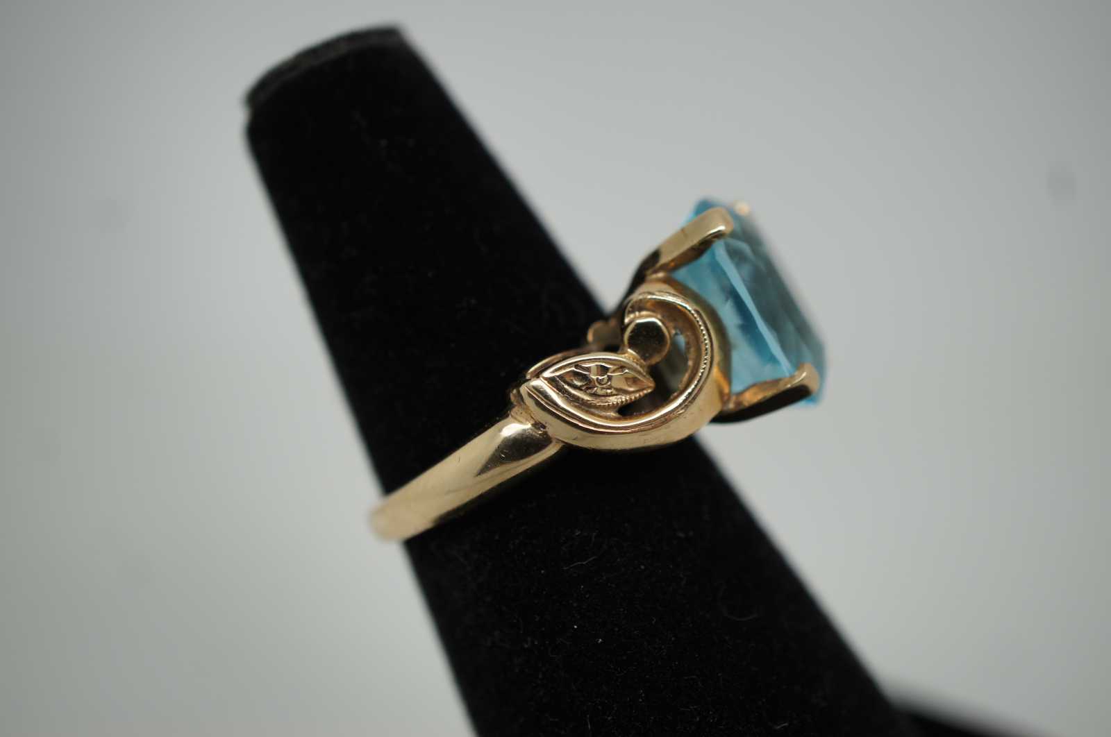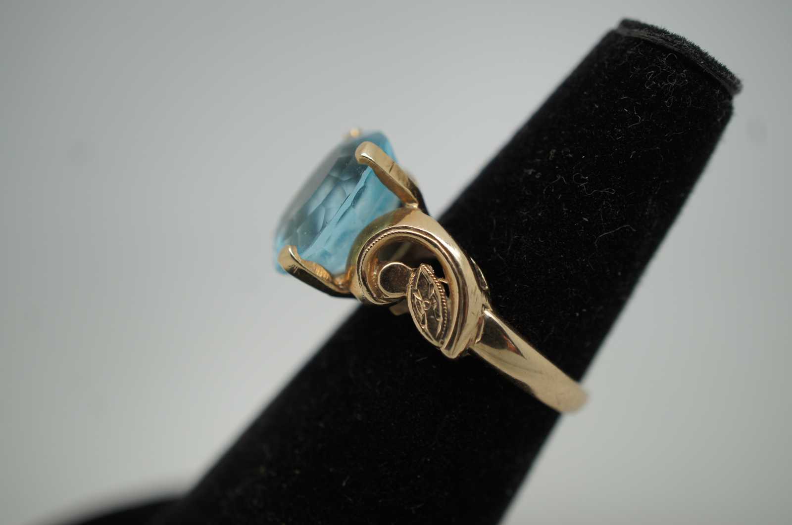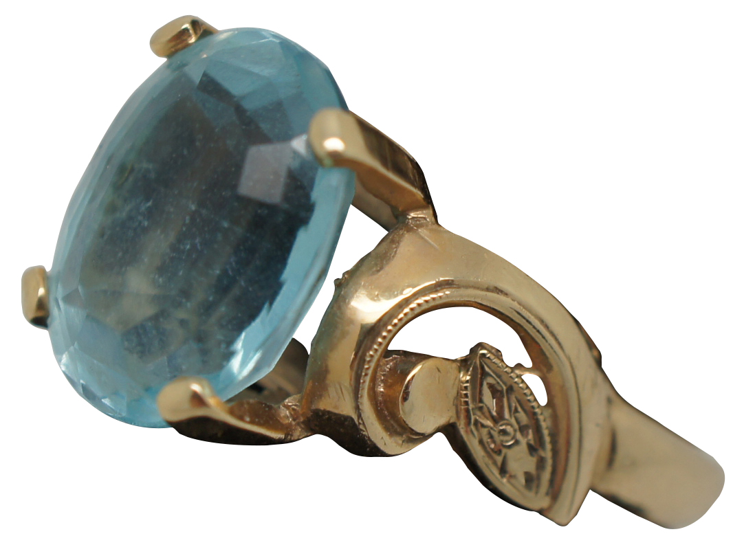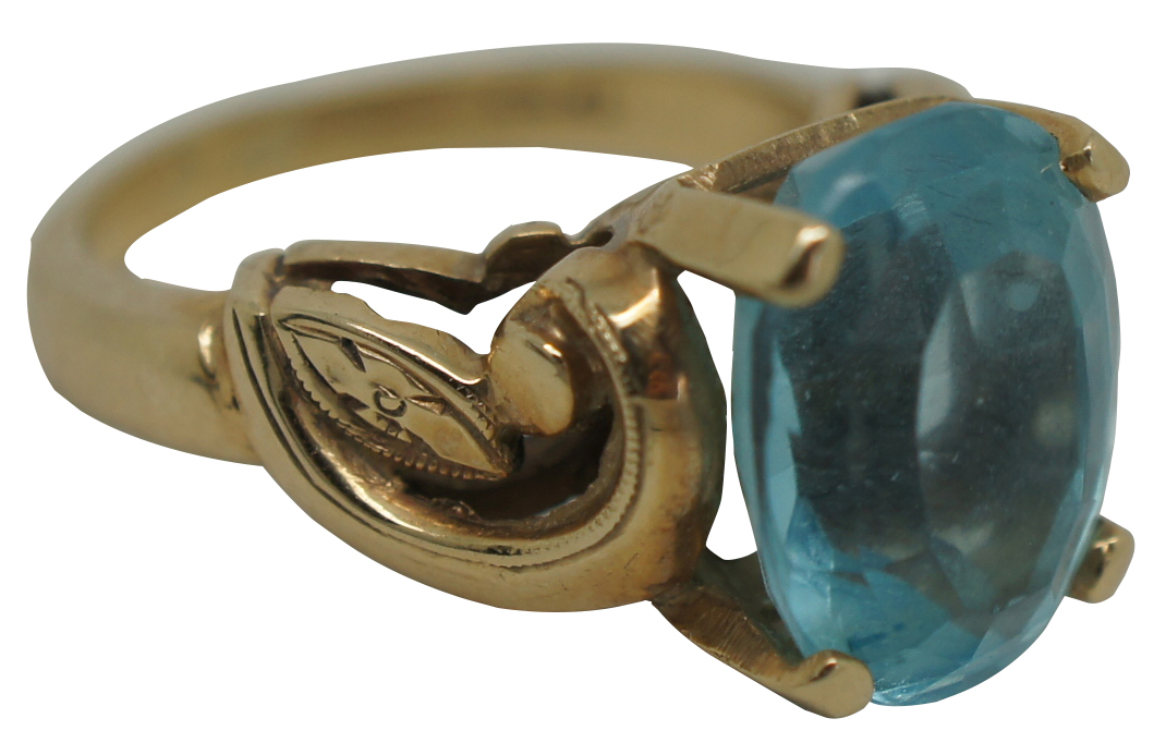 Antique 10k yellow gold ring with art nouveau and reticulated styling on the band, set with an oval cut blue topaz.