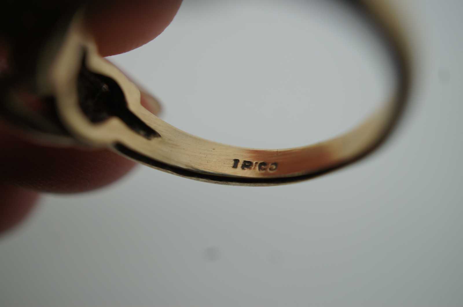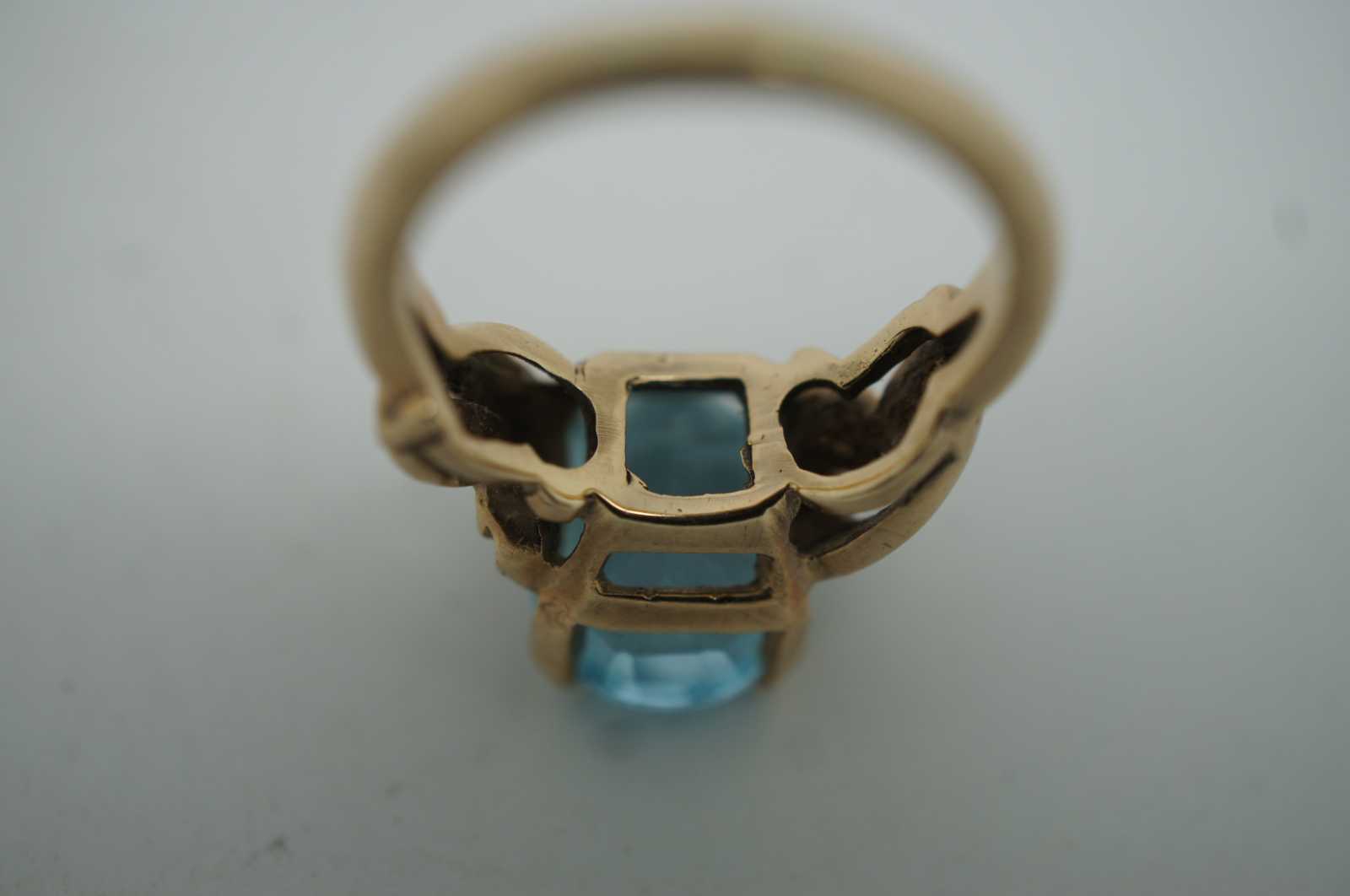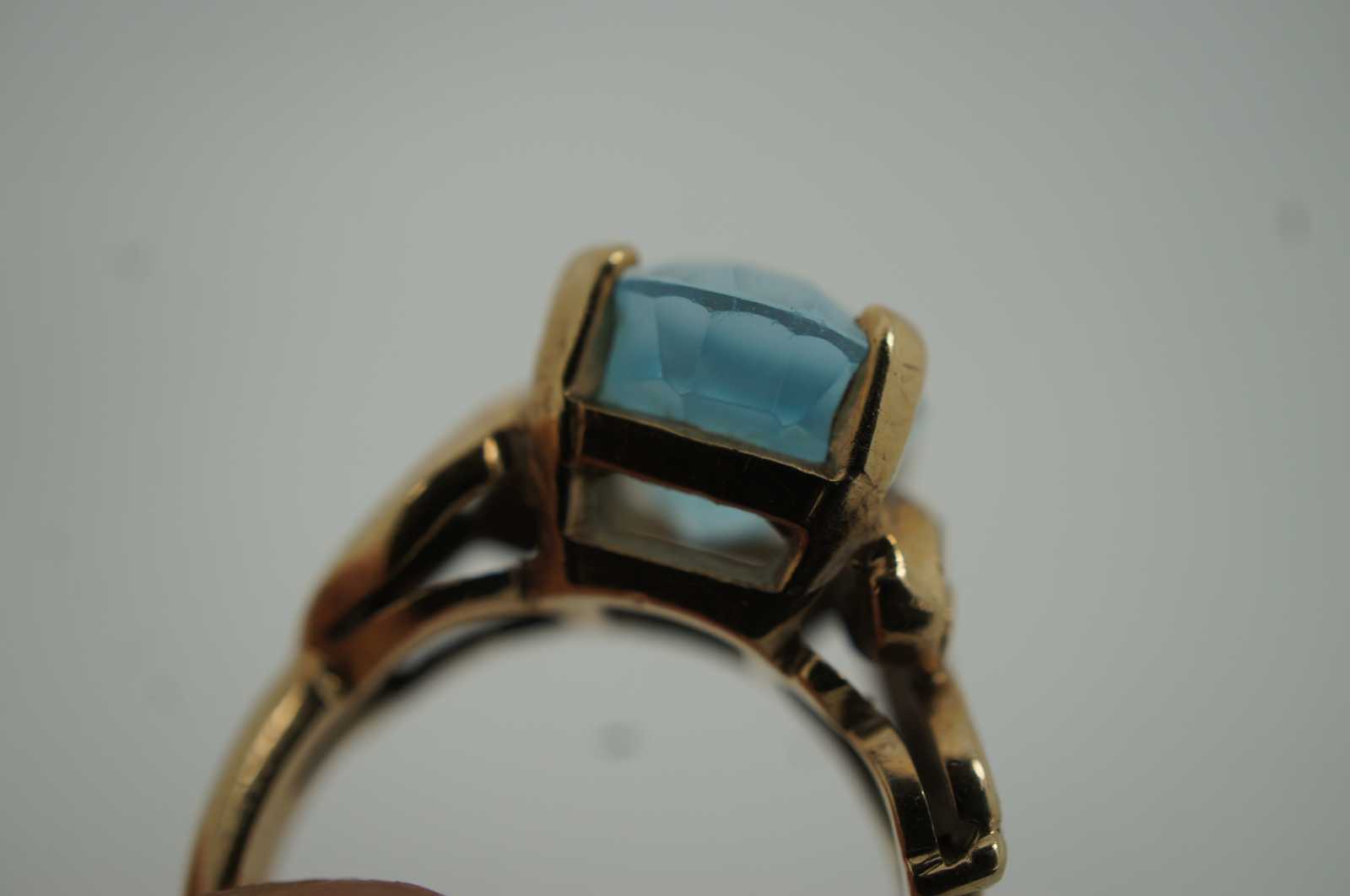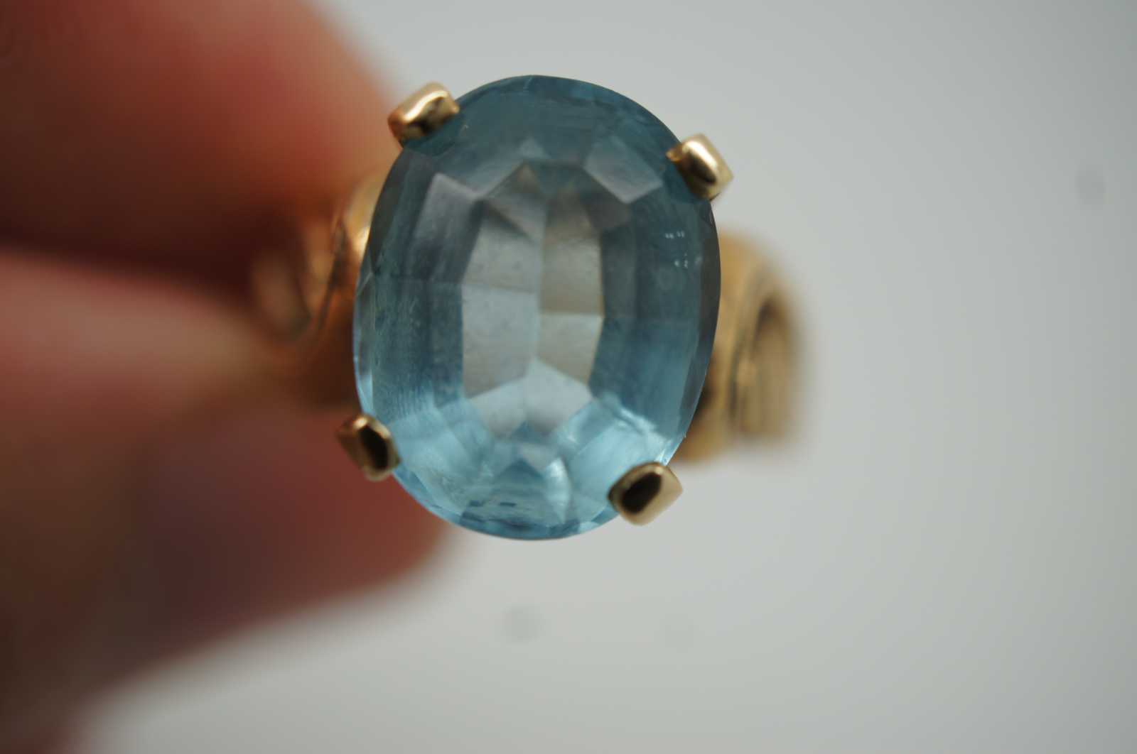 Antique 10k yellow gold ring with art nouveau and reticulated styling on the band, set with an oval cut blue topaz.