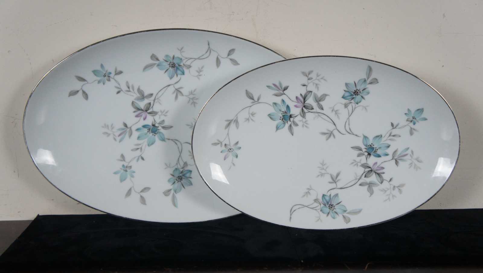 Vintage 57 piece Noritake china set in pattern 5764 – Lorene, featuring twisting springs of light blue and purple flowers with a platinum rim.