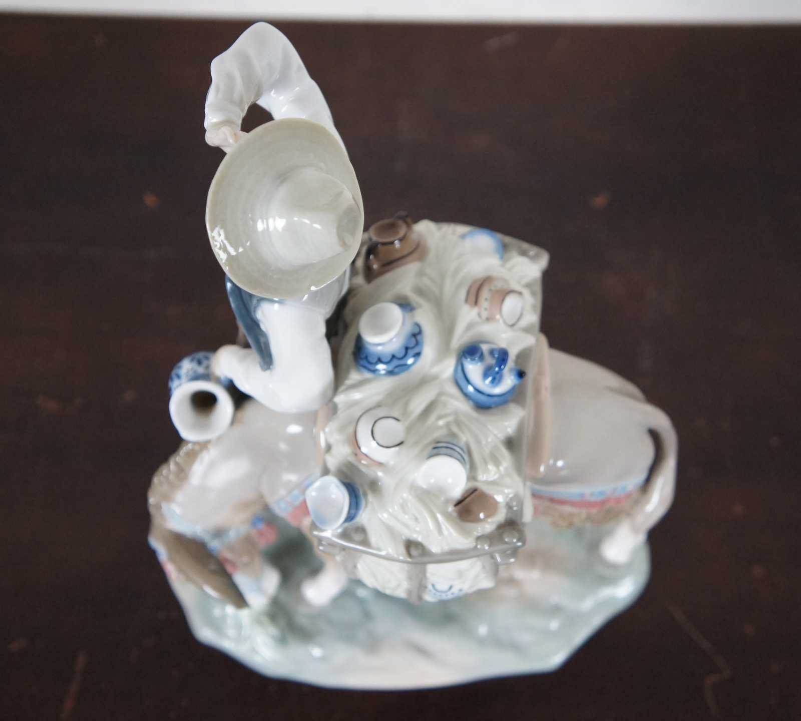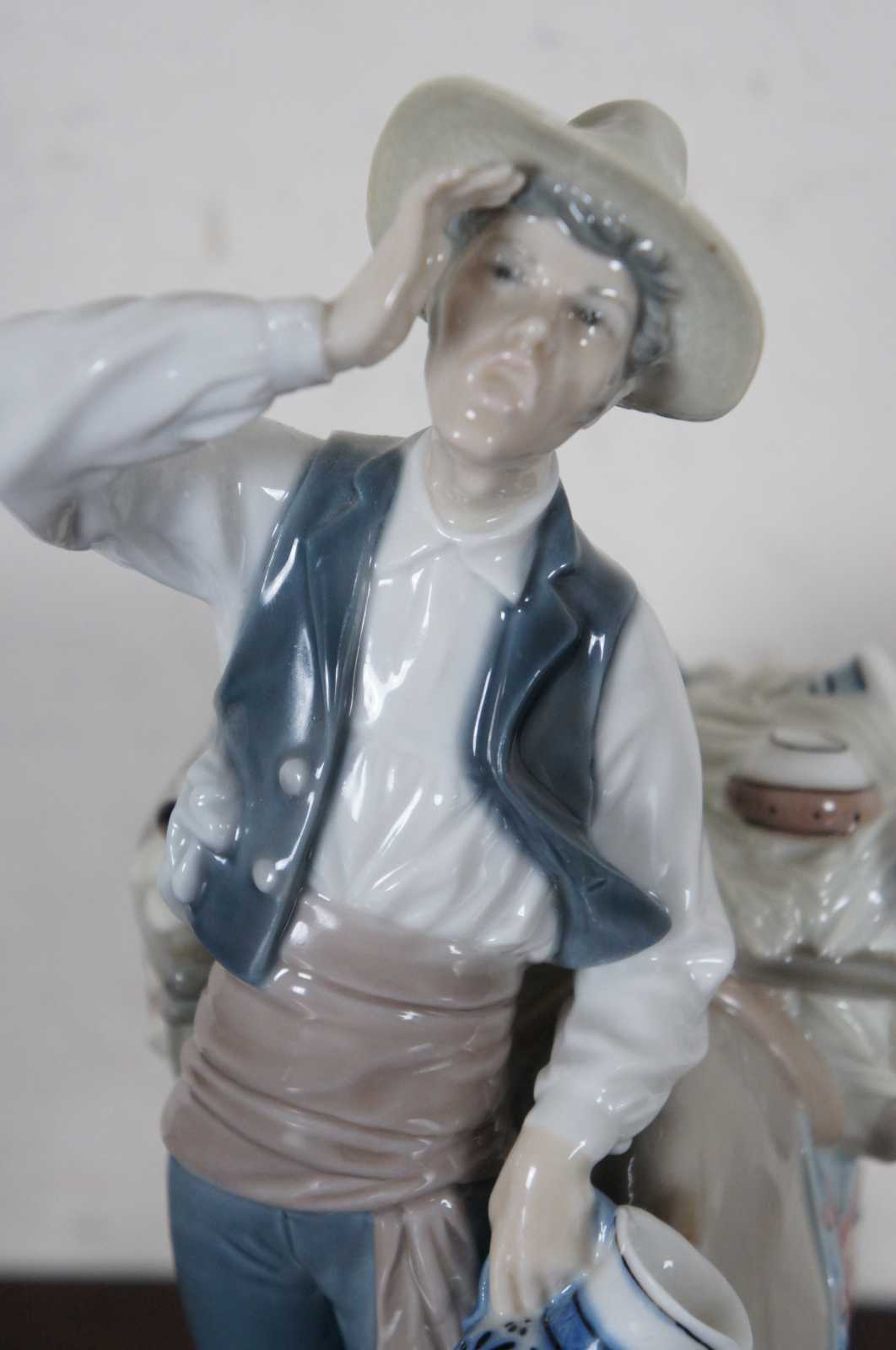 Vintage Lladro Spain porcelain figurine #4859 “Typical Peddler” showing a man leading a donkey laden with a large basket full of crockery. Produced between 1974 and 1985.