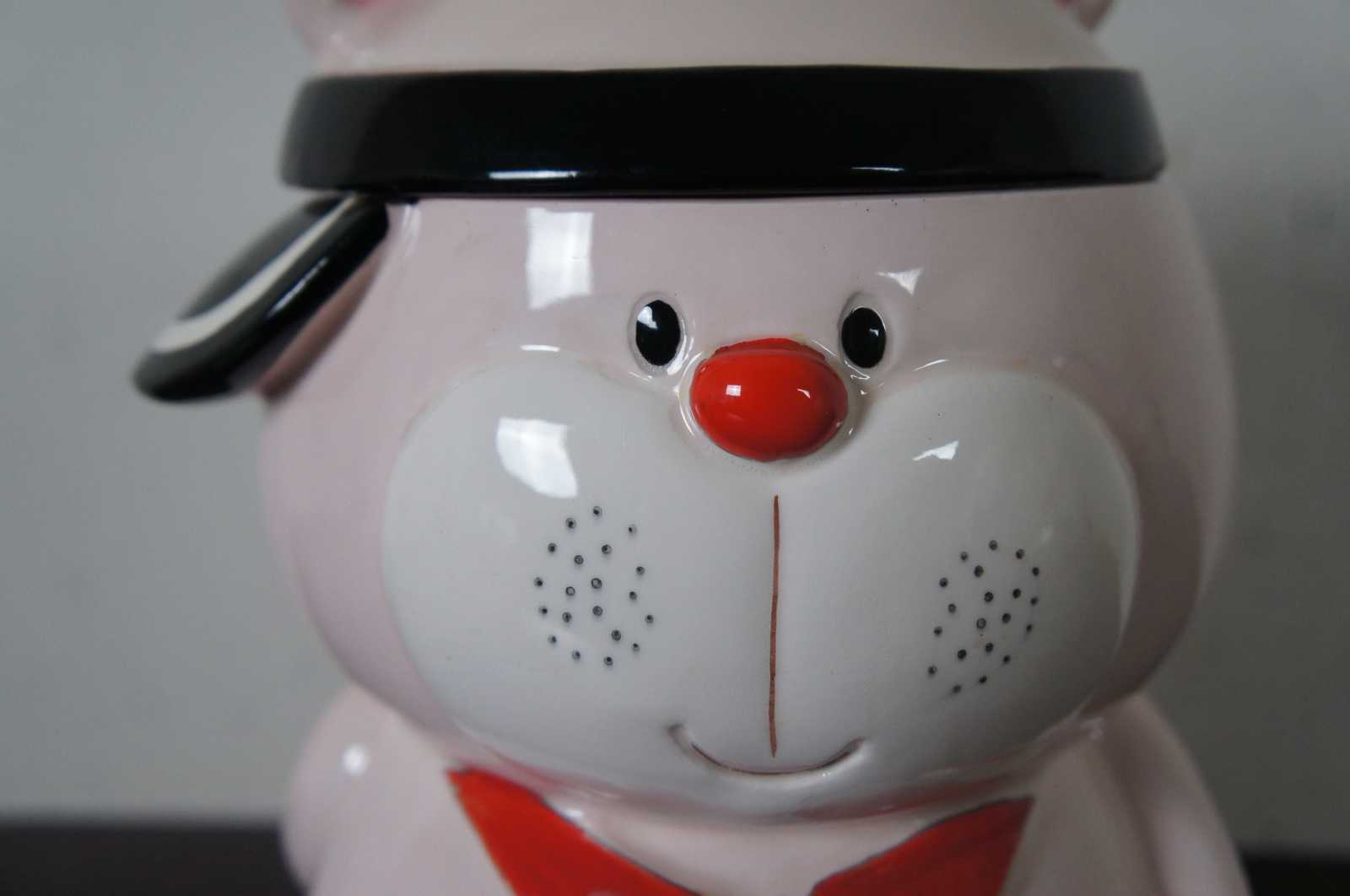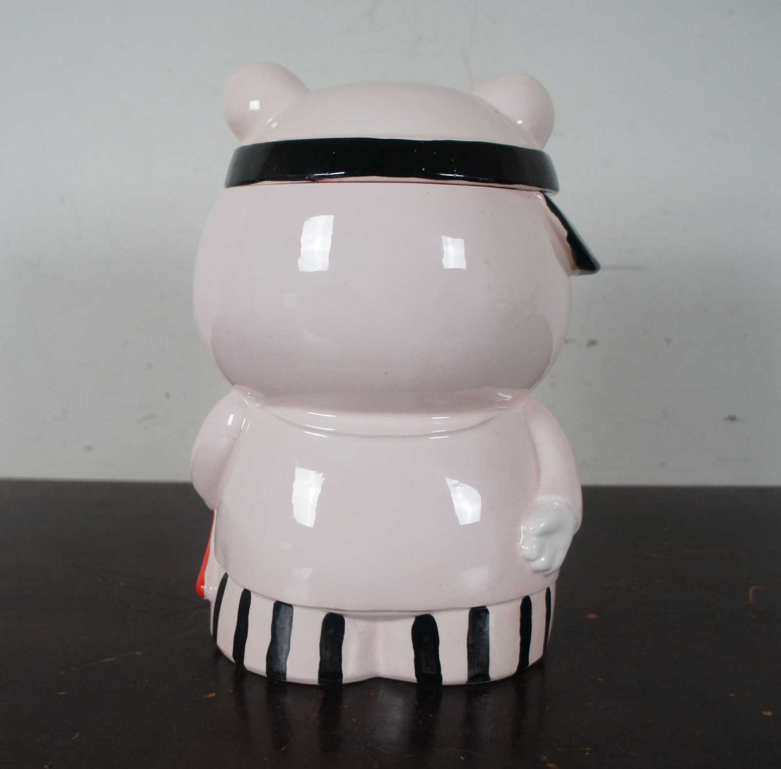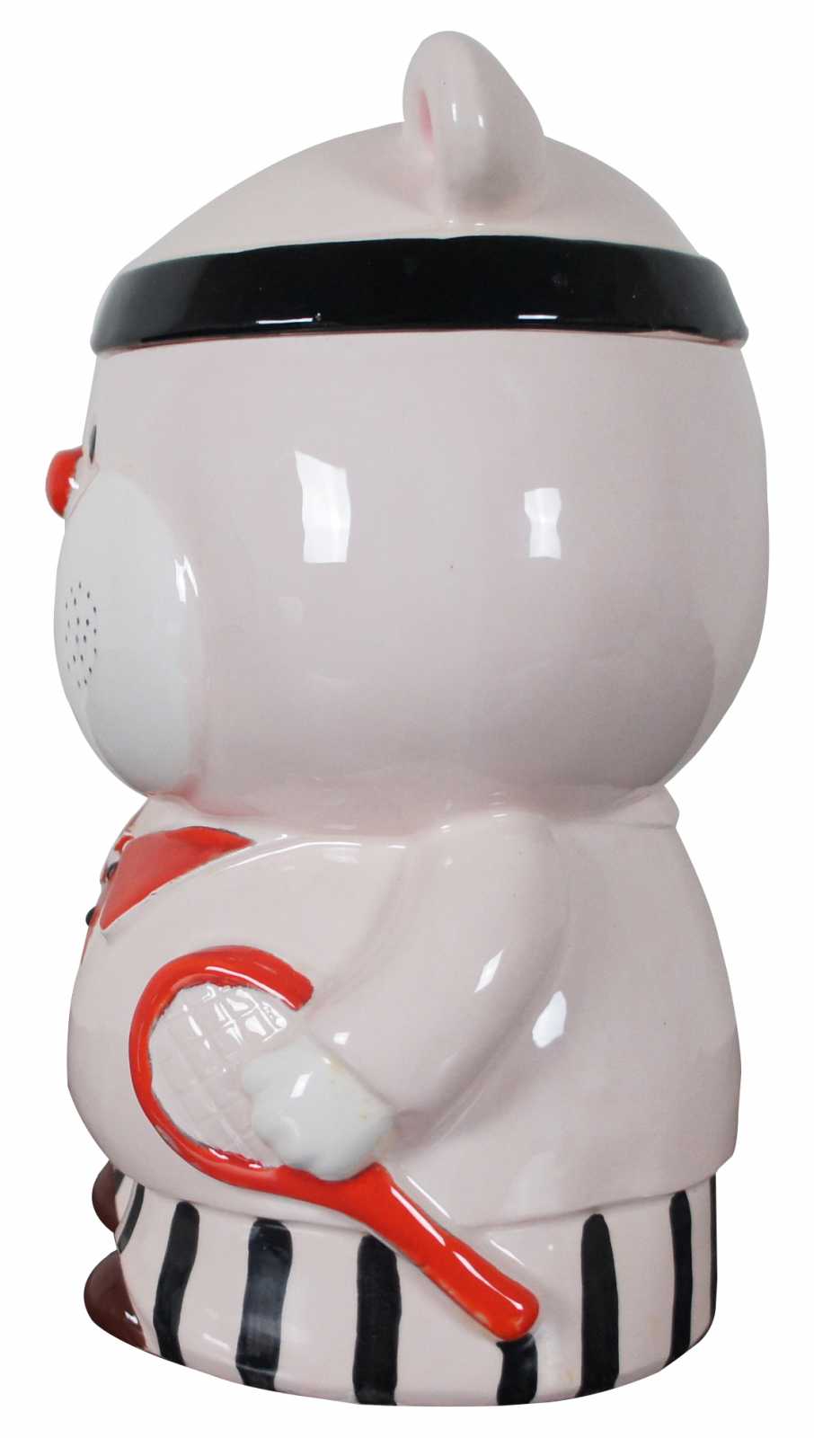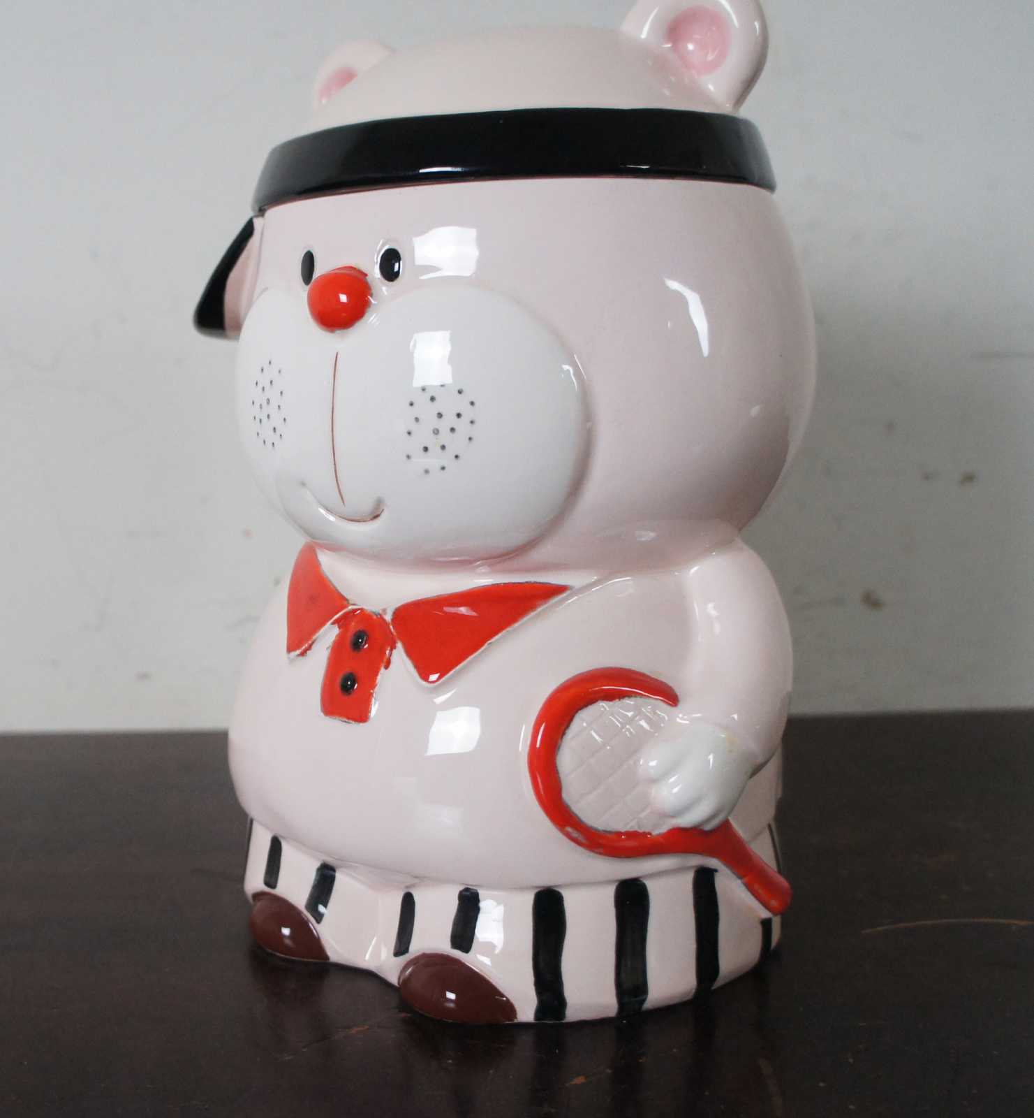 Vintage made in Japan porcelain cookie jar in the shape of a pink bear dressed up to play tennis.
