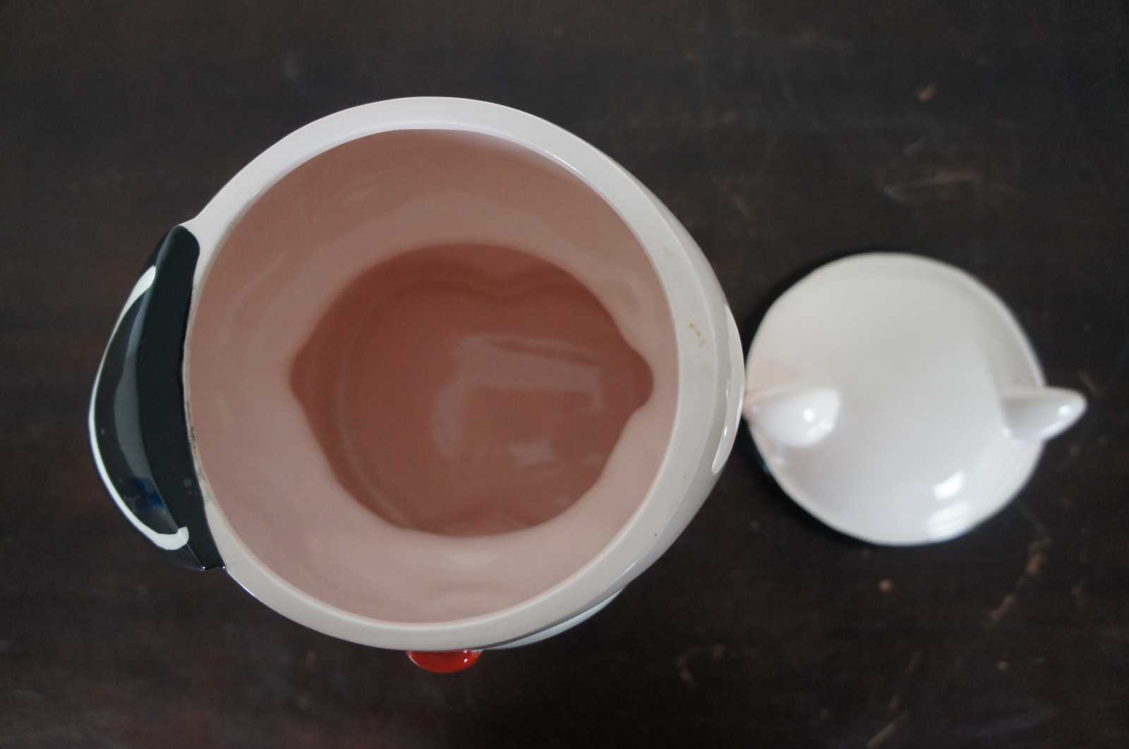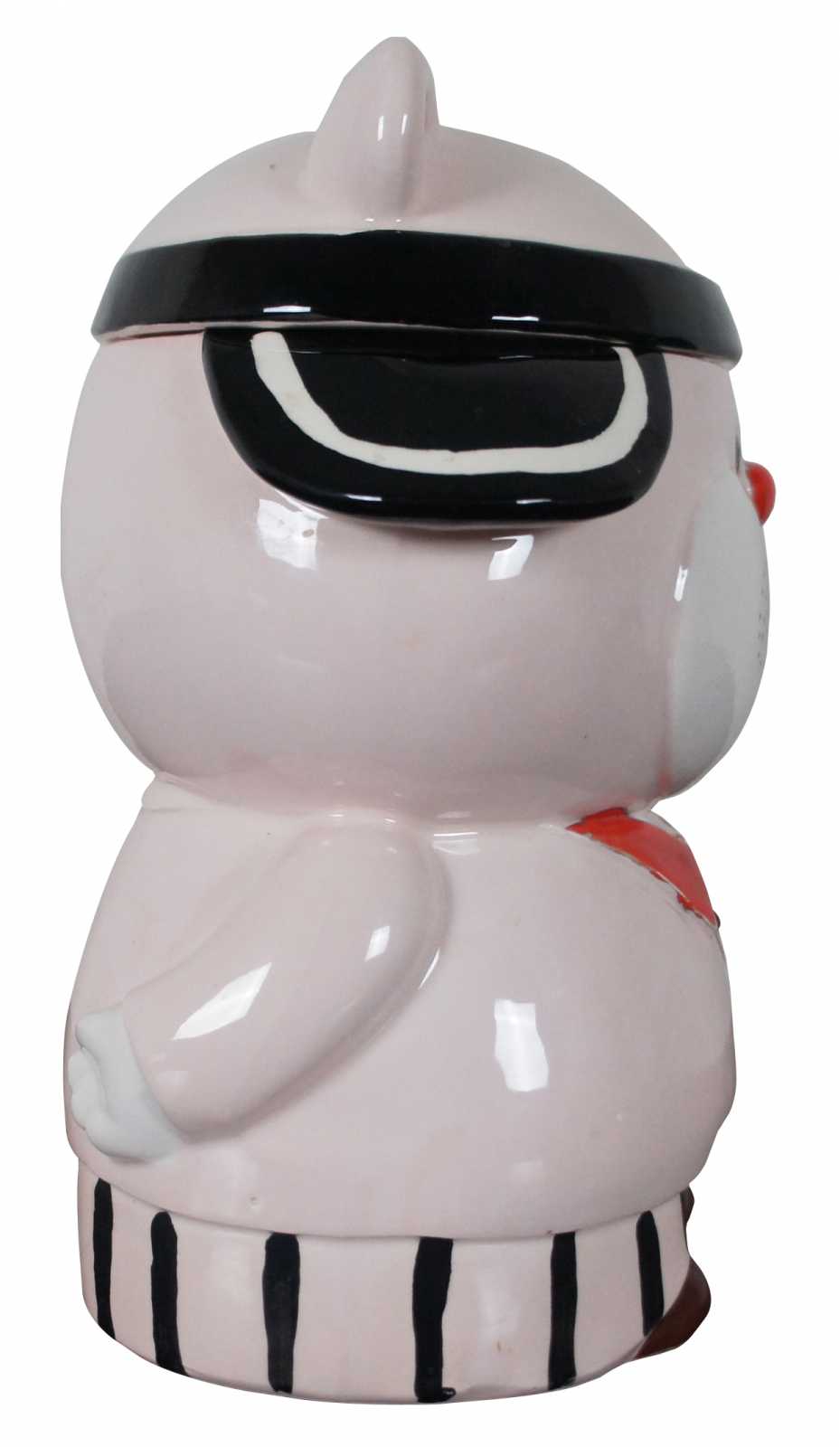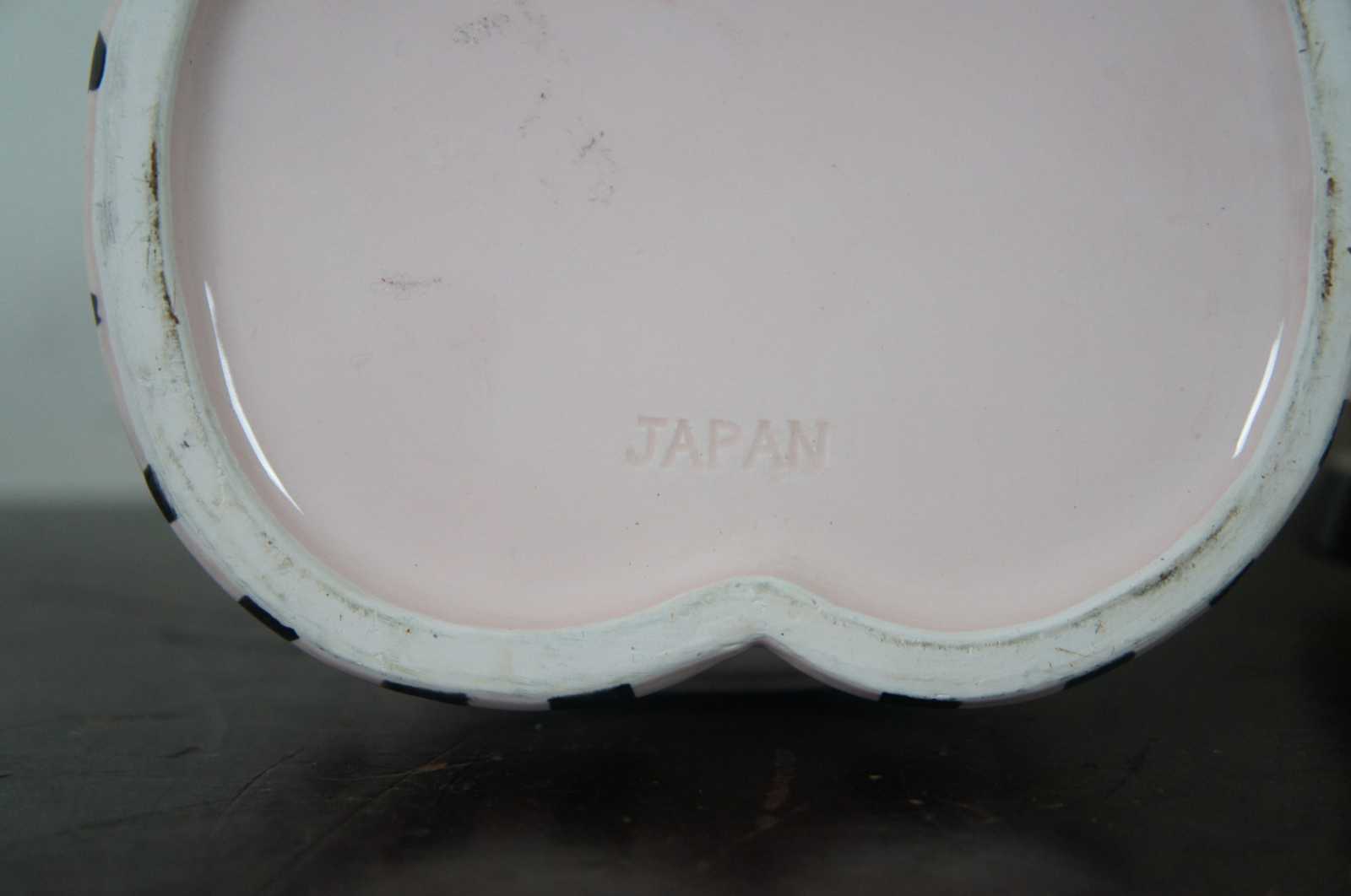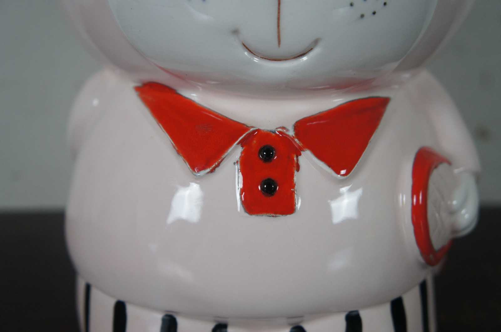 Vintage made in Japan porcelain cookie jar in the shape of a pink bear dressed up to play tennis.