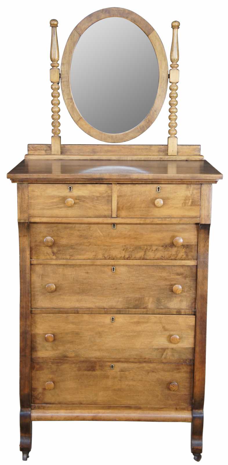Mid Century Crescent Line highboy vanity dresser or chest. Made of oak featuring a vanity mirror with ribbed supports over six drawers.