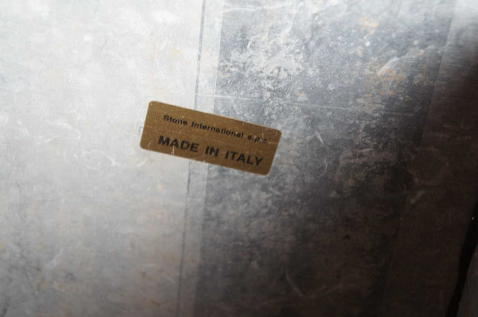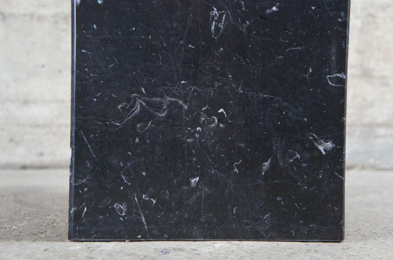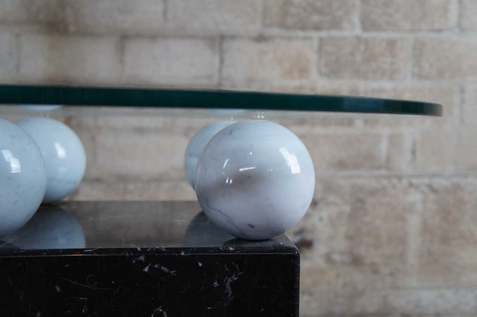 Stone International post modern marble side table, circa 1990s. Features a round glass top with beveled edge supported by an Italian stone base. The rectangular form black and white vein base features white along the top to support the top.