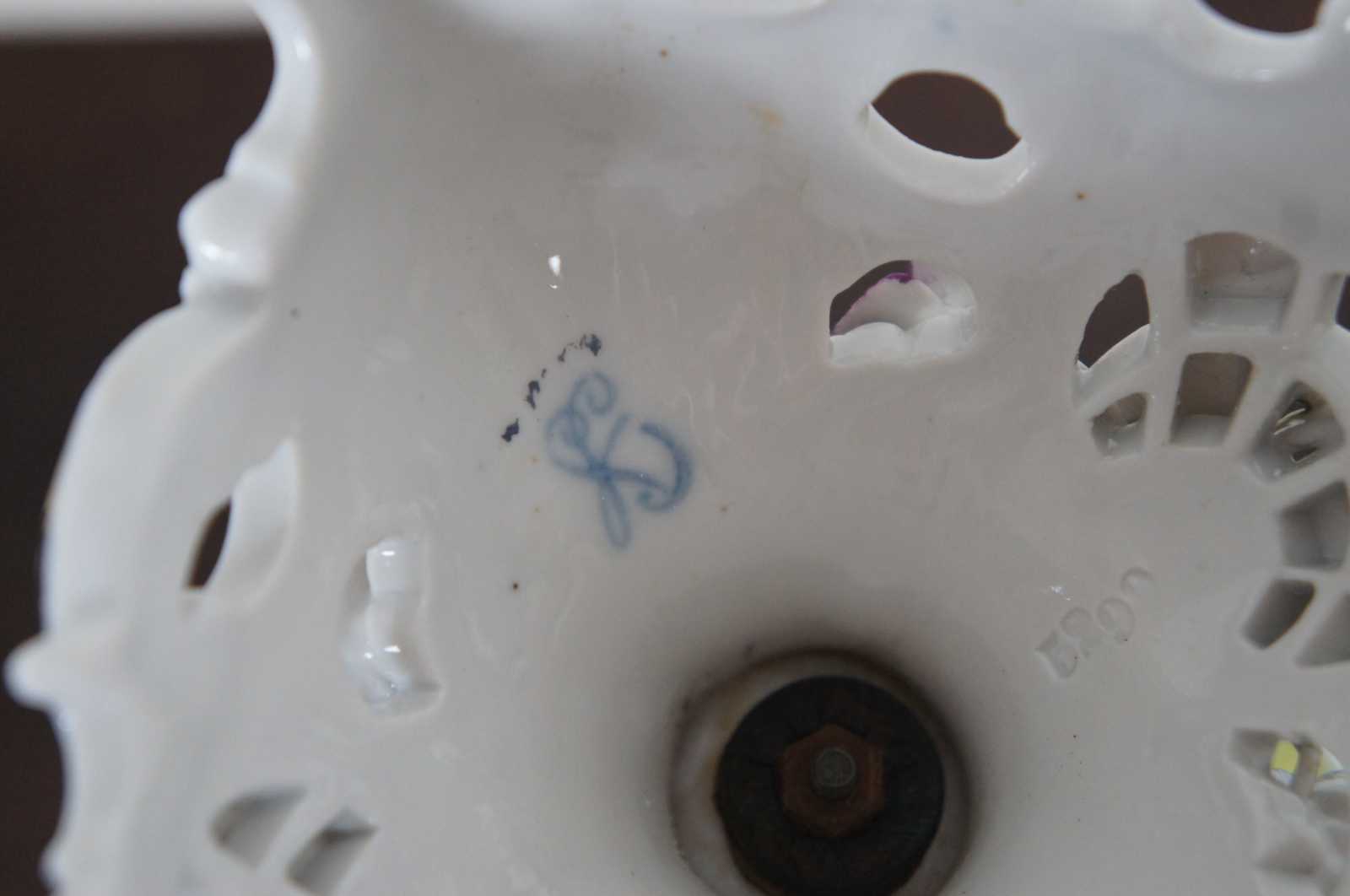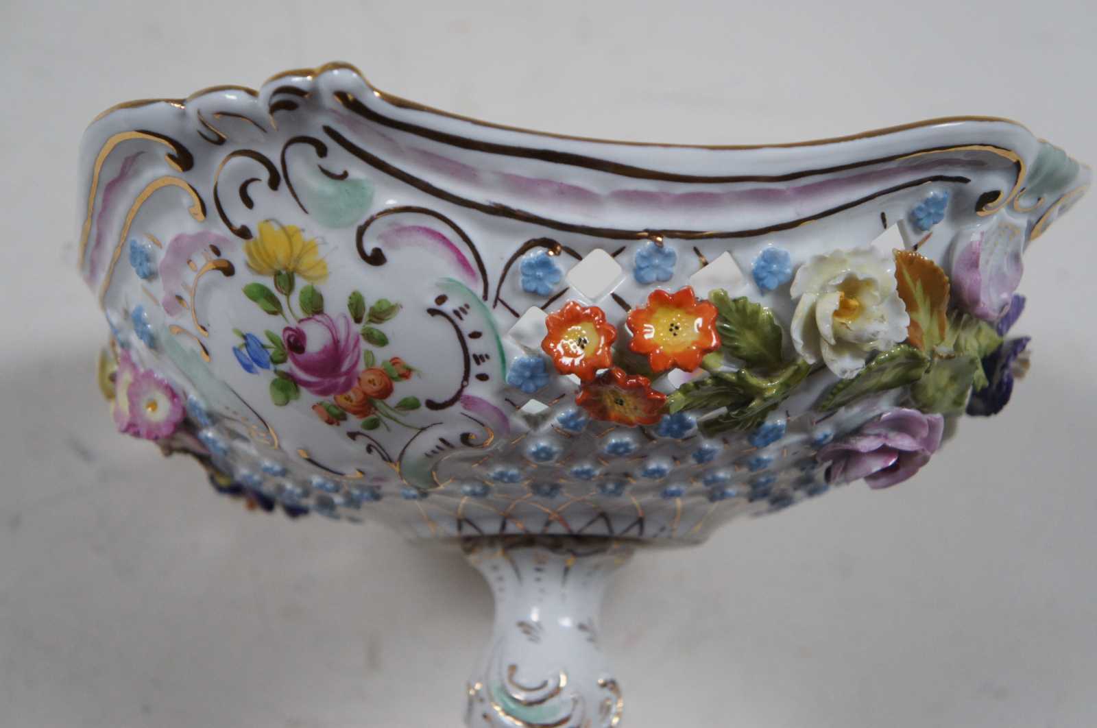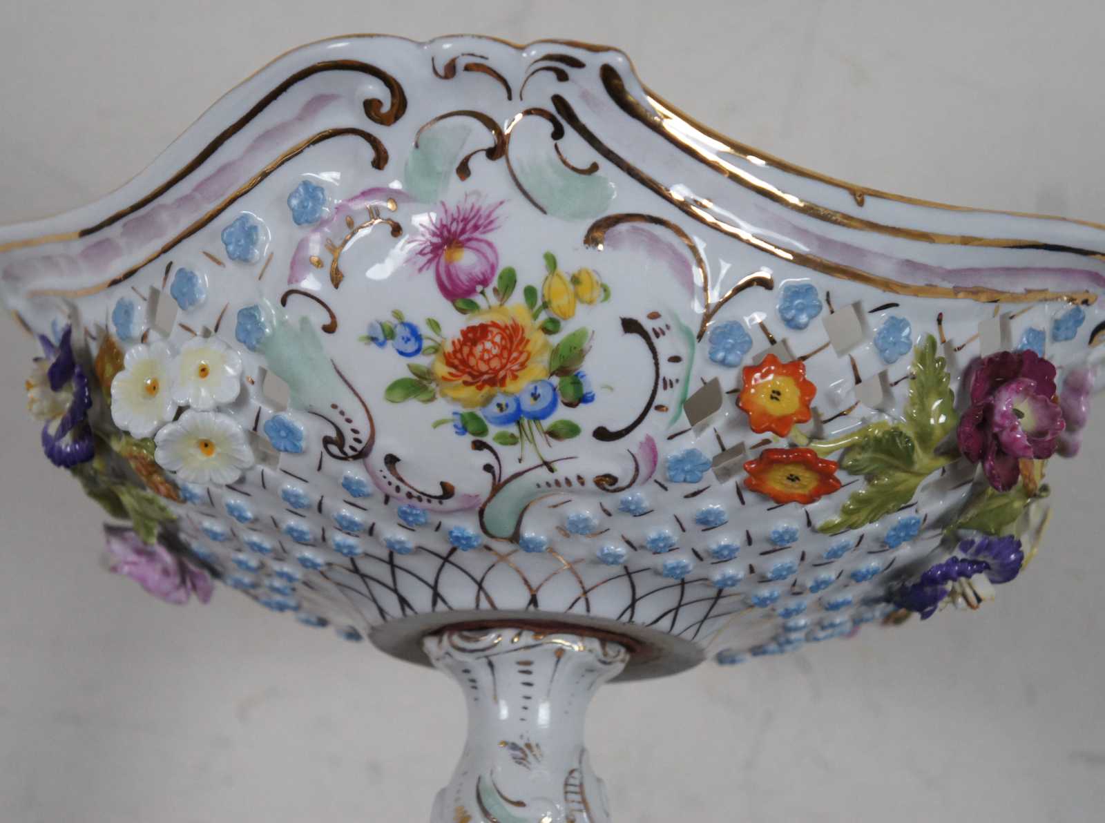 Antique early 20th century Dresden Porcelain tall pierced footed compote with hand painted lattice design with flowers and gilding, accented with delicate three dimensional blossoms throughout. Attributed to Carl Thieme. “The Sächsische Porzellan-Manufaktur Dresden GmbH (Saxon Porcelain Manufactory in Dresden Ltd), generally known in English as Dresden Porcelain, is a German company for the production of decorative and luxury porcelain. Founded in 1872, it is located in Potschappel, a suburb of the town of Freital in the Sächsische Schweiz-Osterzgebirge district about 8 km (5 mi) southwest of Dresden, the capital of Saxony. Dresden Porcelain introduced its blue "SP Dresden" trademark in 1902.”