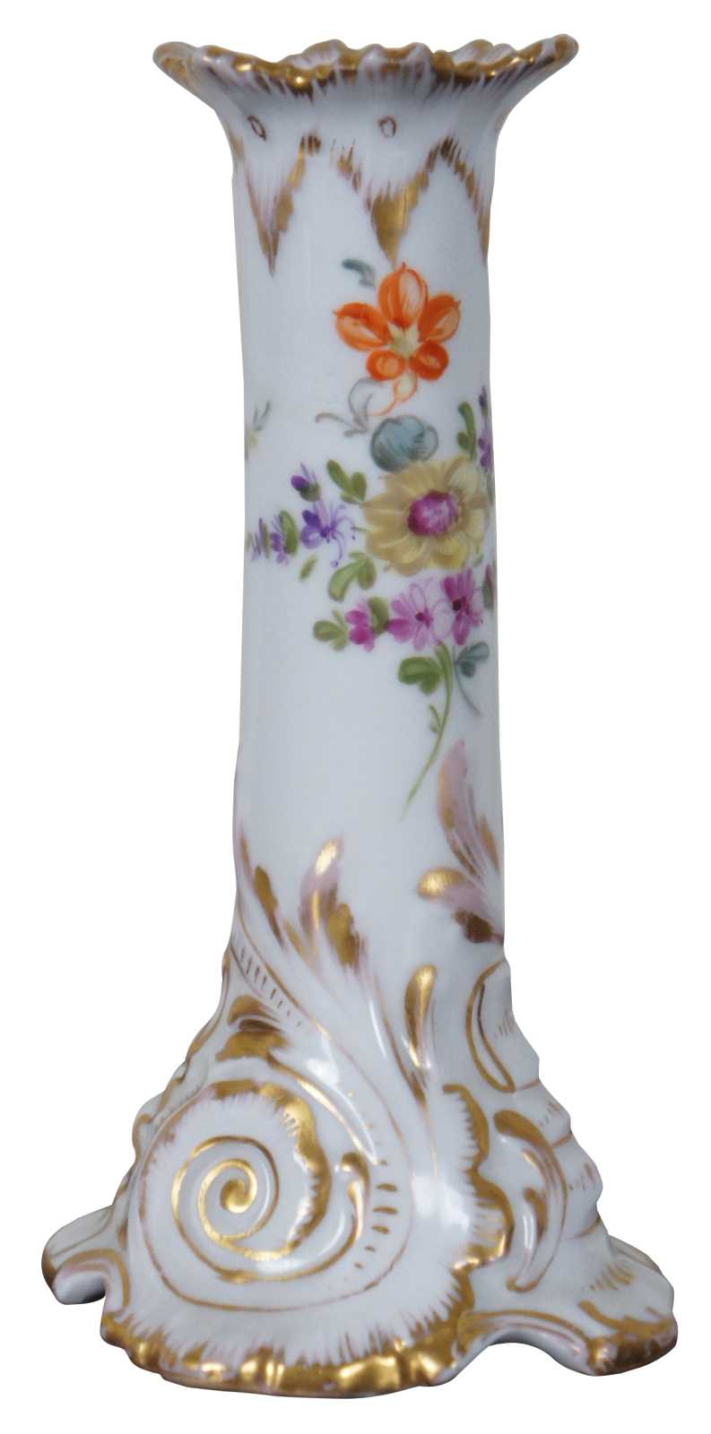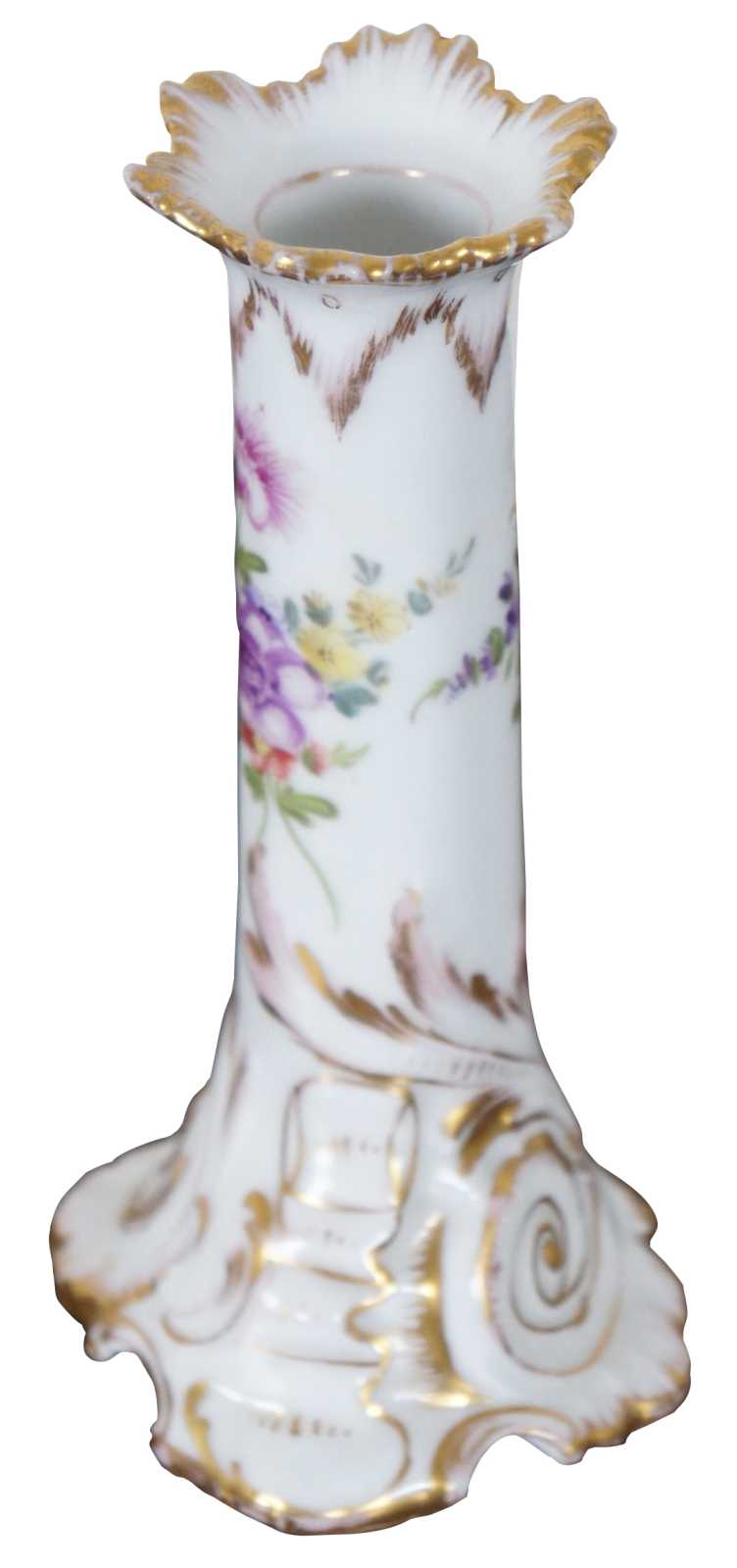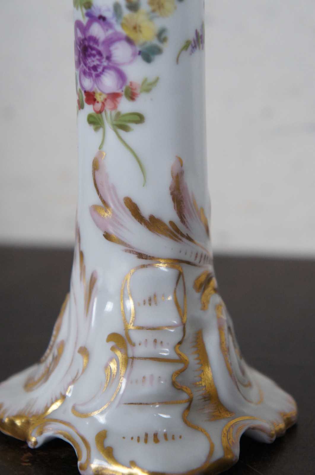 Antique Dresden German porcelain candlestick holder with hand painted flowers and gilded accents.