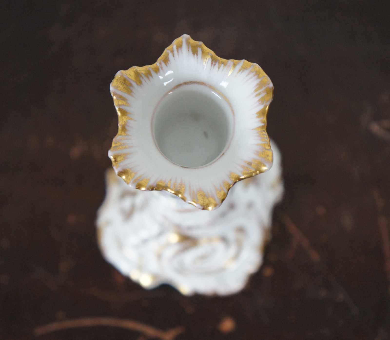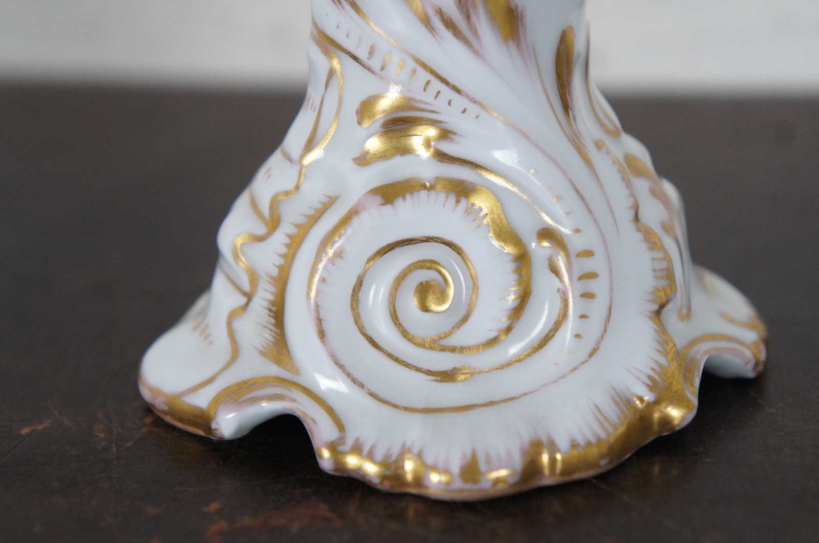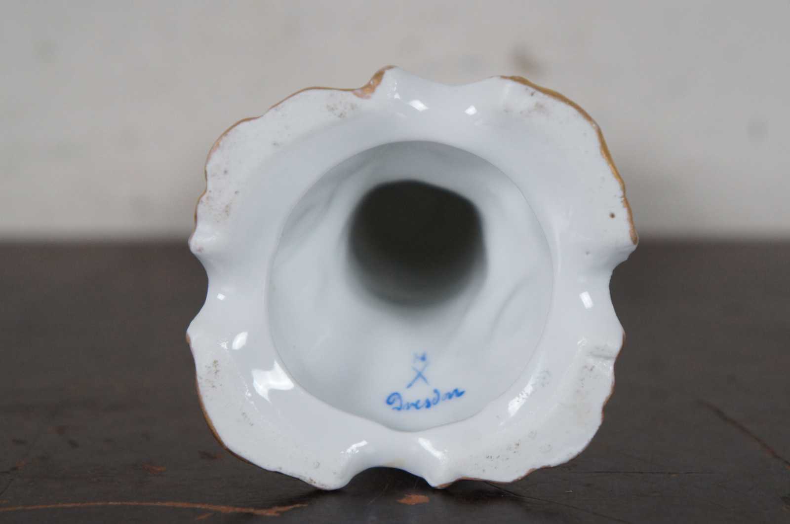 Antique Dresden German porcelain candlestick holder with hand painted flowers and gilded accents.