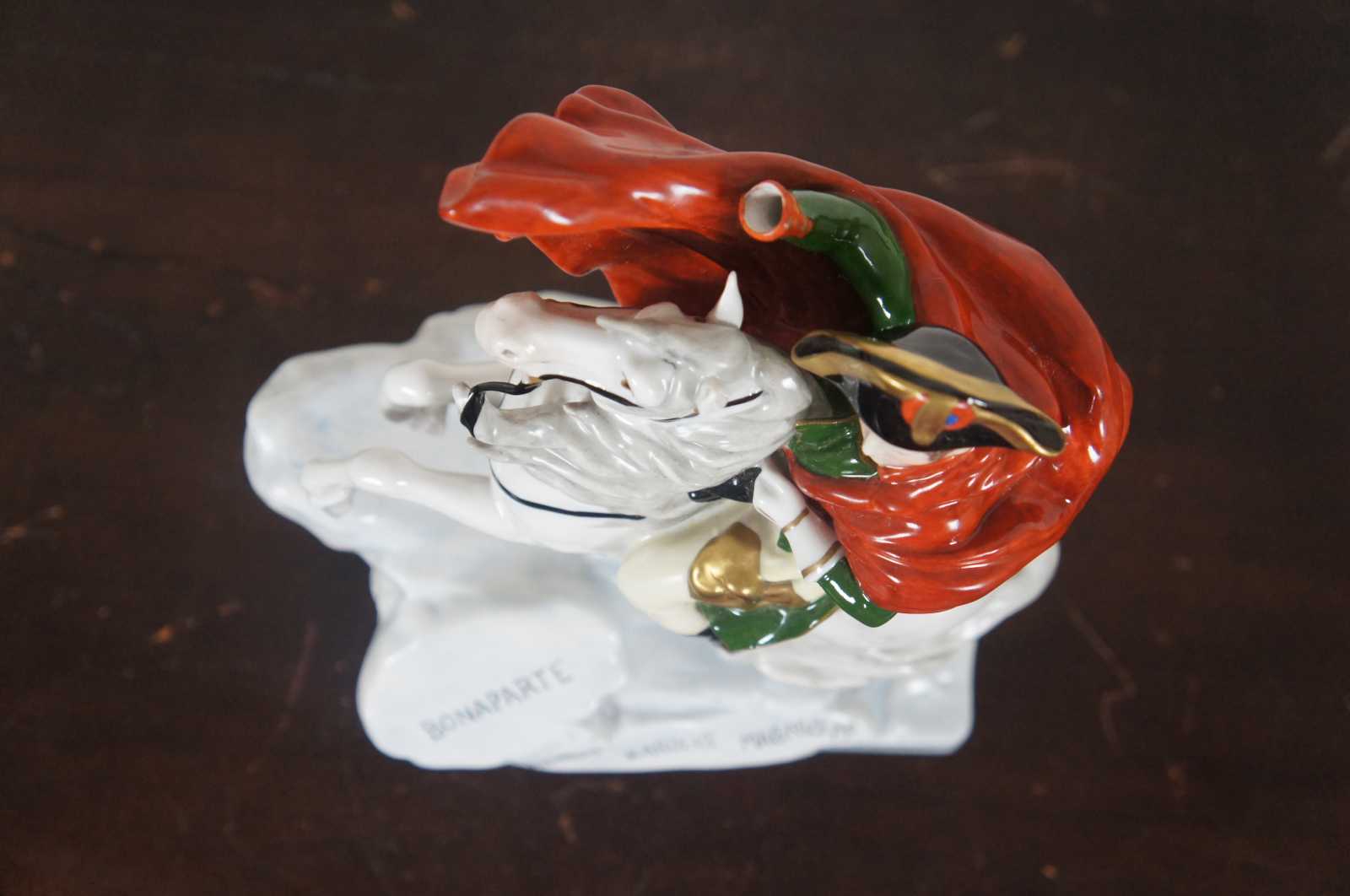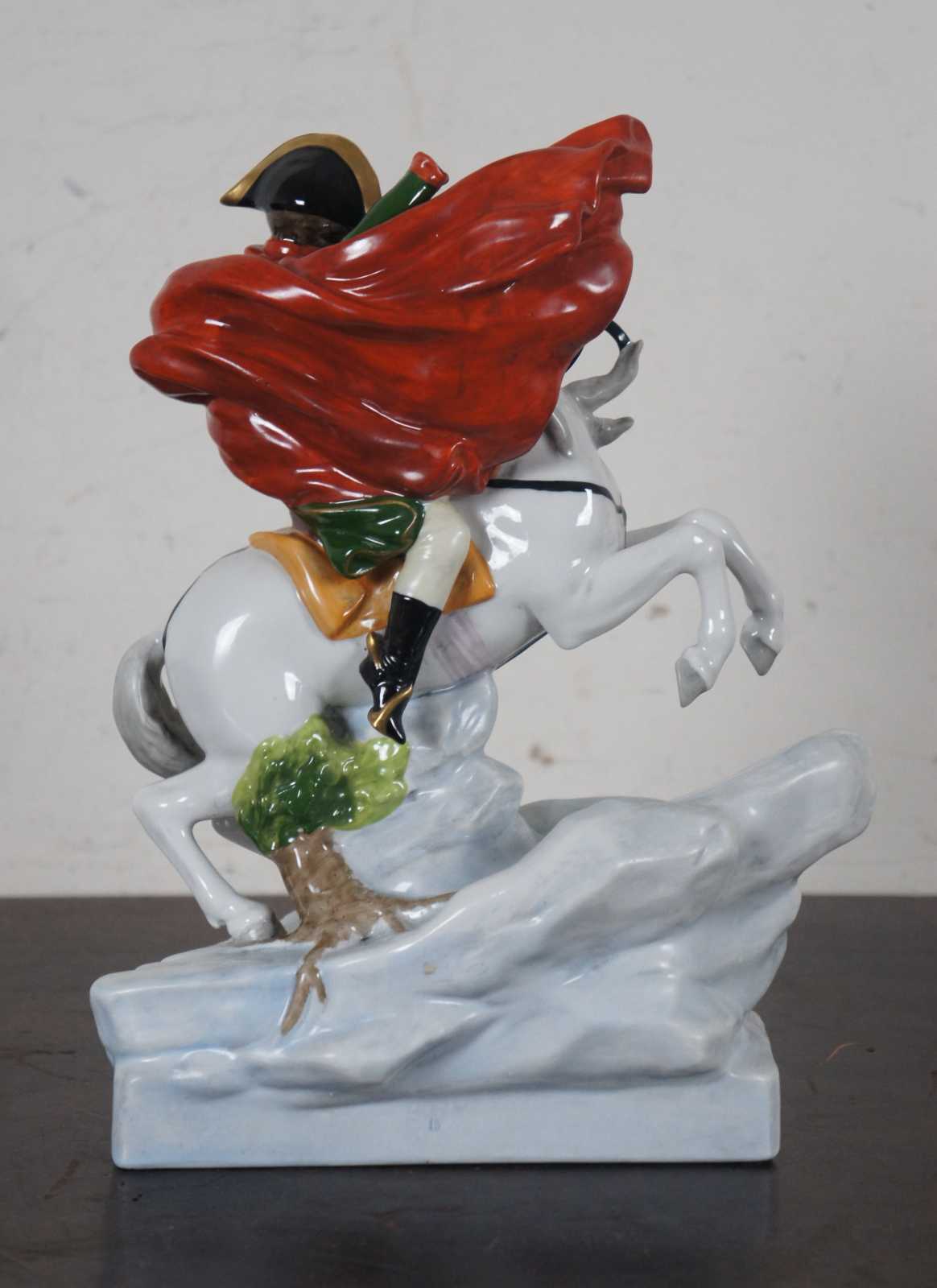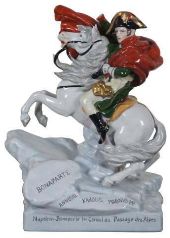 Antique Kister porcelain figurine of Napoleon Bonaparte on a rearing horse. “A.W. Fr. Kister Porcelain Manufactory of Scheibe-Alsbach, Thuringia, Germany, used this mark from 1900 to 1972. ("A.W. Fr." stands for "August Wilhelm Fridolin.") The company was in business from 1838 until 1991.” “Napoléon Bonaparte[a] (15 August 1769 – 5 May 1821), usually referred to as simply Napoleon in English, was a French military and political leader who rose to prominence during the French Revolution and led several successful campaigns during the Revolutionary Wars. He was the de facto leader of the French Republic as First Consul from 1799 to 1804. As Napoleon I, he was Emperor of the French from 1804 until 1814 and again in 1815. Napoleon dominated European and global affairs for more than a decade while leading France against a series of coalitions in the Napoleonic Wars. He won most of these wars and the vast majority of his battles, building a large empire that ruled over continental Europe before its final collapse in 1815. One of the greatest commanders in history, his wars and campaigns are studied at military schools worldwide. He remains one of the most celebrated and controversial political figures in human history.”