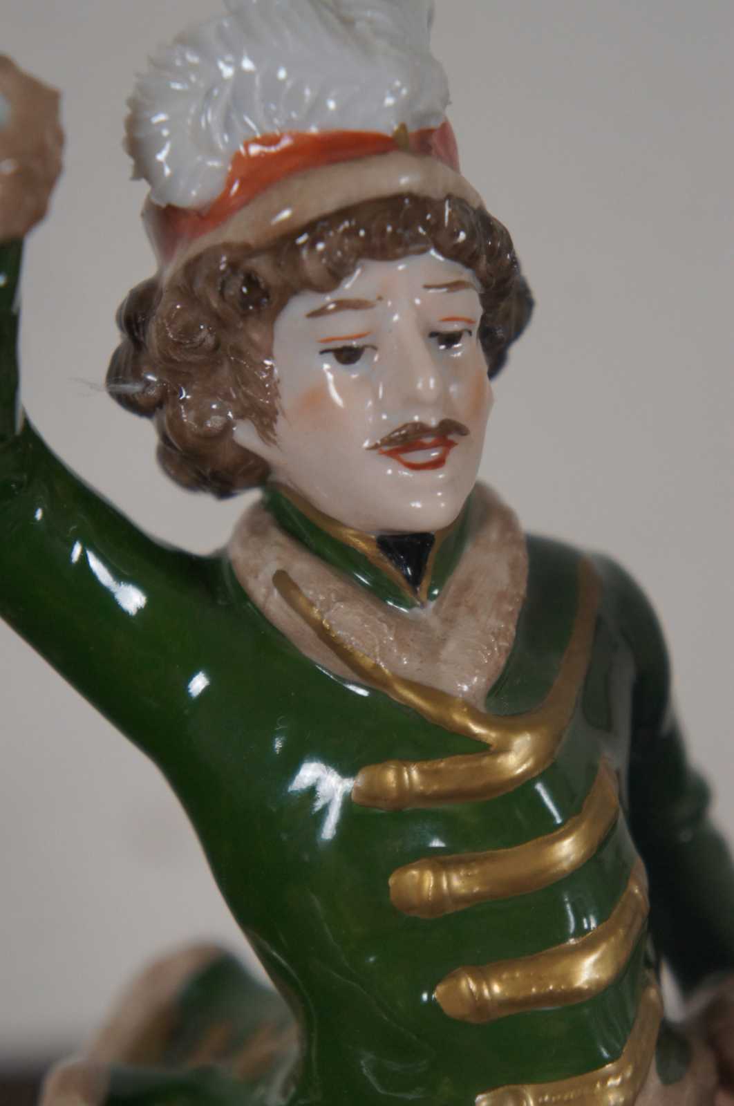 Antique Kister porcelain figurine of Joachim Murat riding a white horse. “A.W. Fr. Kister Porcelain Manufactory of Scheibe-Alsbach, Thuringia, Germany, used this mark from 1900 to 1972. ("A.W. Fr." stands for "August Wilhelm Fridolin.") The company was in business from 1838 until 1991.” “Joachim Murat (25 March 1767 – 13 October 1815) was a French military commander and statesman who served during the French Revolutionary Wars and the Napoleonic Wars. Under the French Empire he received the military titles of Marshal of the Empire and Admiral of France, and was also the 1st Prince Murat,[1] Grand Duke of Berg from 1806 to 1808,[2] and, as Joachim-Napoleon, King of Naples from 1808 to 1815.[5] He was the brother-in-law of emperor Napoleon I, who characterized him as exceptionally brave in the face of the enemy, a weakling when he was on his own, a braggart dressed in gold and feathers, continually escaping as by a miracle and admired by the cossacks for his bravery.”