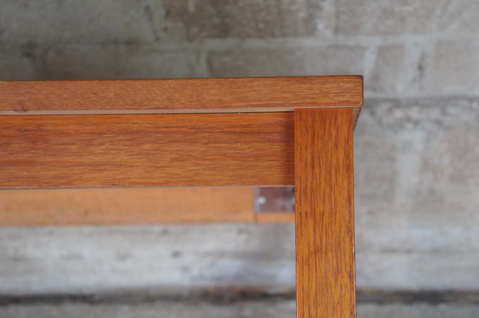Danish modern square teak side accent table. Made of teak wood featuring a floral / leaf motif tiled top.