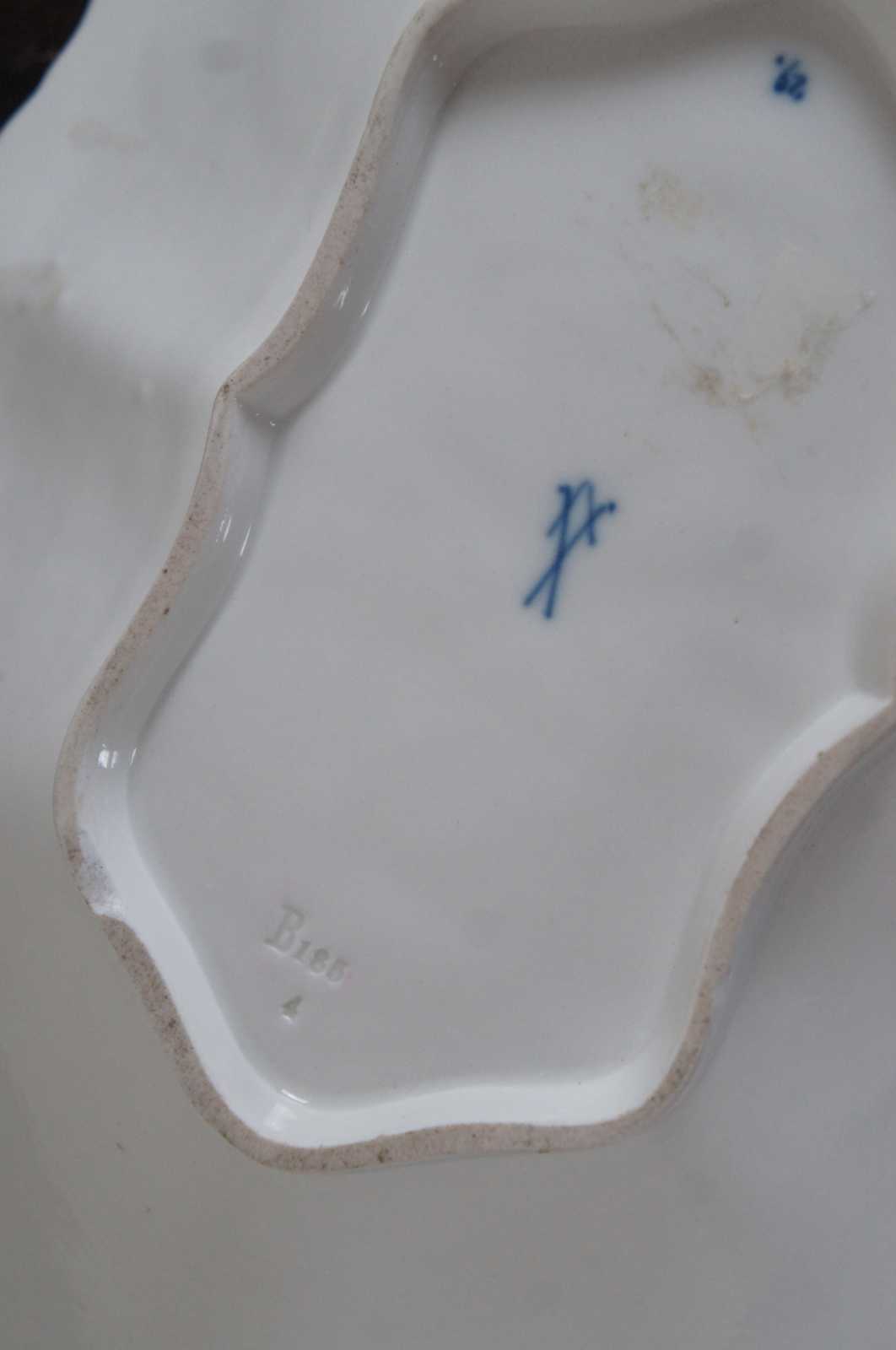 Antique Meissen porcelain scalloped oval dish, crossed sword mark circa 1825-1924, with a low relief pattern of basket weave and gilded leaves.