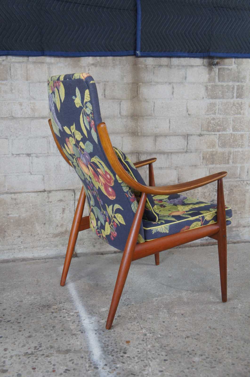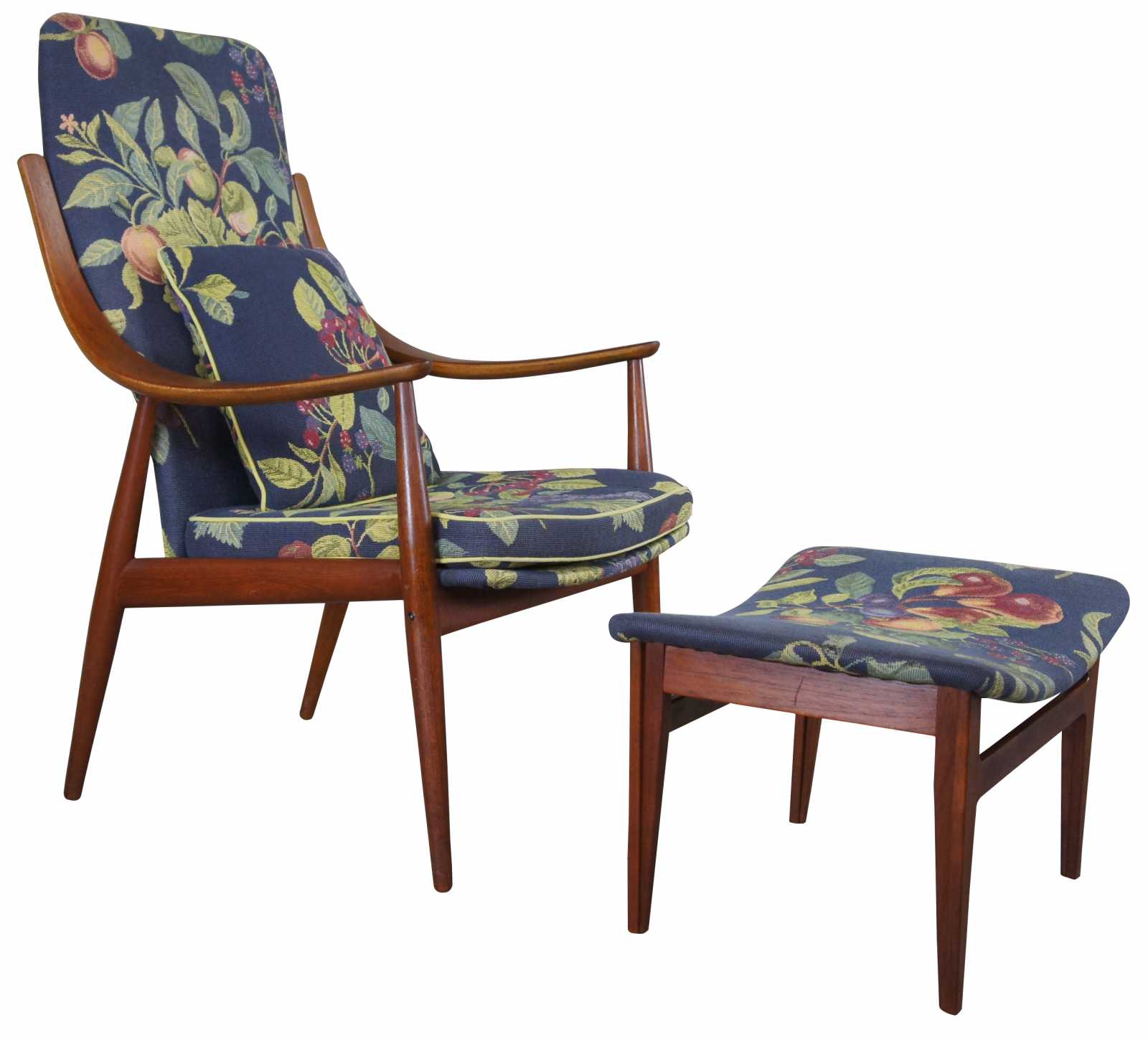 Mid century modern lounge chair and ottoman by Hvidt & Orla Mølgaard-Nielsen for John Stuart. Made of teak featuring sculptural Danish styling and a blue floral still life of fruit styled upholstery.
