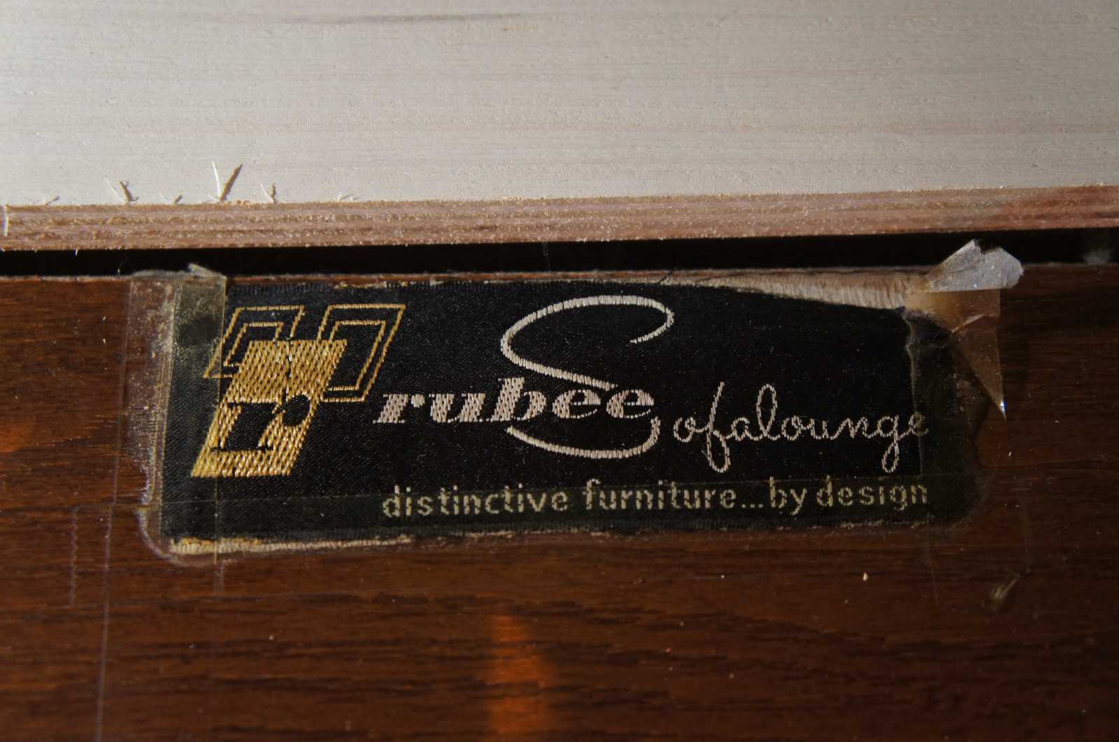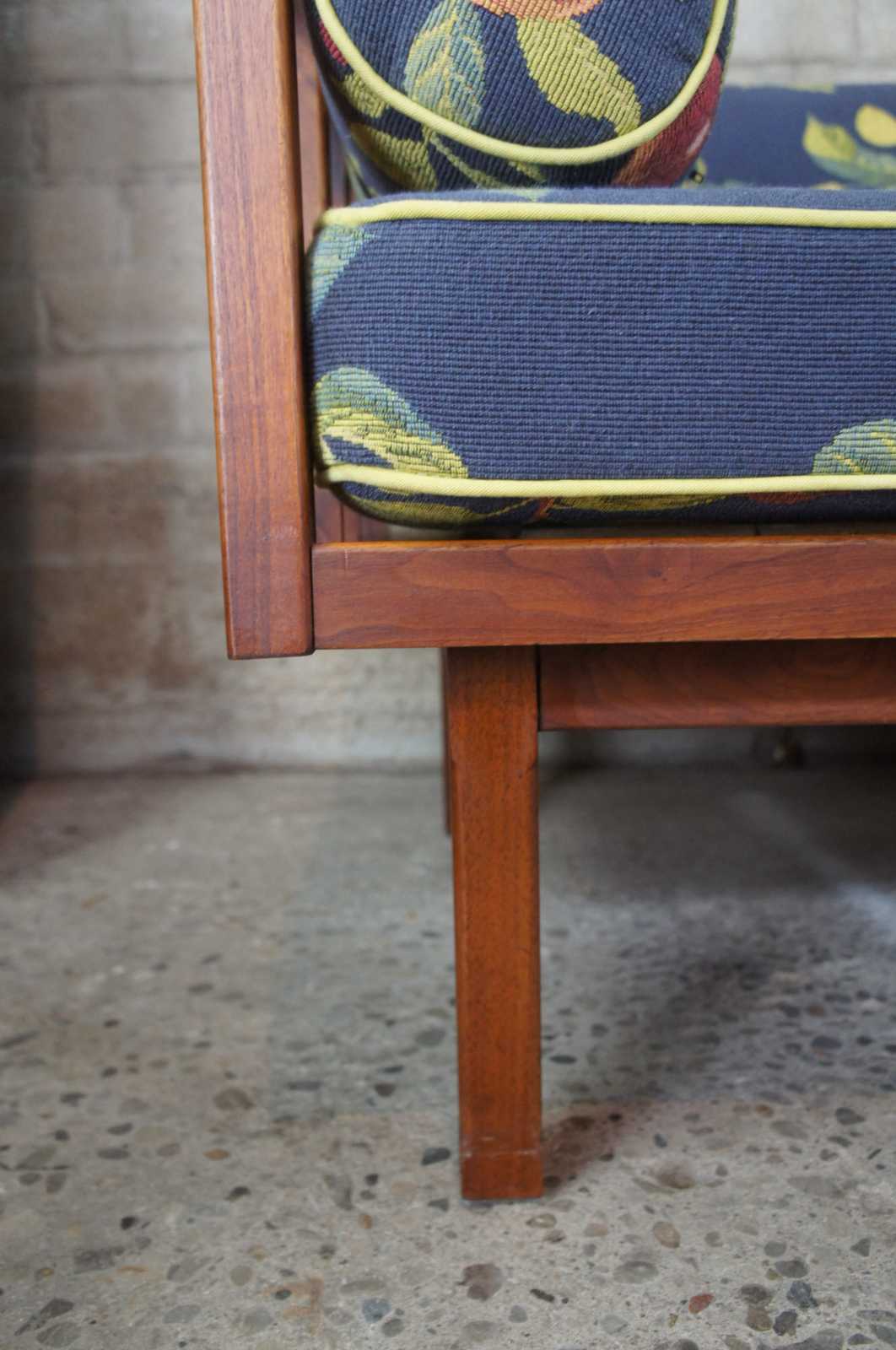 Vintage mid century lounge sofa or couch designed by John Stuart for Rubee Furniture Company of Chicago. Made of Rosewood featuring Danish styling and a blue floral still life of fruit styled upholstery.