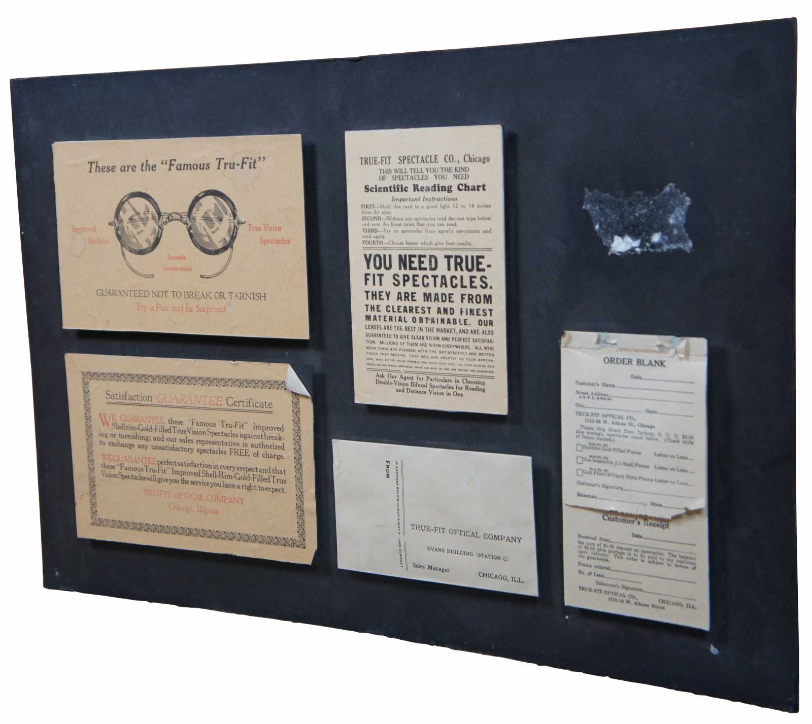 Antique assorted print advertisements and optical company ephemera for True-Fit Spectacles, mounted on cardboard.