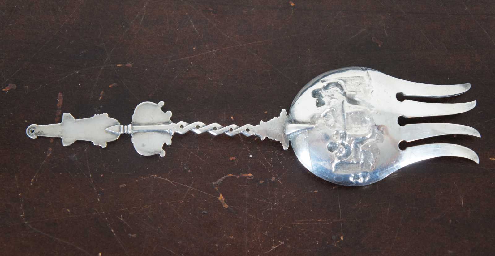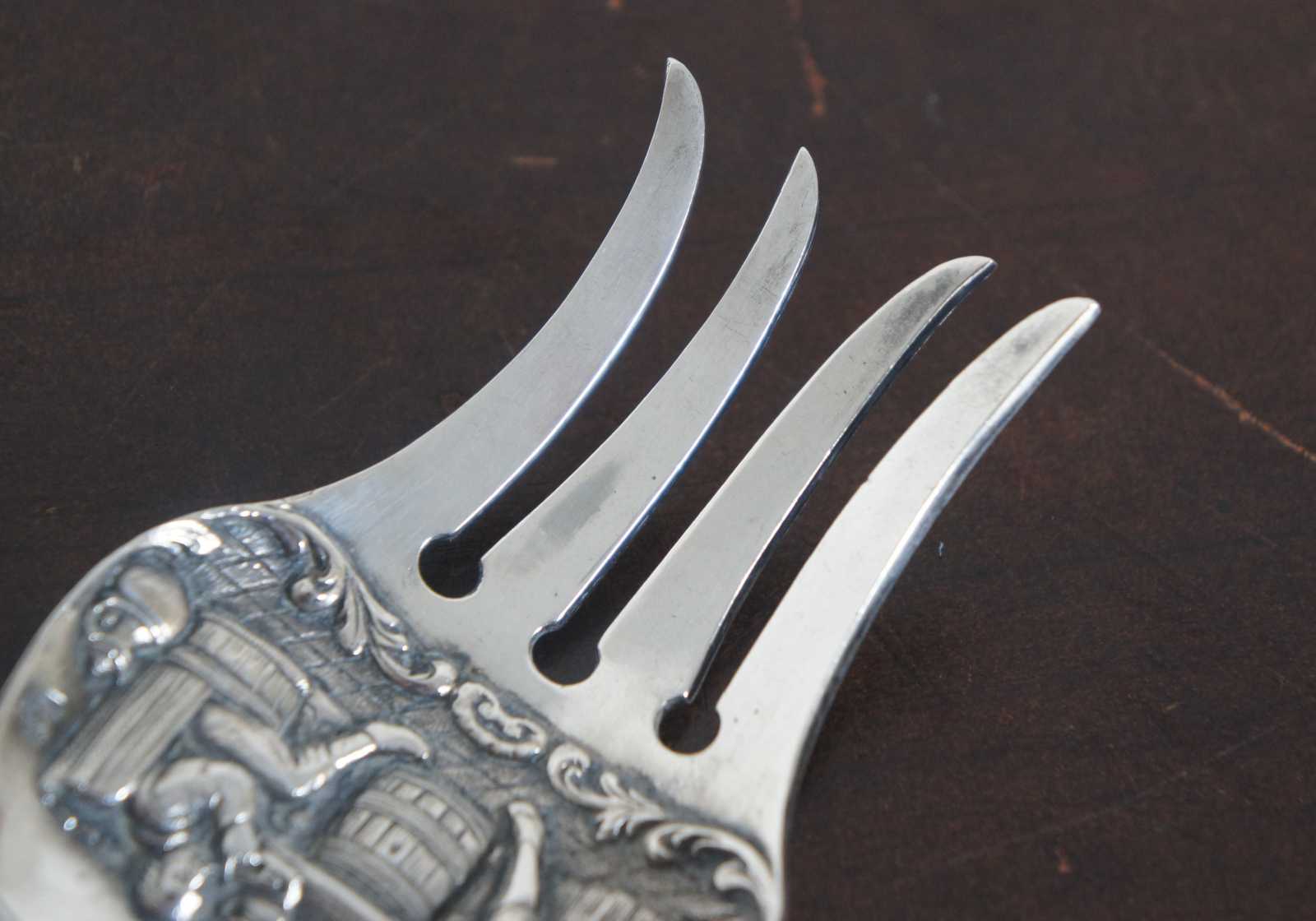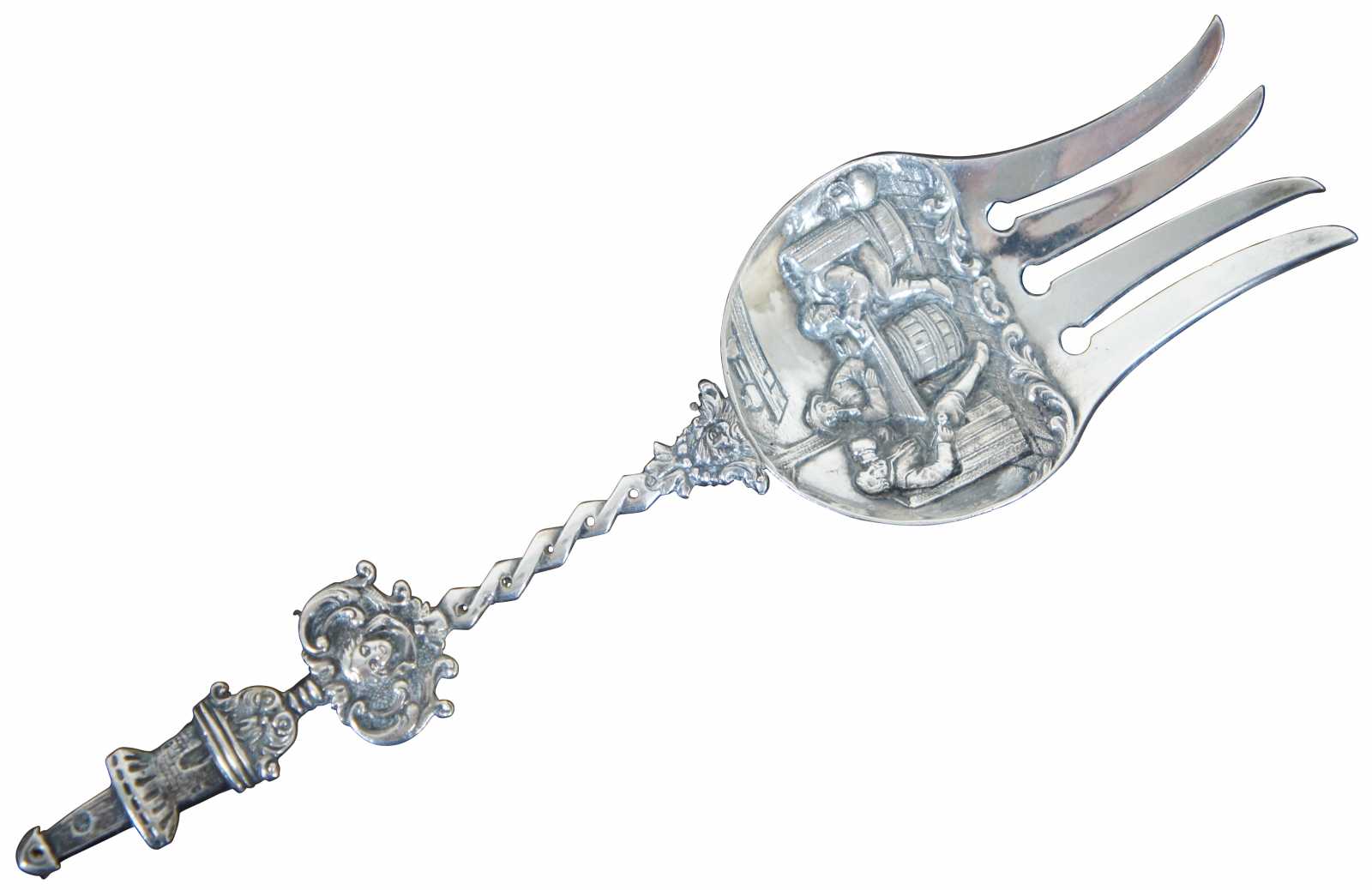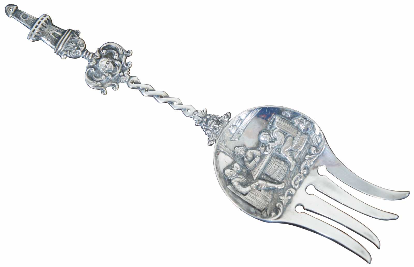 Antique German silver serving fork with a tavern scene of men drinking and smoking on the base, figural faces on each end of the handle between a twisted body, which is topped by a castle tower.