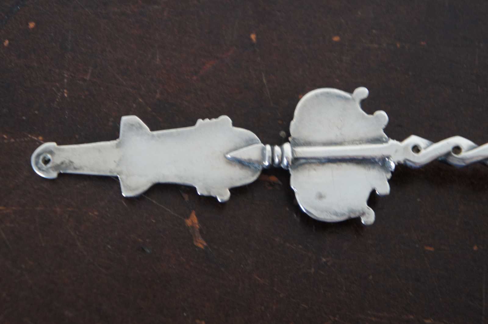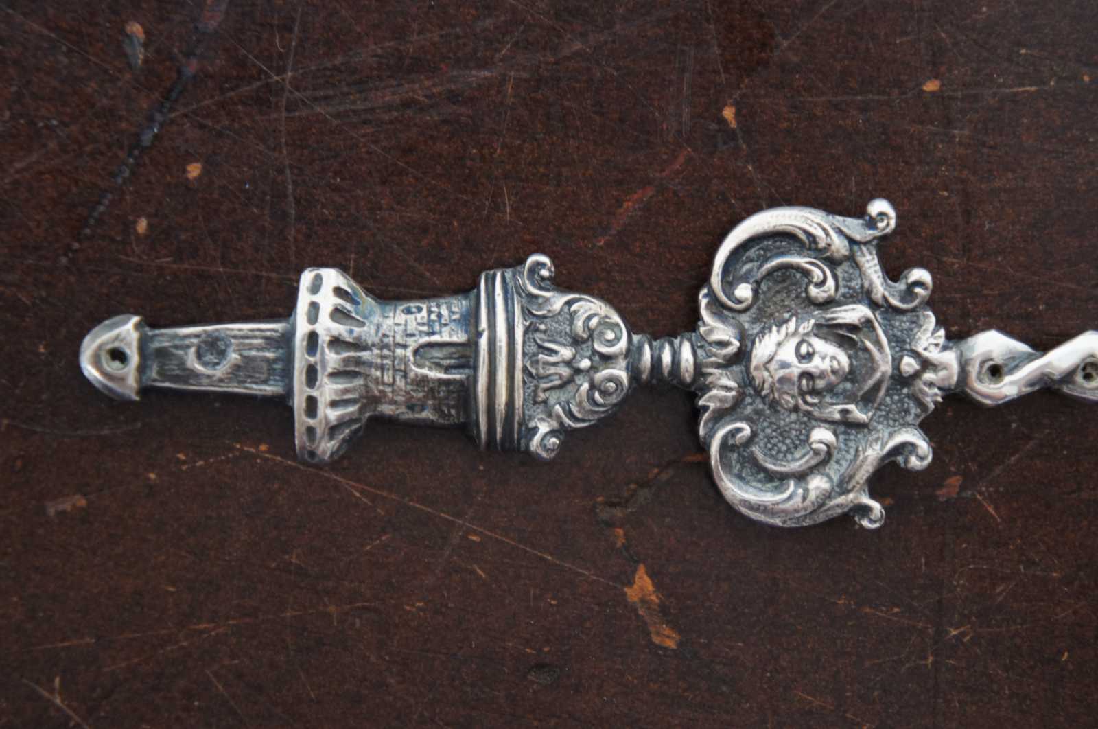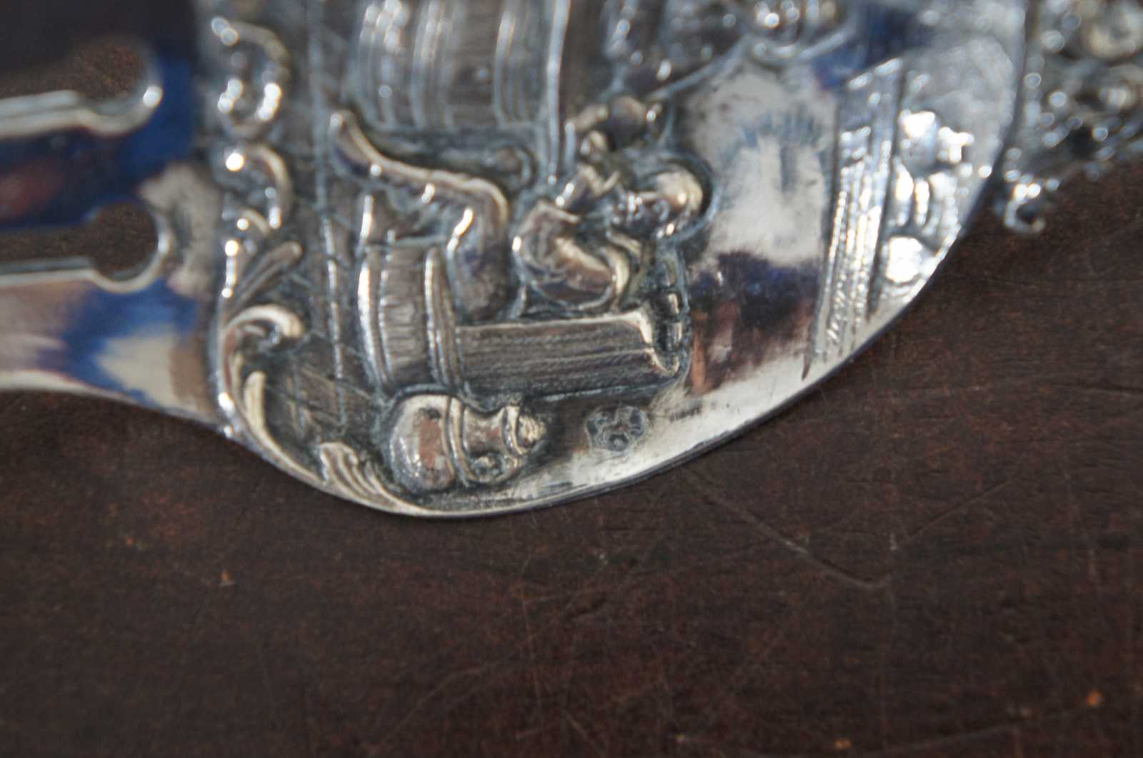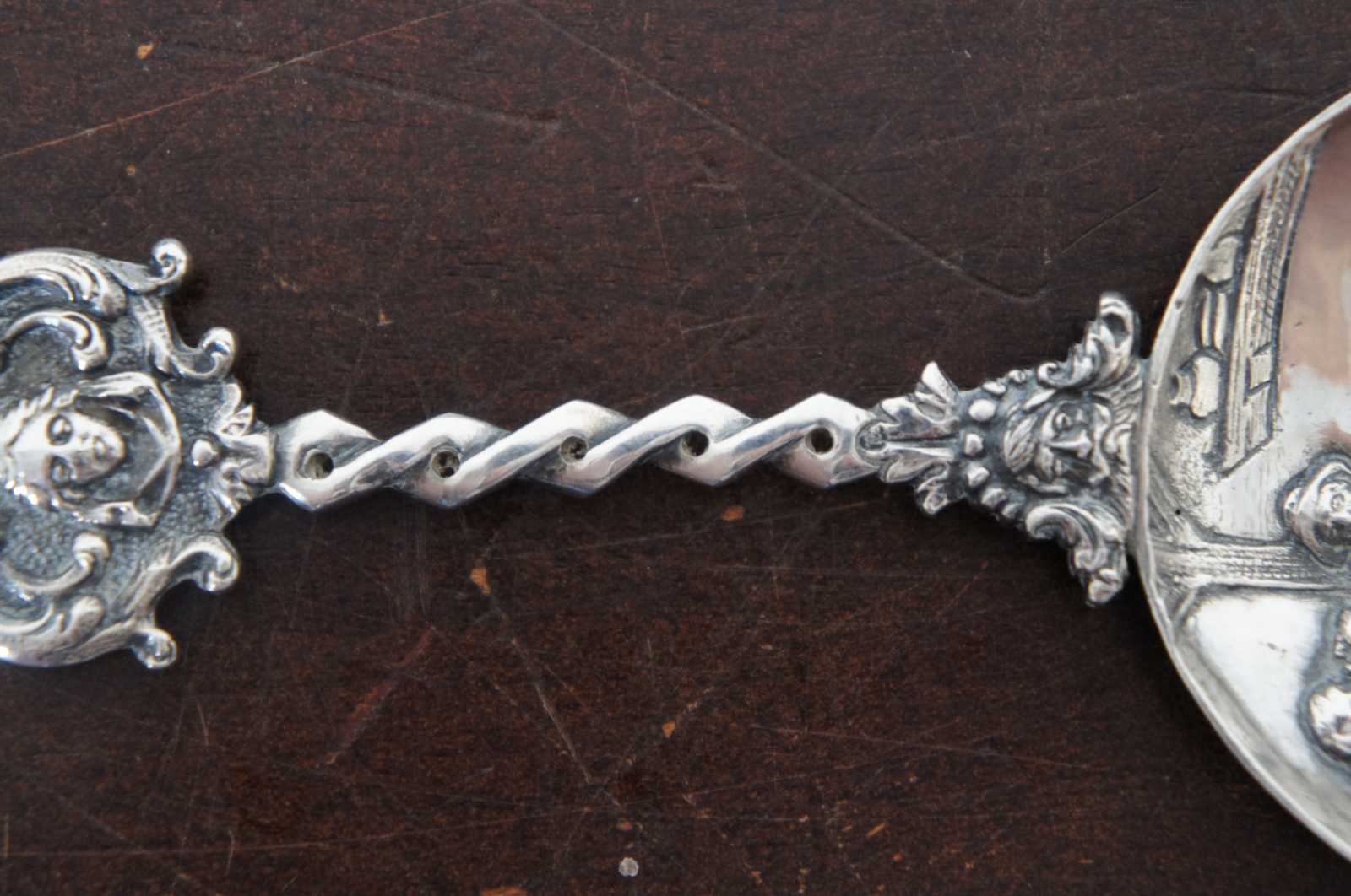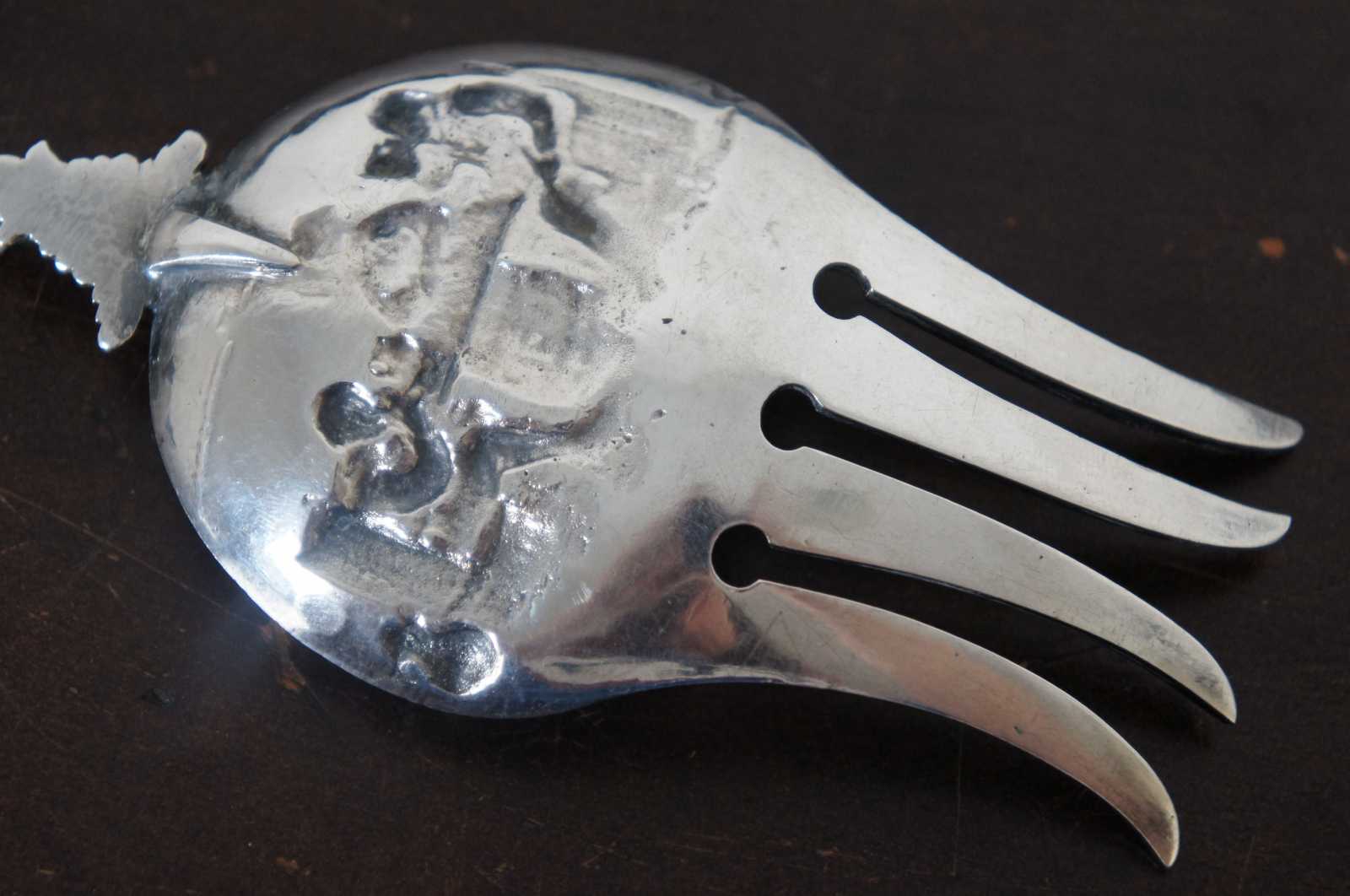 Antique German silver serving fork with a tavern scene of men drinking and smoking on the base, figural faces on each end of the handle between a twisted body, which is topped by a castle tower.