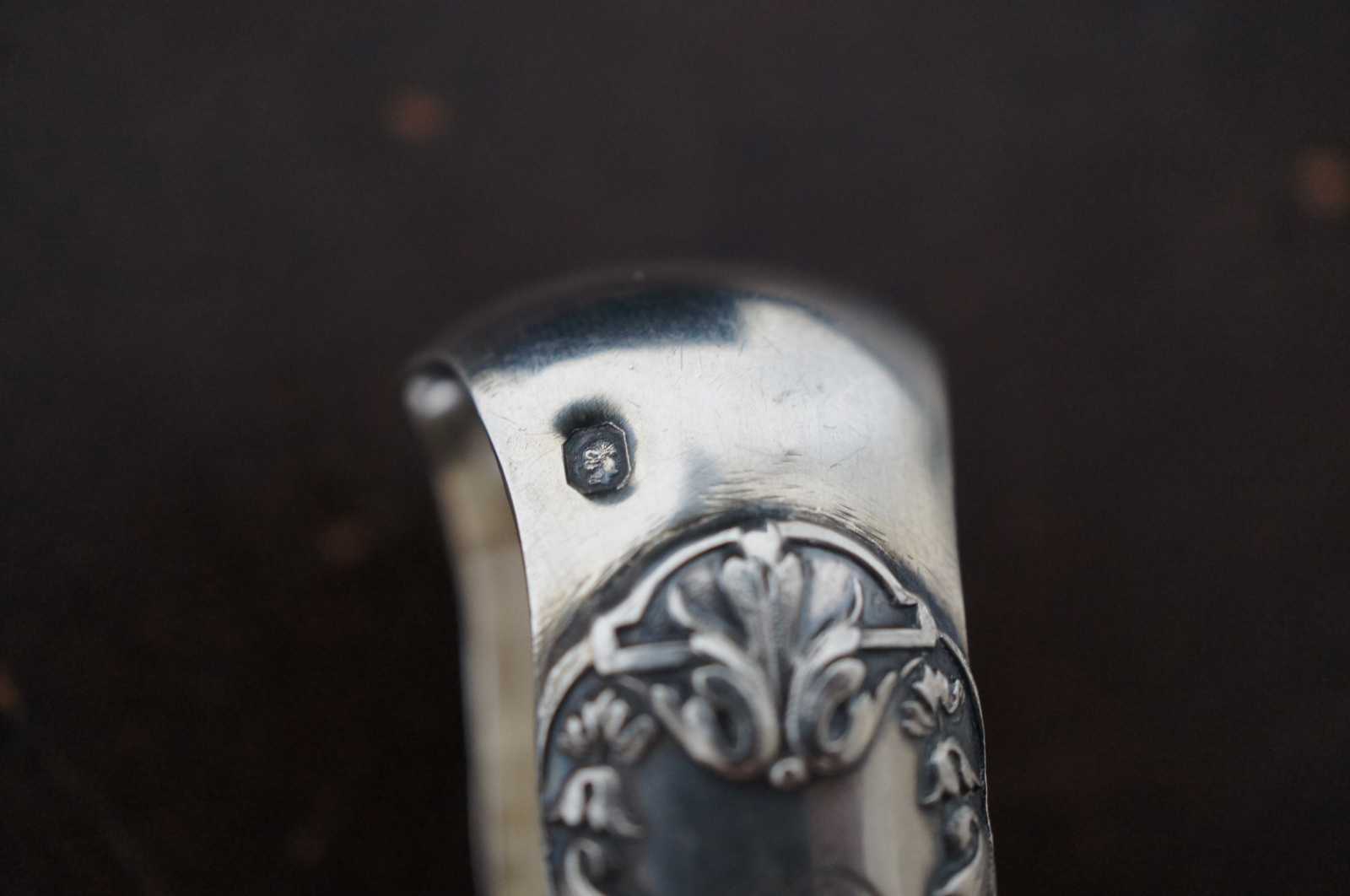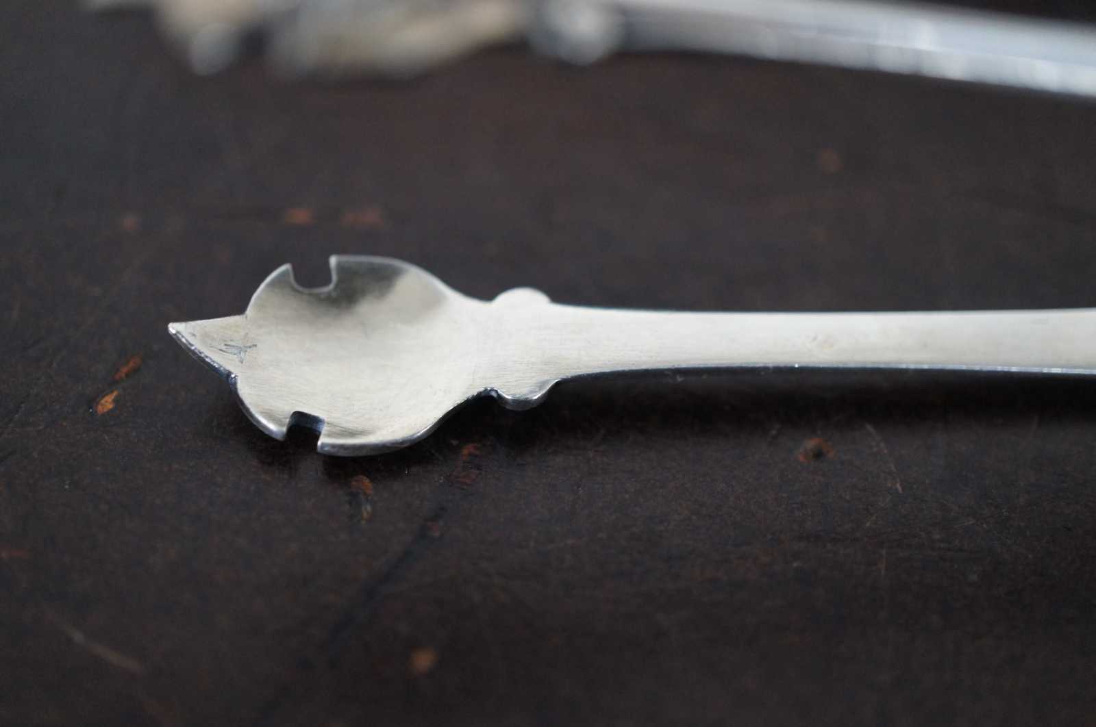 Antique sterling silver sugar tongs monogrammed with a D and stamped with a European Diana Head Minerva fineness mark.