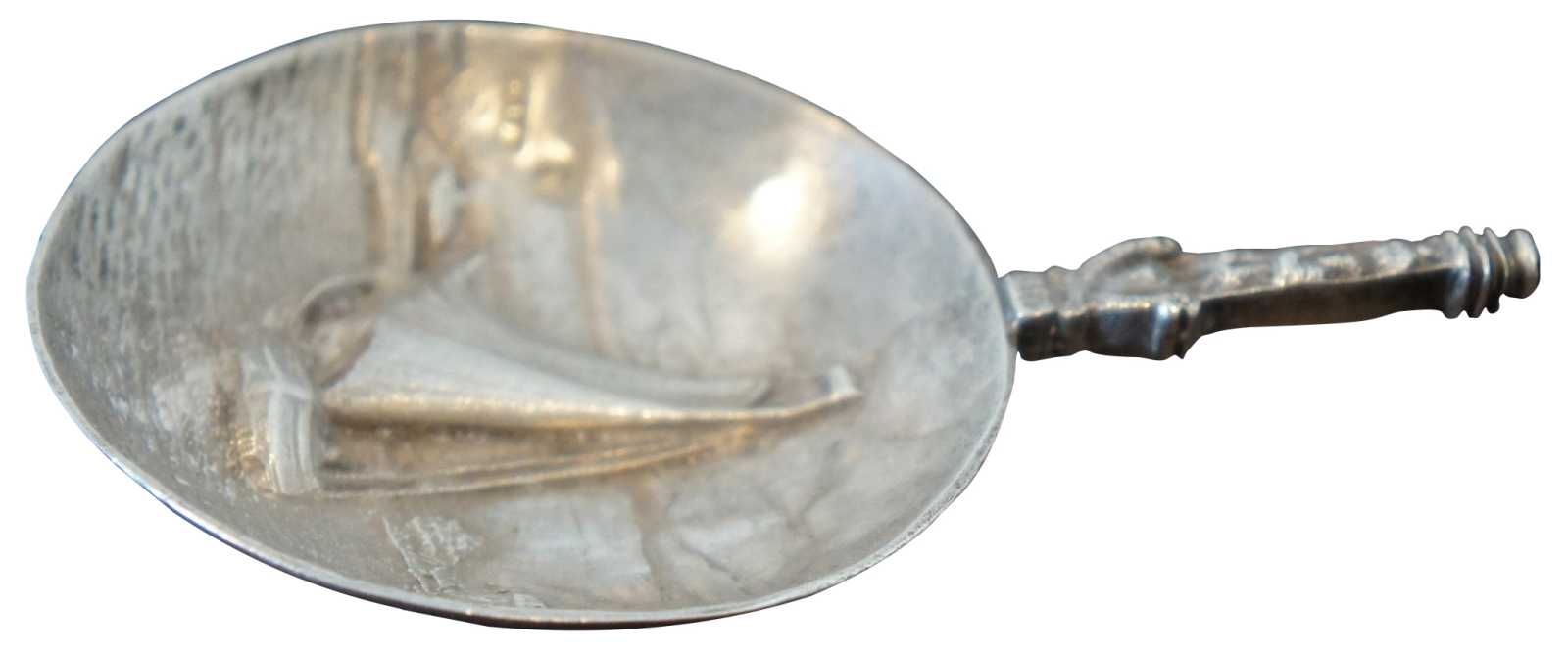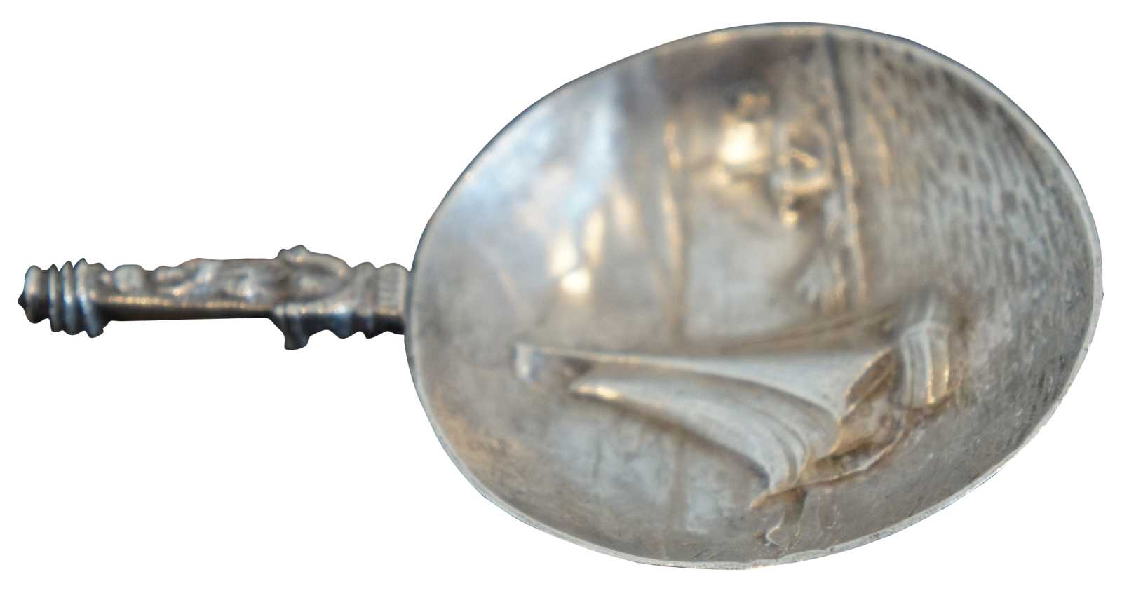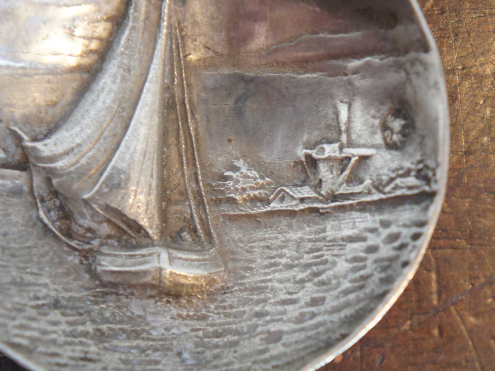 Antique Dutch sterling silver spoon bowl with a relief scene of a sailboat on the water with cottages and a windmill in the background.