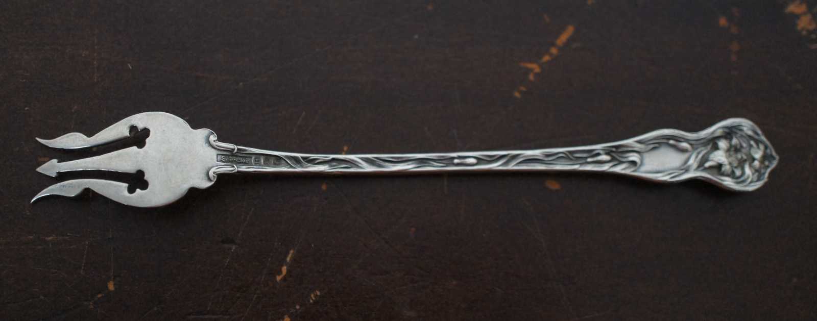 Antique sterling silver cocktail fork by Watson in the Lily pattern. The origin of the firm traces back to 1874 when was formed in Attleboro, MA, the Cobb, Gould & Co. The founders were Clarence L. Watson, Fred Newell, Charles Cobb, Samuel Gould and W.A. Battey.