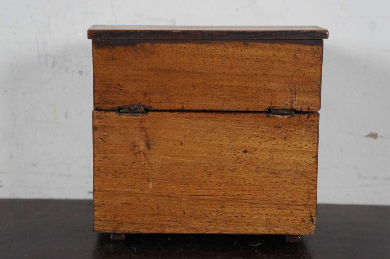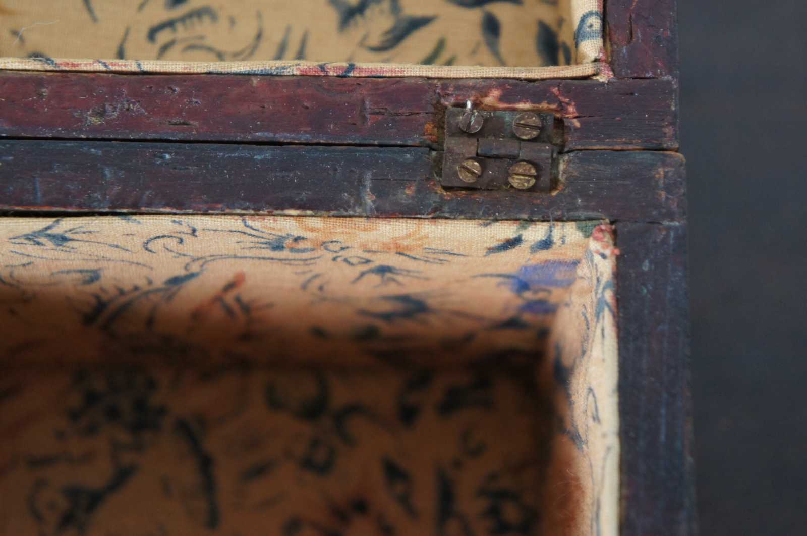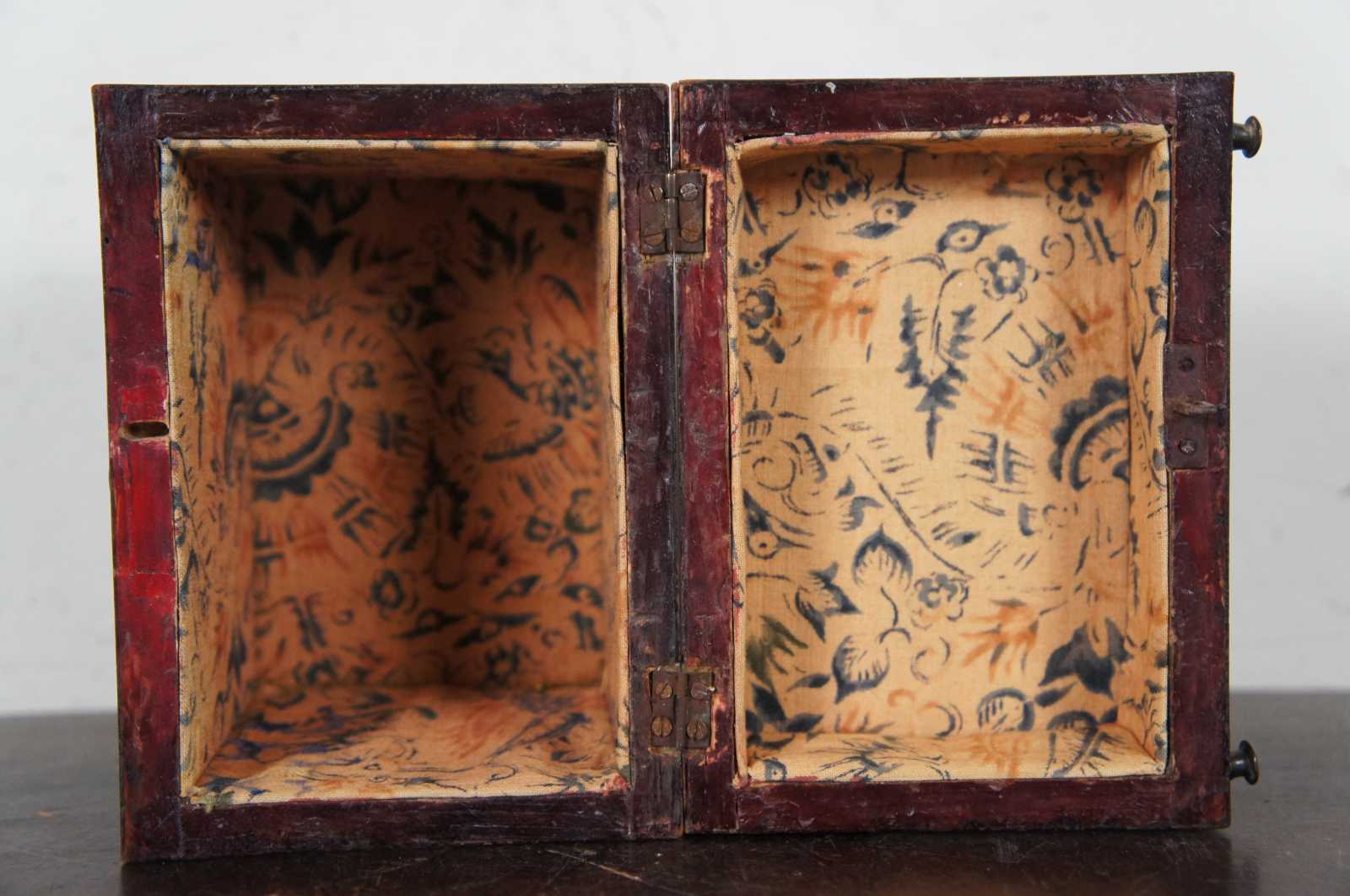 Antique mahogany trinket box with a half domed lid, decorative lock, and lined in floral cloth.
