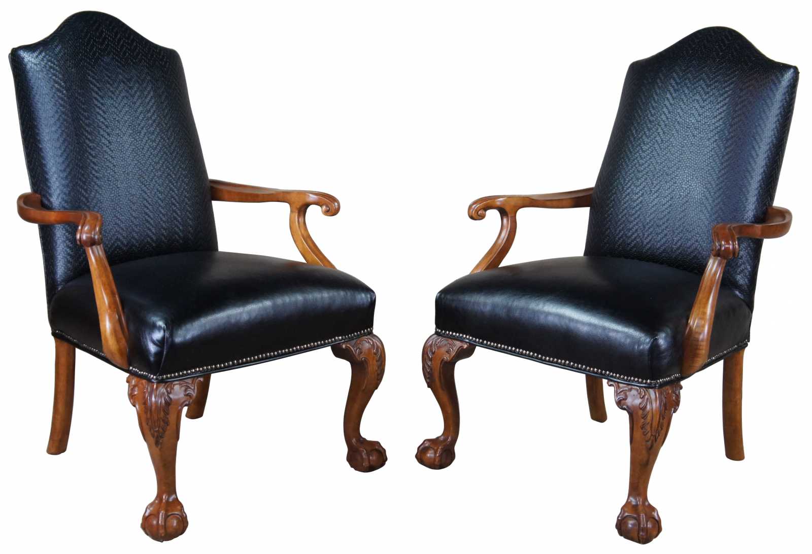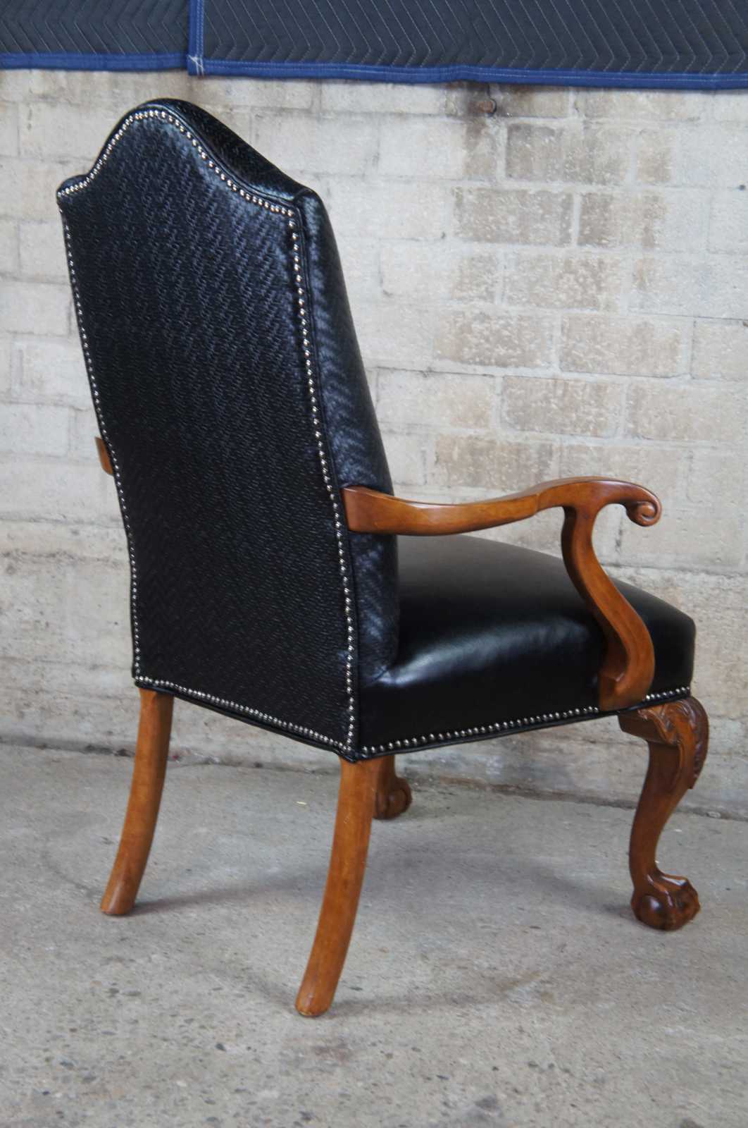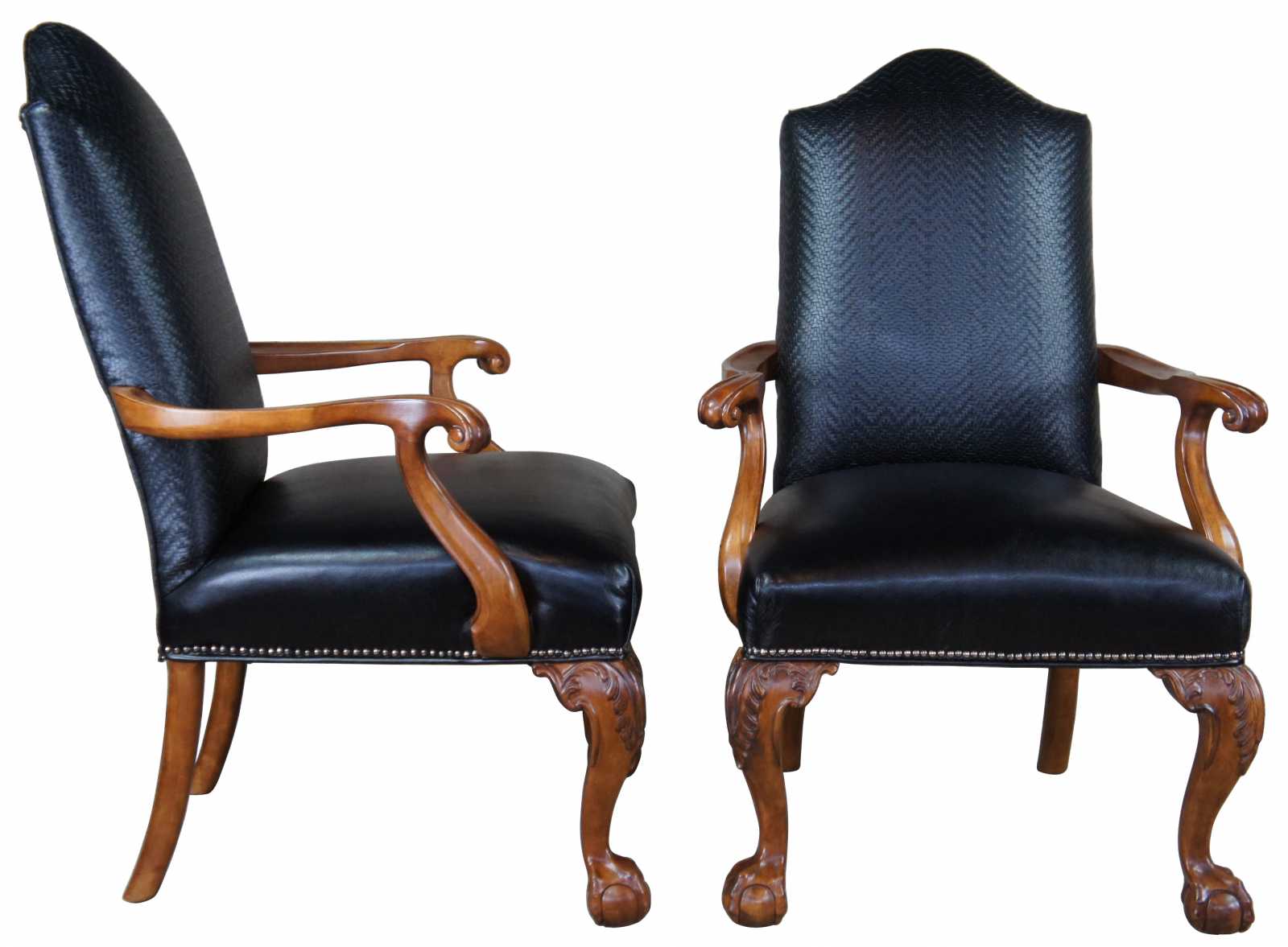 Set of two vintage Century Furniture arm chairs. Featuring ball and claw feet and upholstered in black leather with woven herringbone pattern and nailhead trim.