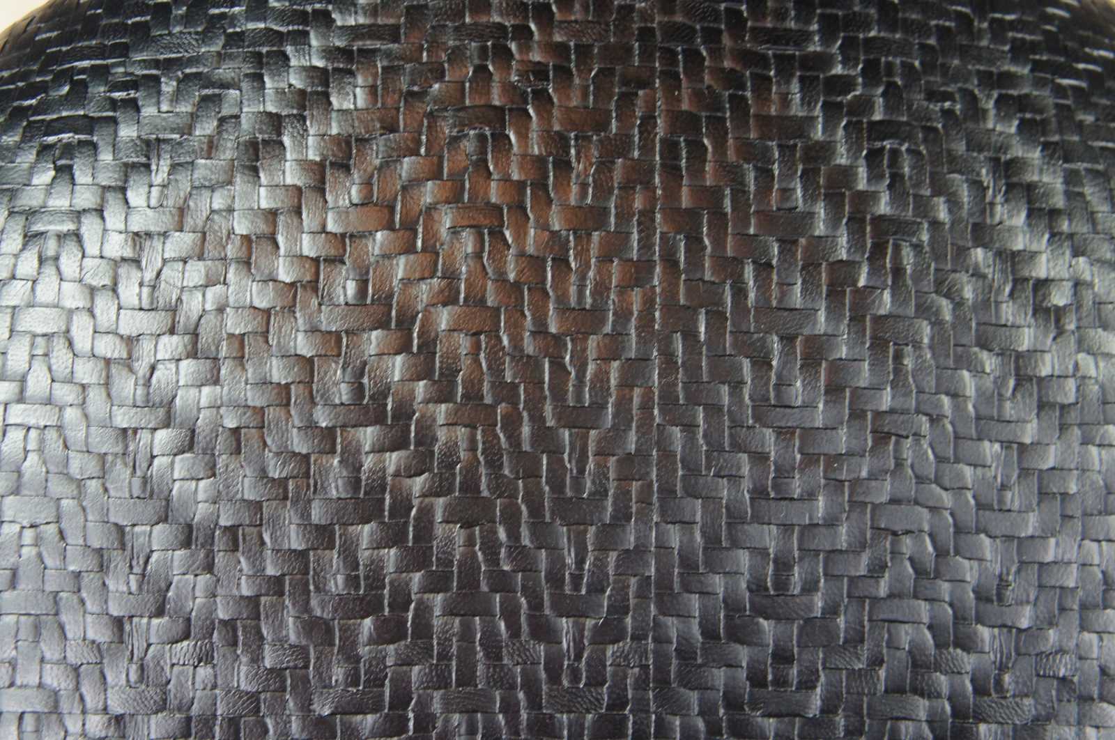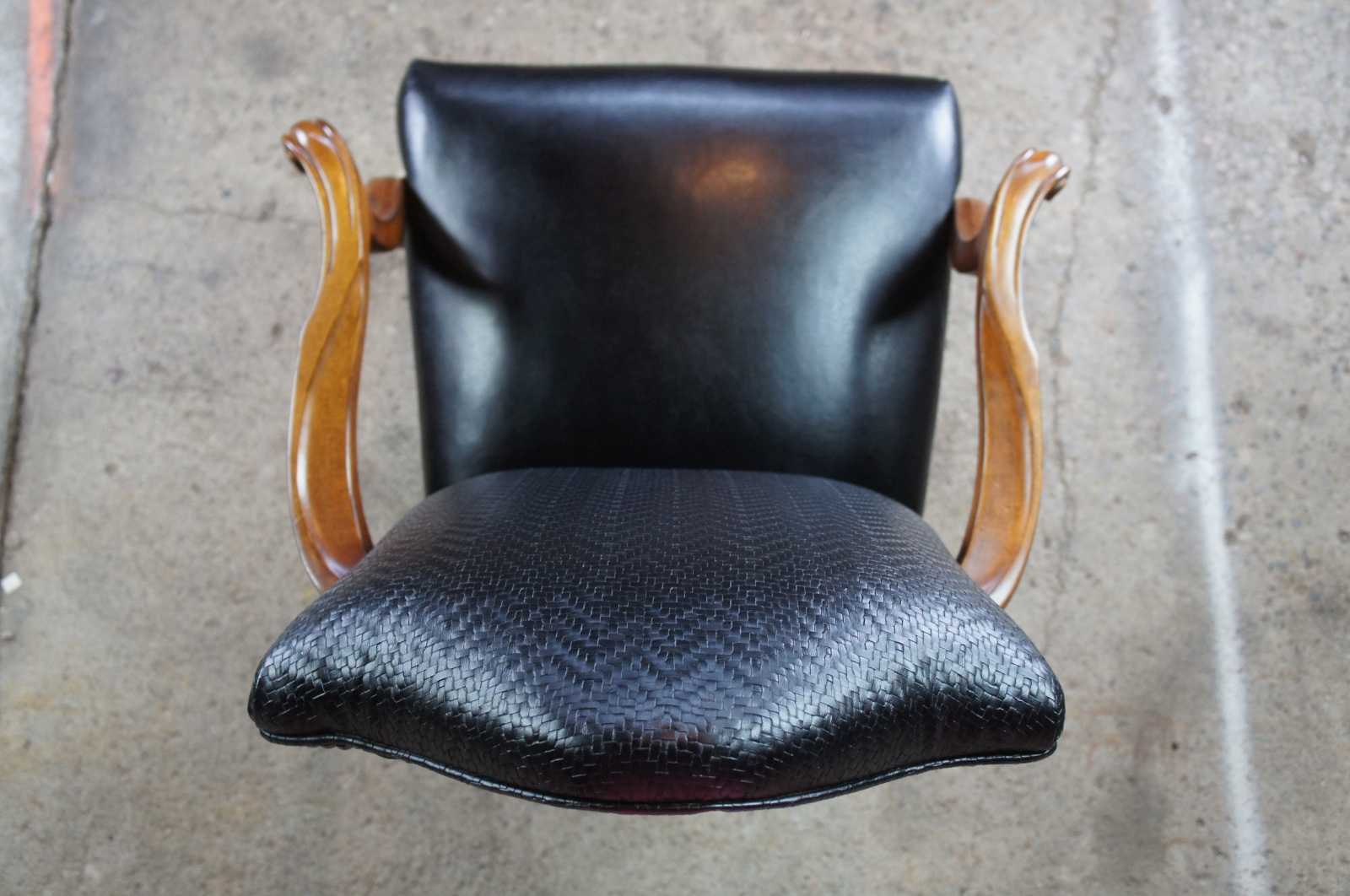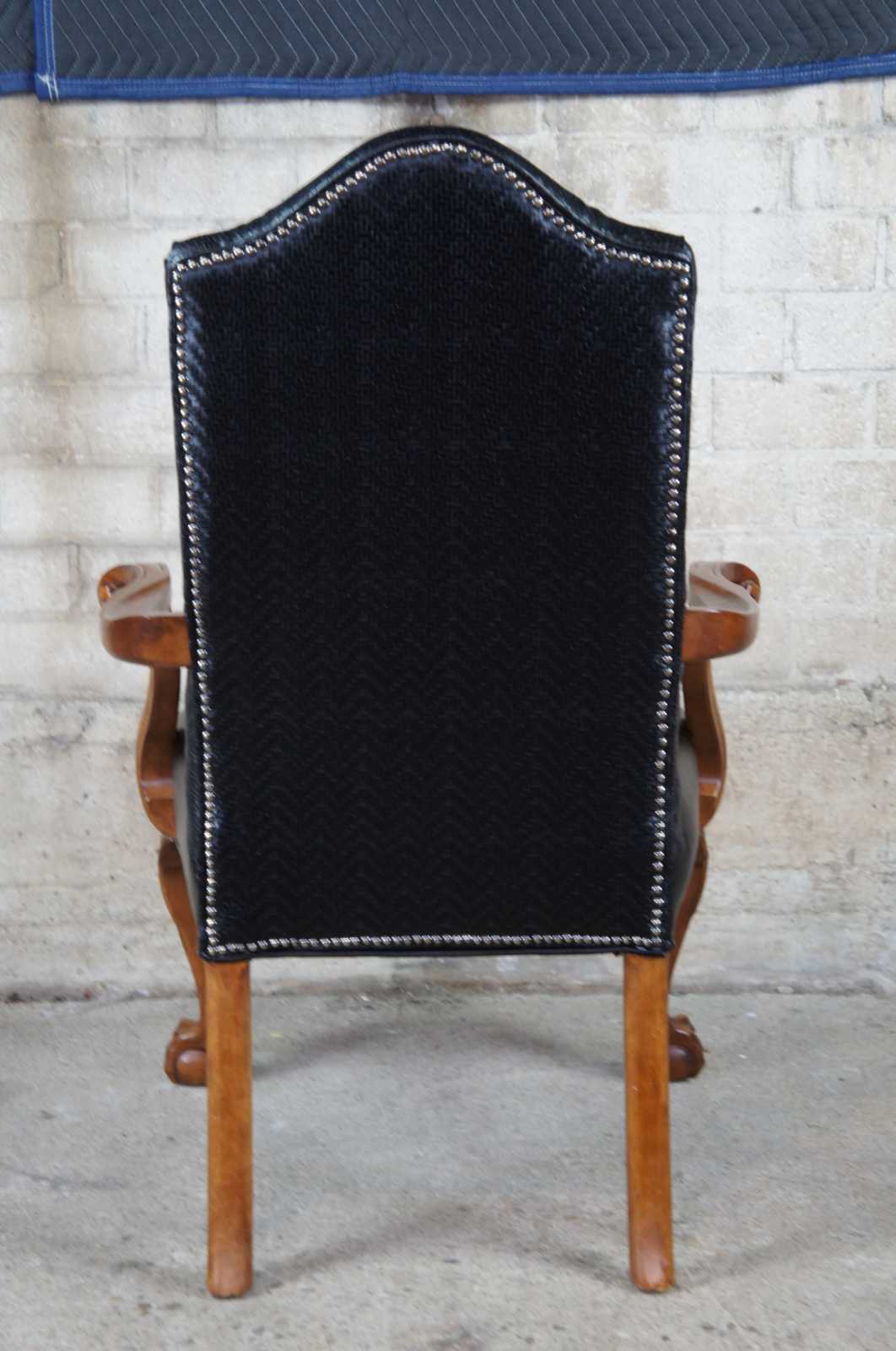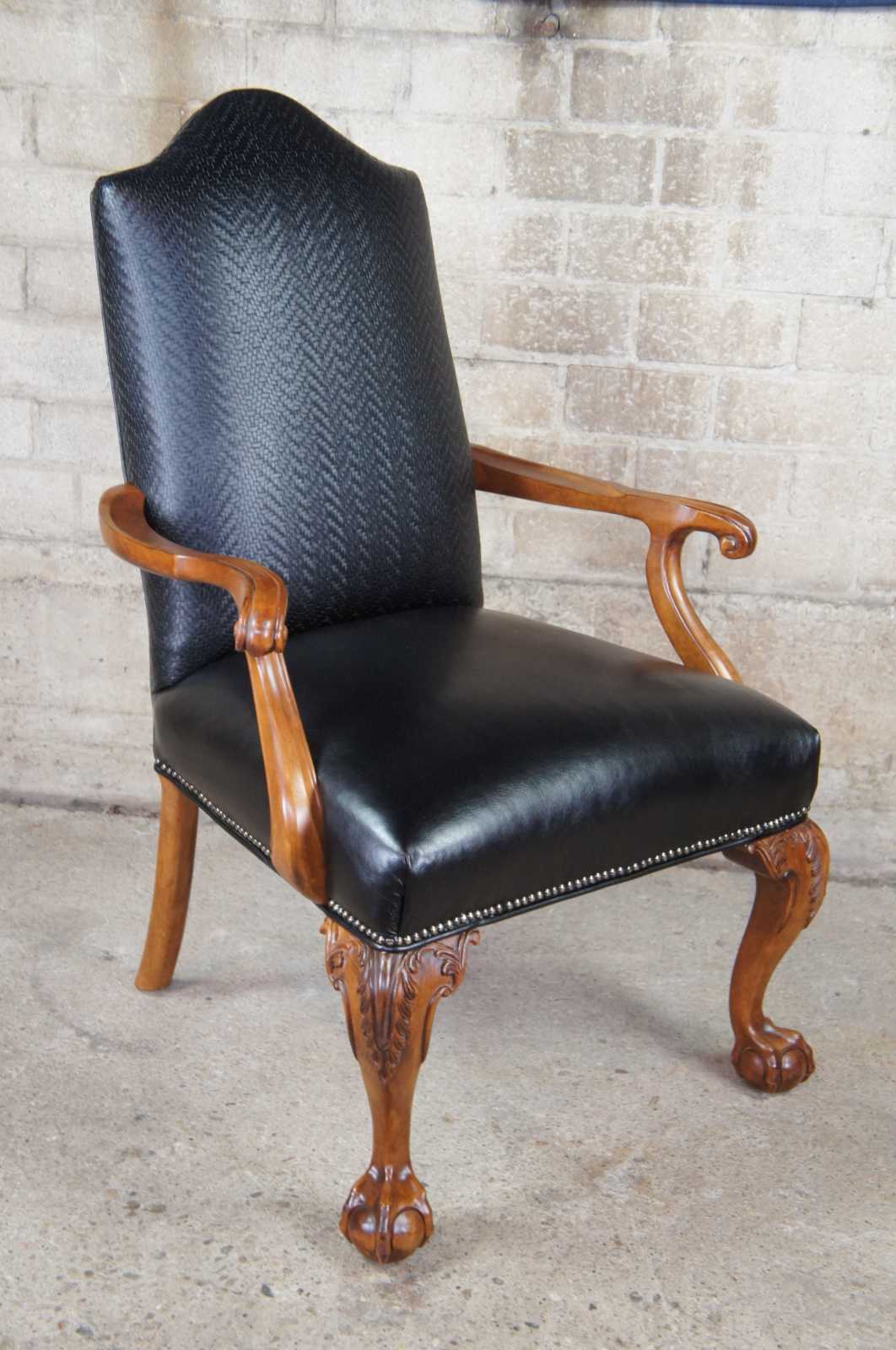 Set of two vintage Century Furniture arm chairs. Featuring ball and claw feet and upholstered in black leather with woven herringbone pattern and nailhead trim.