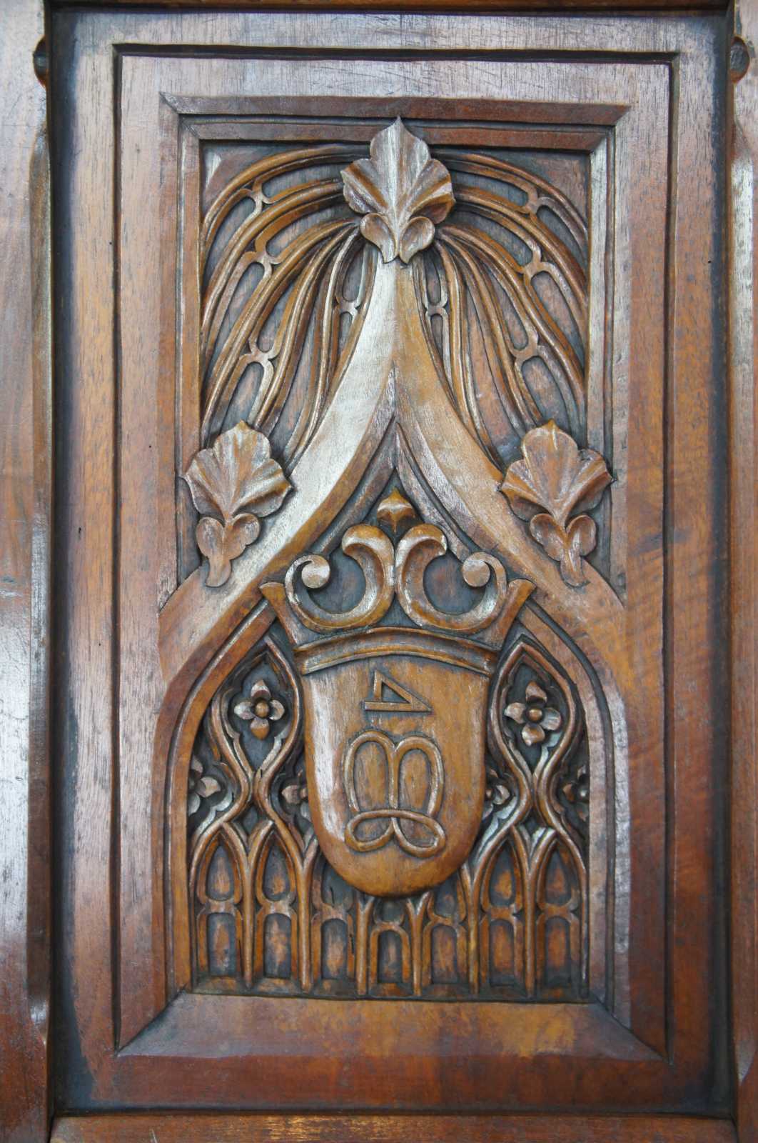 Antique English Gothic Revival court cupboard or secretary desk, circa late 1800s. Made of Quartersawn Oak featuring figural columns, panelled siding and an arched pierced apron. The two doors are heavily detailed with an embowed design, crest and ornate iron hardware. Opens to a pull out writing surface, shelf and upper cuby with drawer.