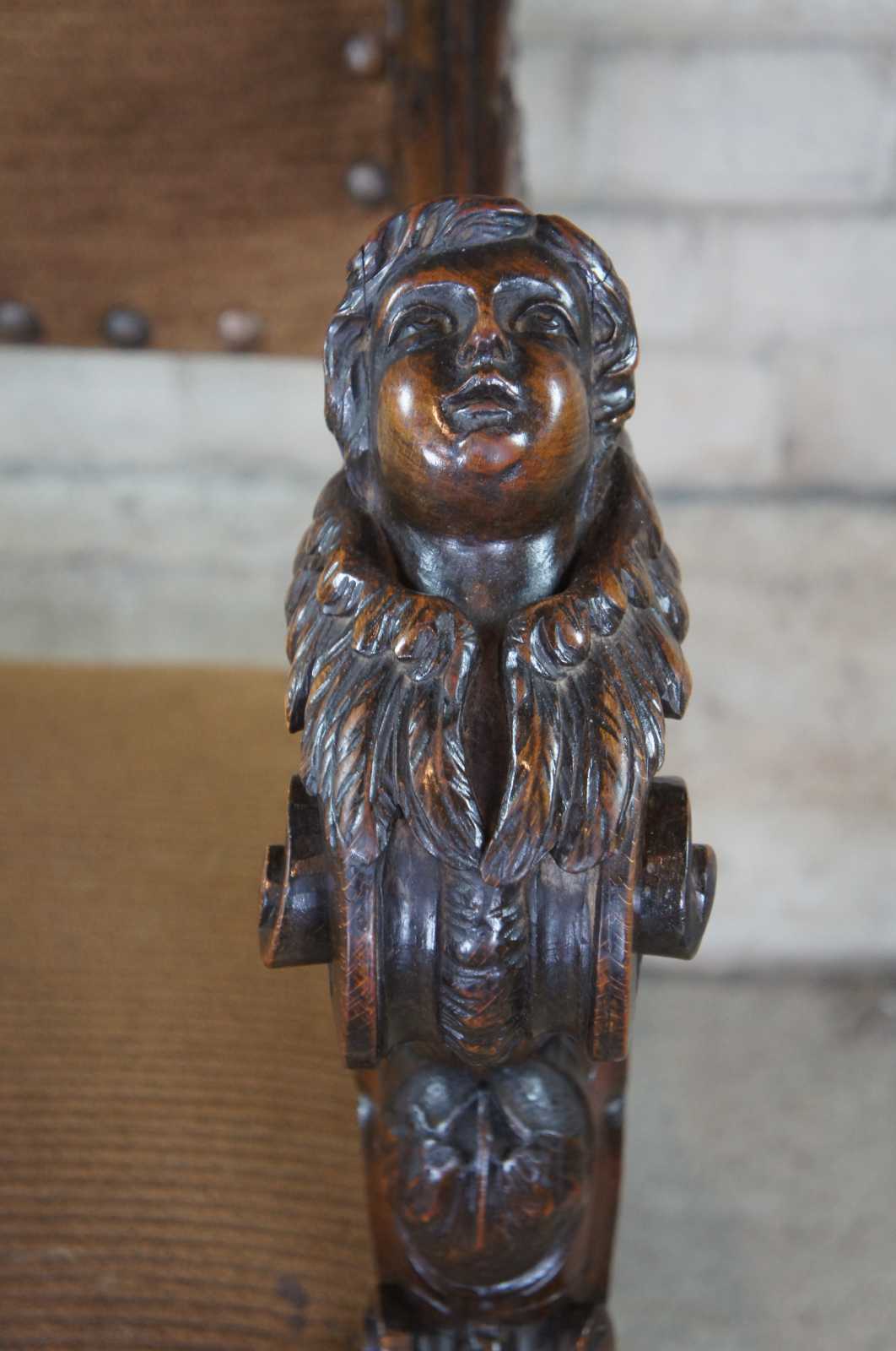 Monumental 19th Century Italian Renaissance Old World Throne Chair. Made from oak with meticulously caved detail. Features scrolled arms topped with figural cherubs and acanthus leaves. Upholstered in beige with button tufting.