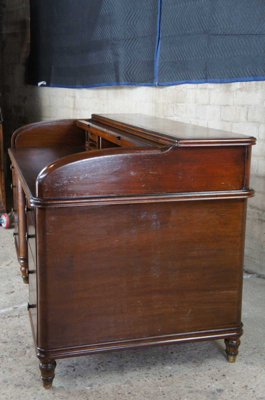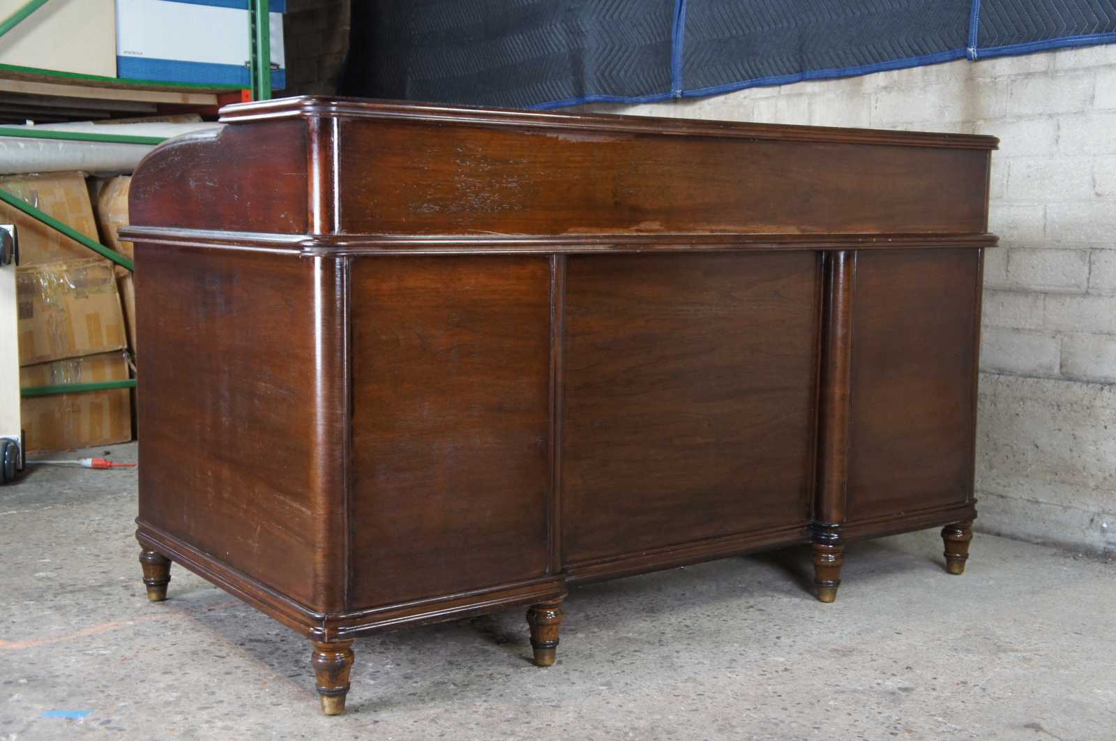 Antique Stow Davis roll top executive desk, circa 1920s. Made of walnut featuring a "C" curve roll top which opens to multiple cubbies and slots, over a kneehole flanked by multiple drawers, pull out work surfaces and eight turned legs capped by brass feet.