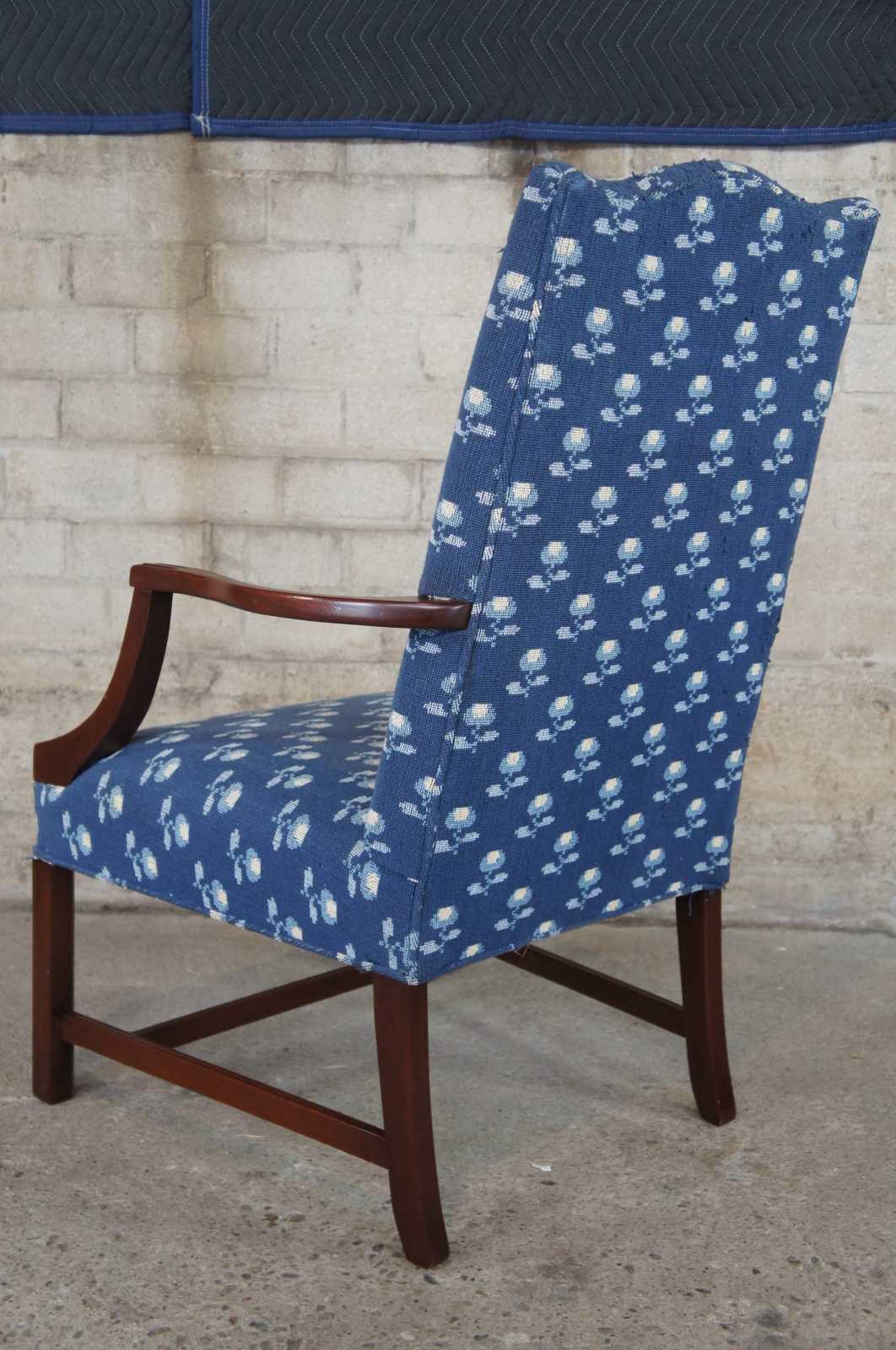 Set of 8 Hickory Chair James River dining chairs featuring two arms and six sides. The Martha Washington armchairs feature fluted, straight Chippendale legs, hallmark receding arm posts, and characteristic shaped crest rail. While the side chairs feature fluted, straight Chippendale legs, nailhead trim and interwoven pierced splat.