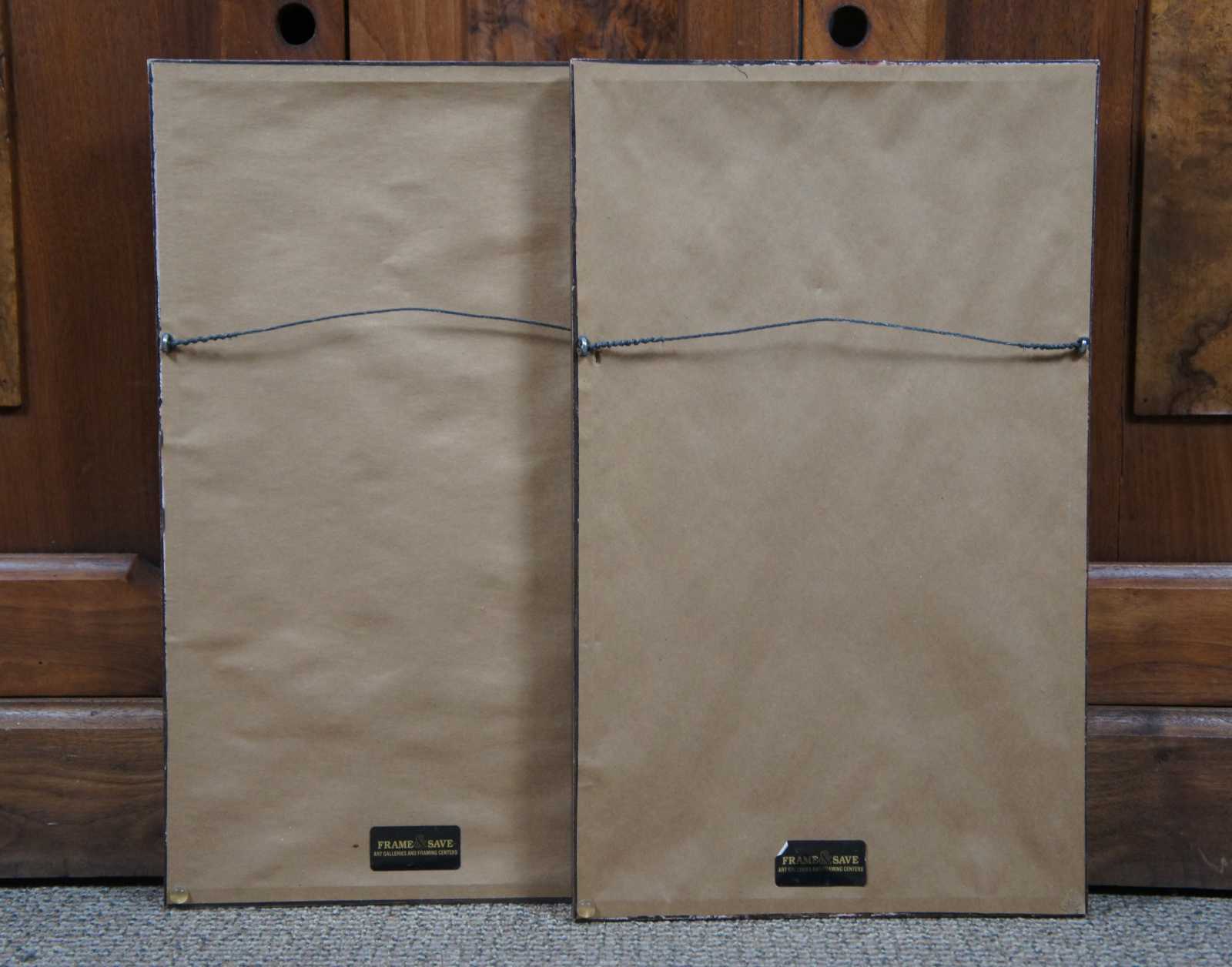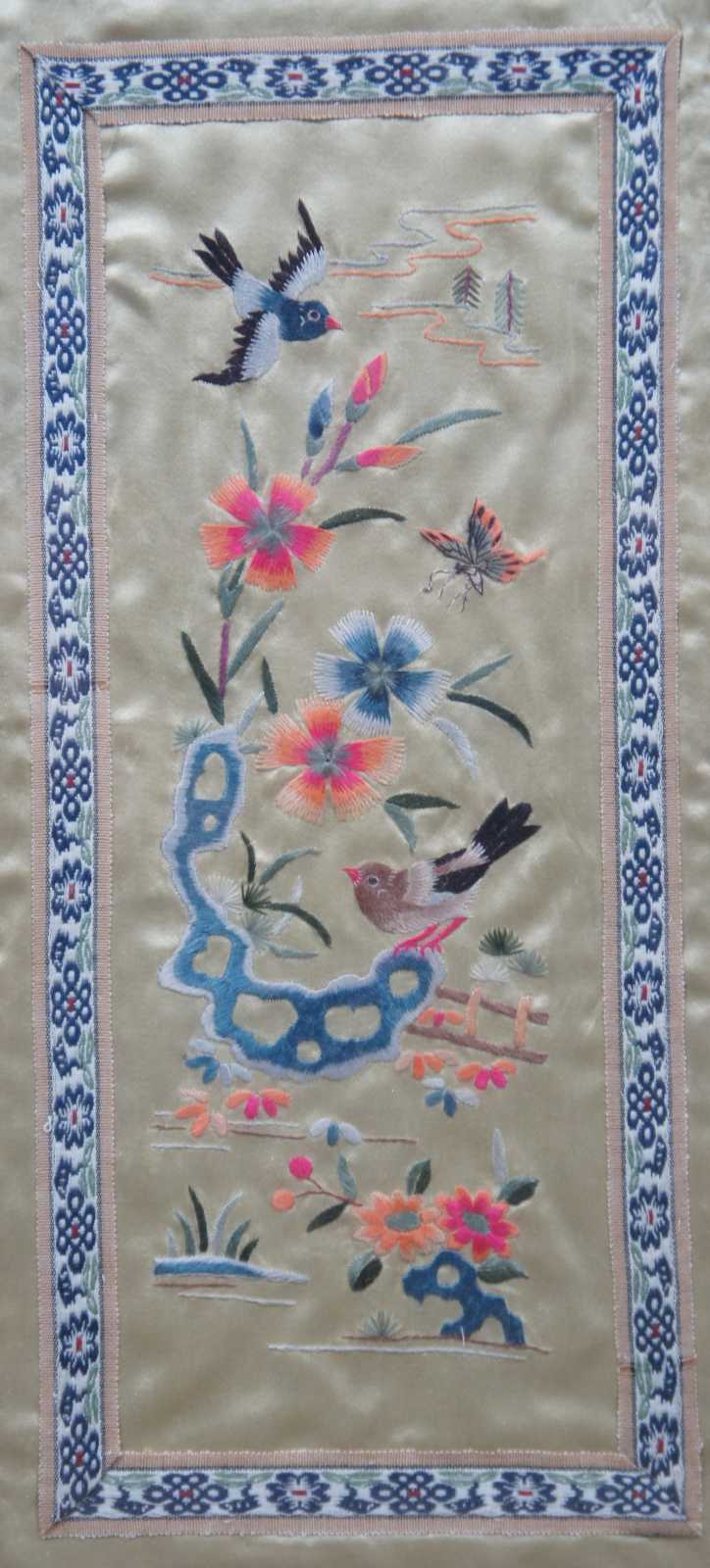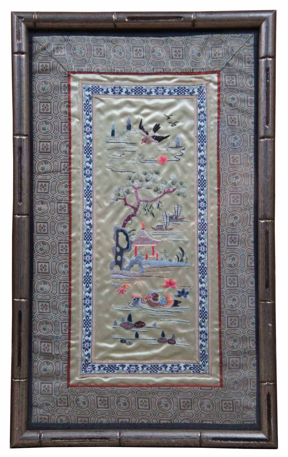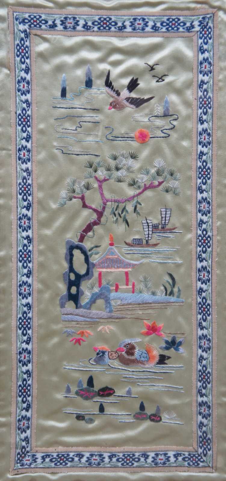 Pair of framed hand embroidered Chinese tapestries on gold silk, showing birds, flowers, nautical boats and pagoda / cottages.