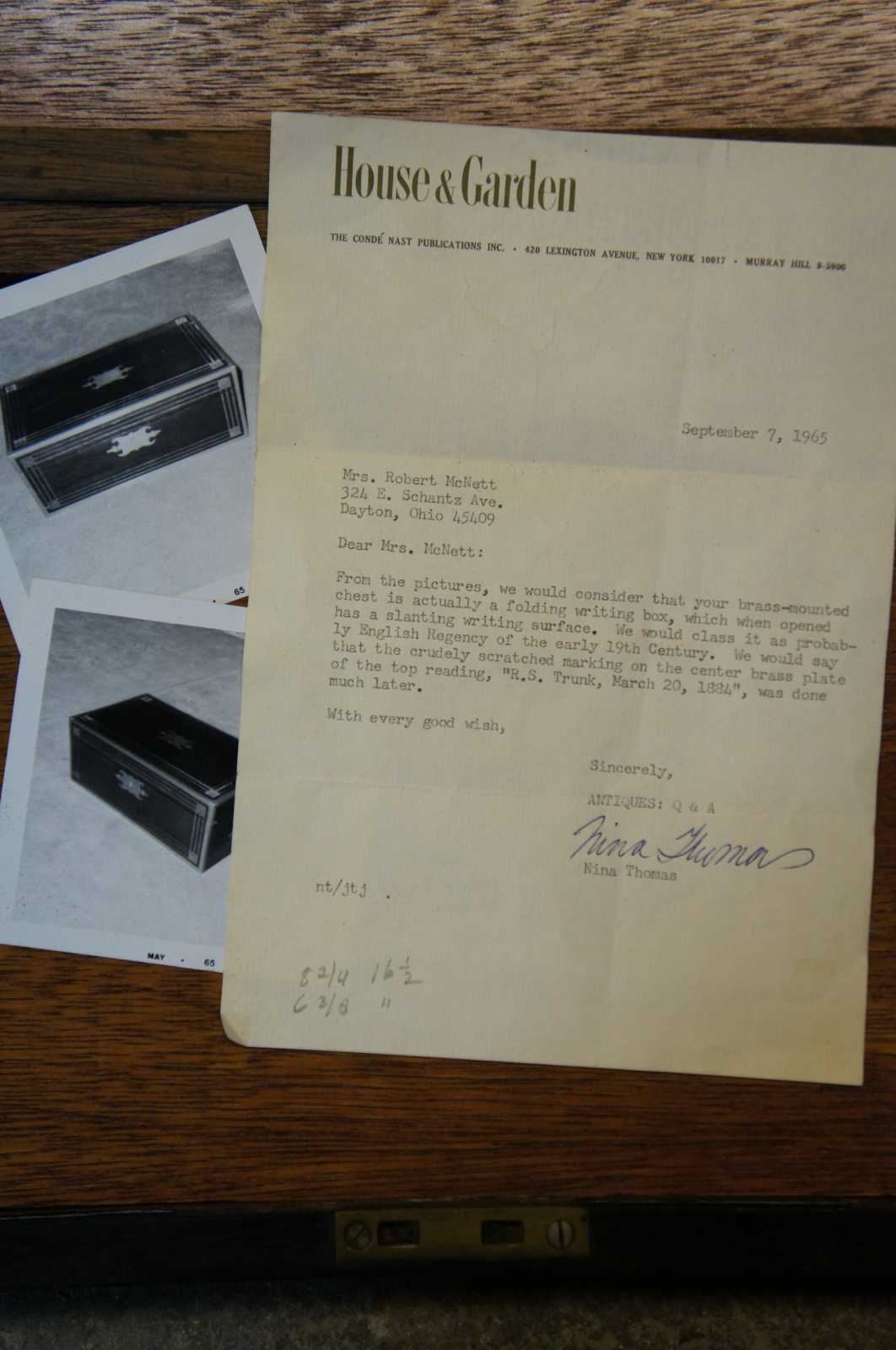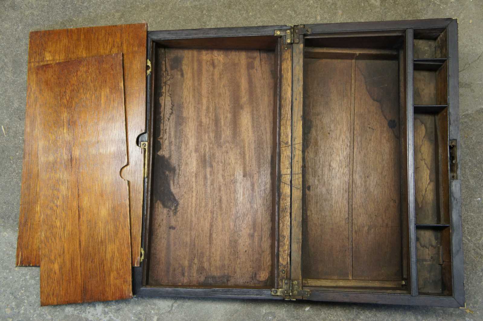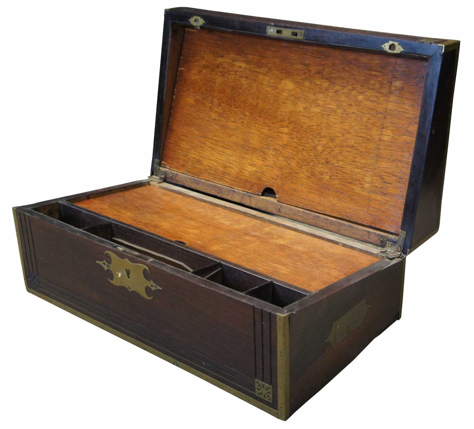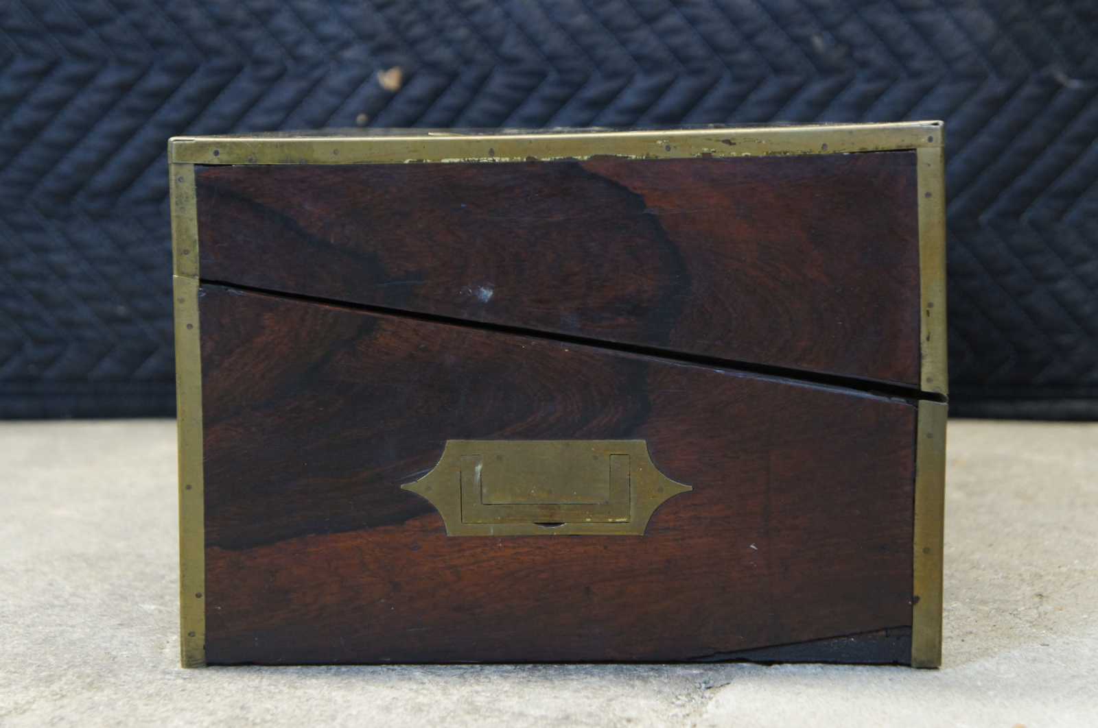 Antique early 19th century writing slope/storage chest, made of rosewood with brass hardware and inlays.