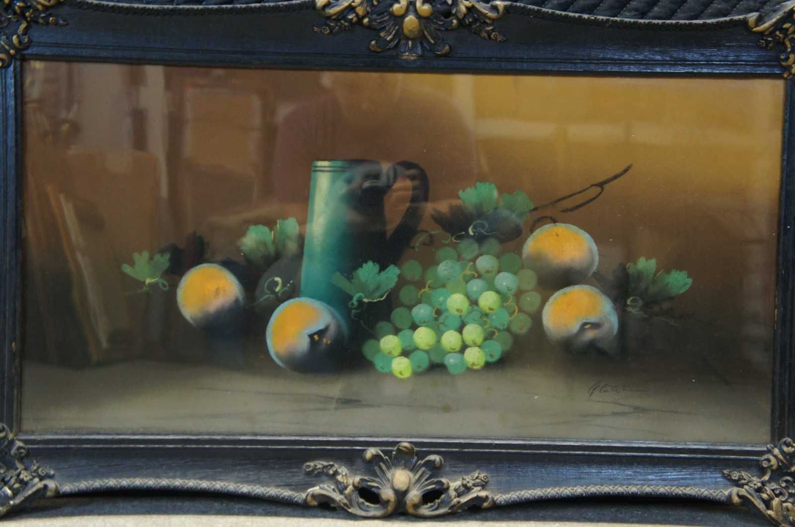 Albert Glatthaar pastel painting of a still life with peaches, grapes and a tankard, in a black and gold carved frame; signed by the artist in the lower right.
